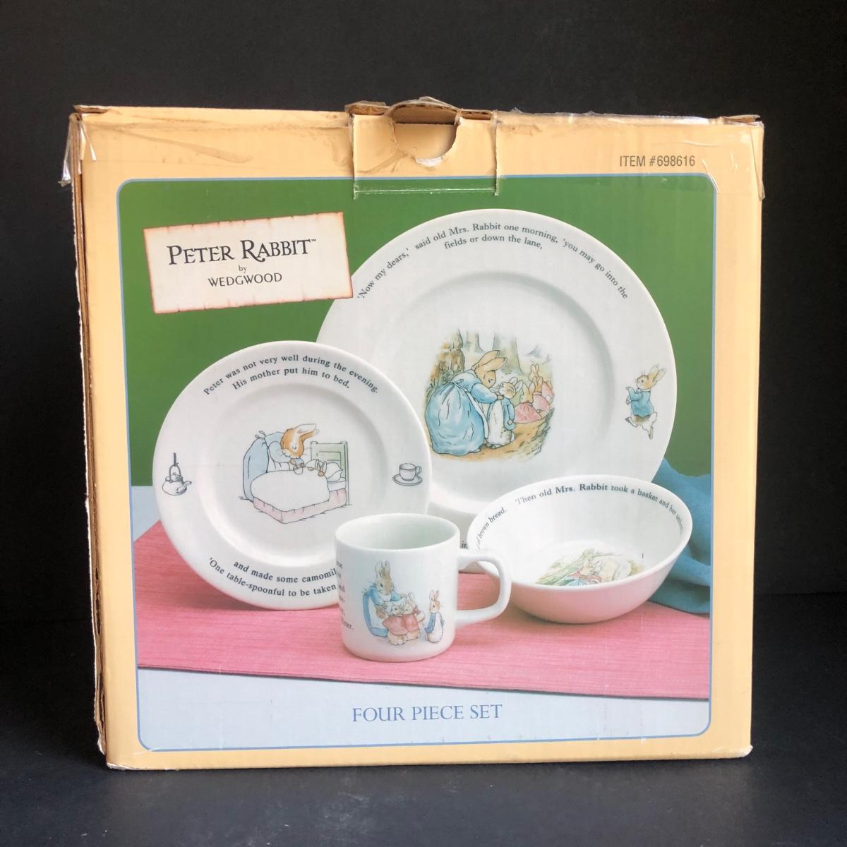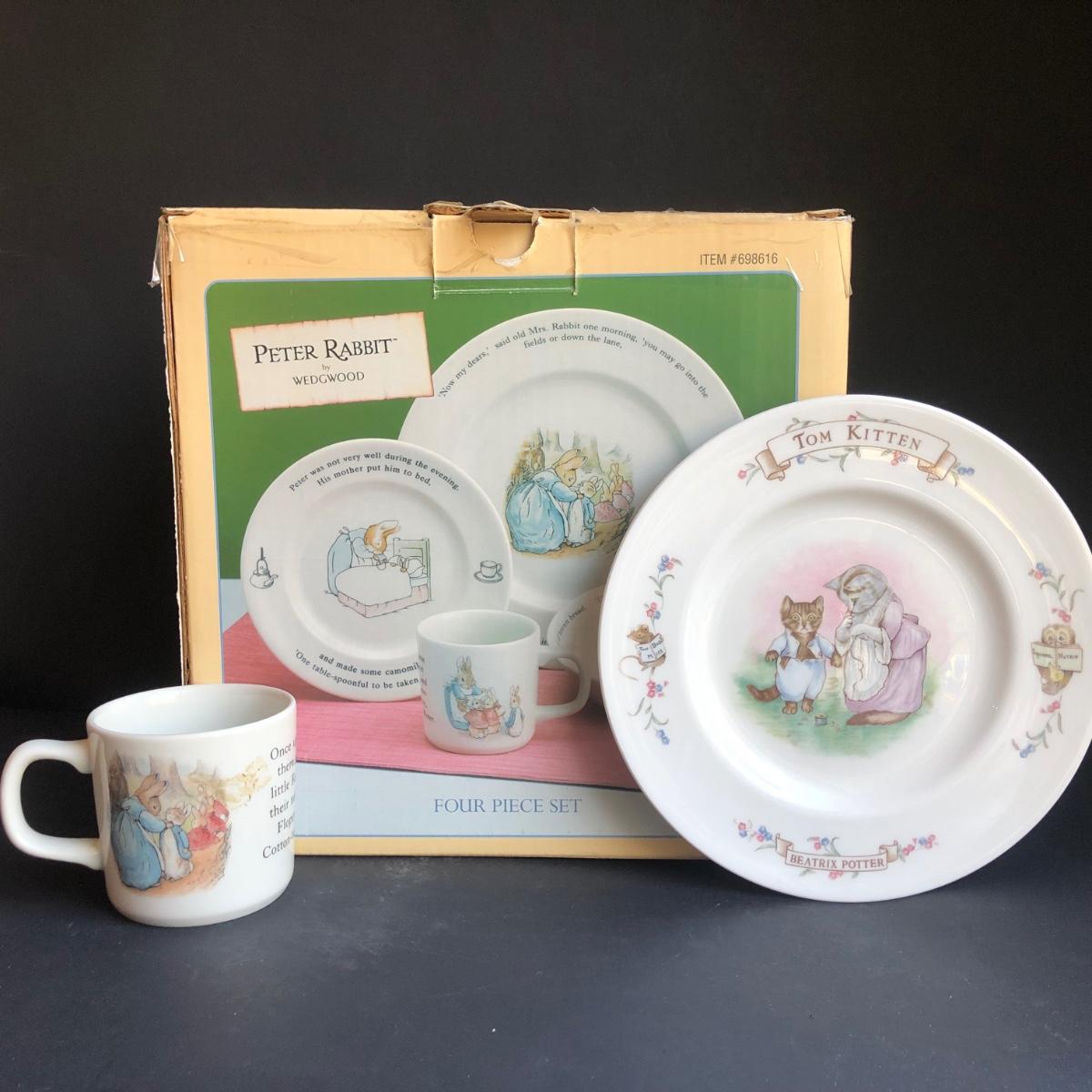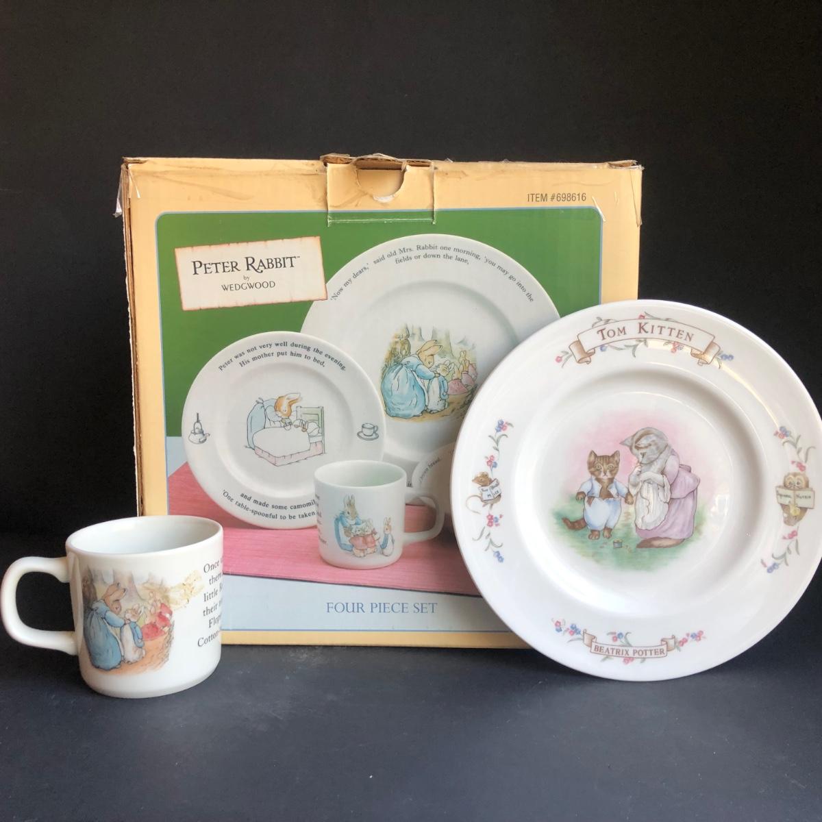 LOT 216L: Wedgewood Peter Rabbit 4-Piece Set in Box w/ 1991 Wedgewood Tom Kitten Plate & Royal Albert Mug