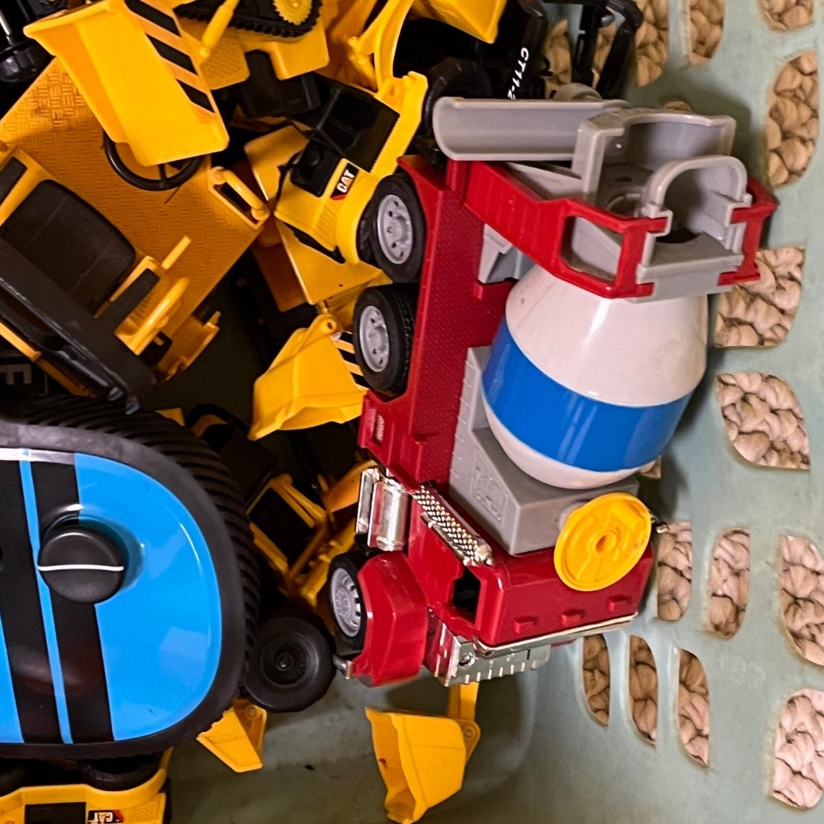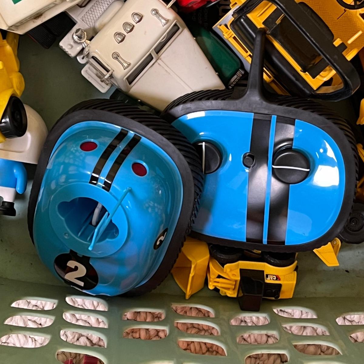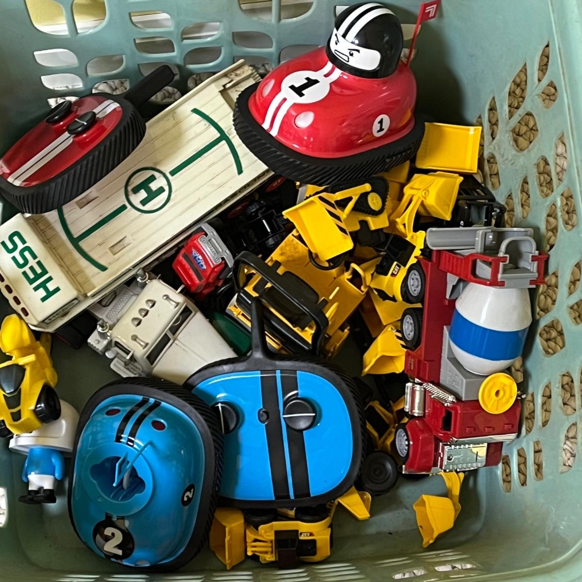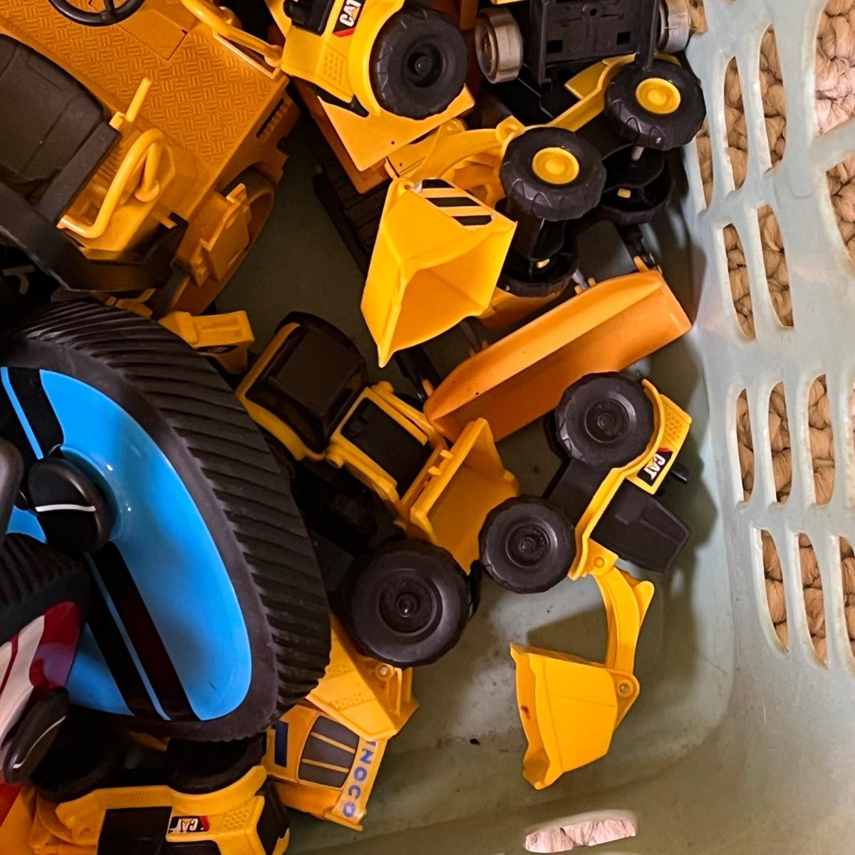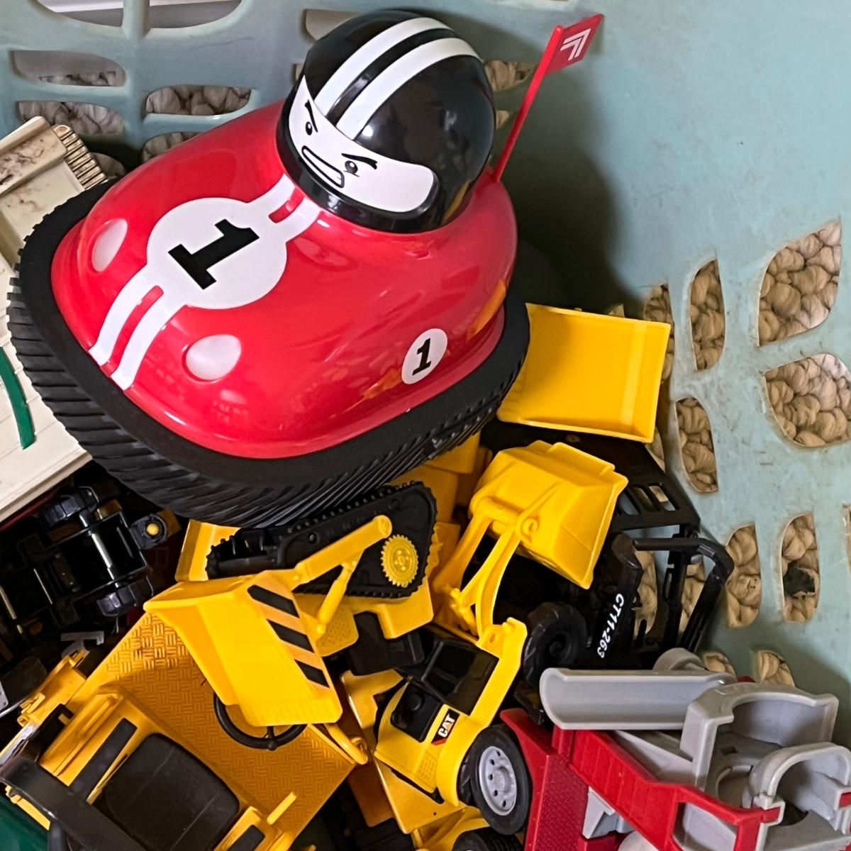 LOT 258B: Bin of Assorted Toy Vehicles- RC Bumper Cars, Construction Vehicles and More