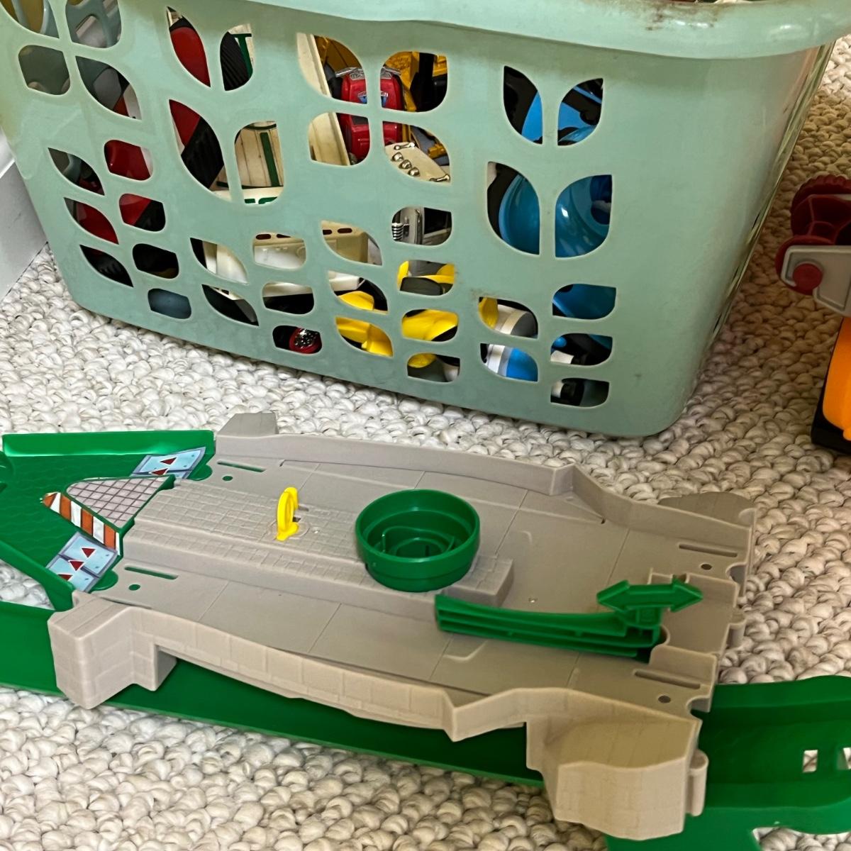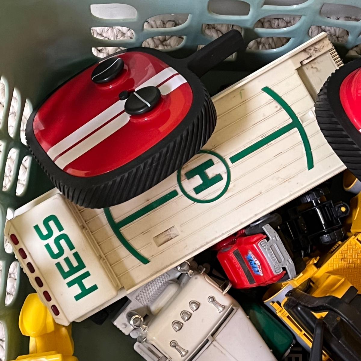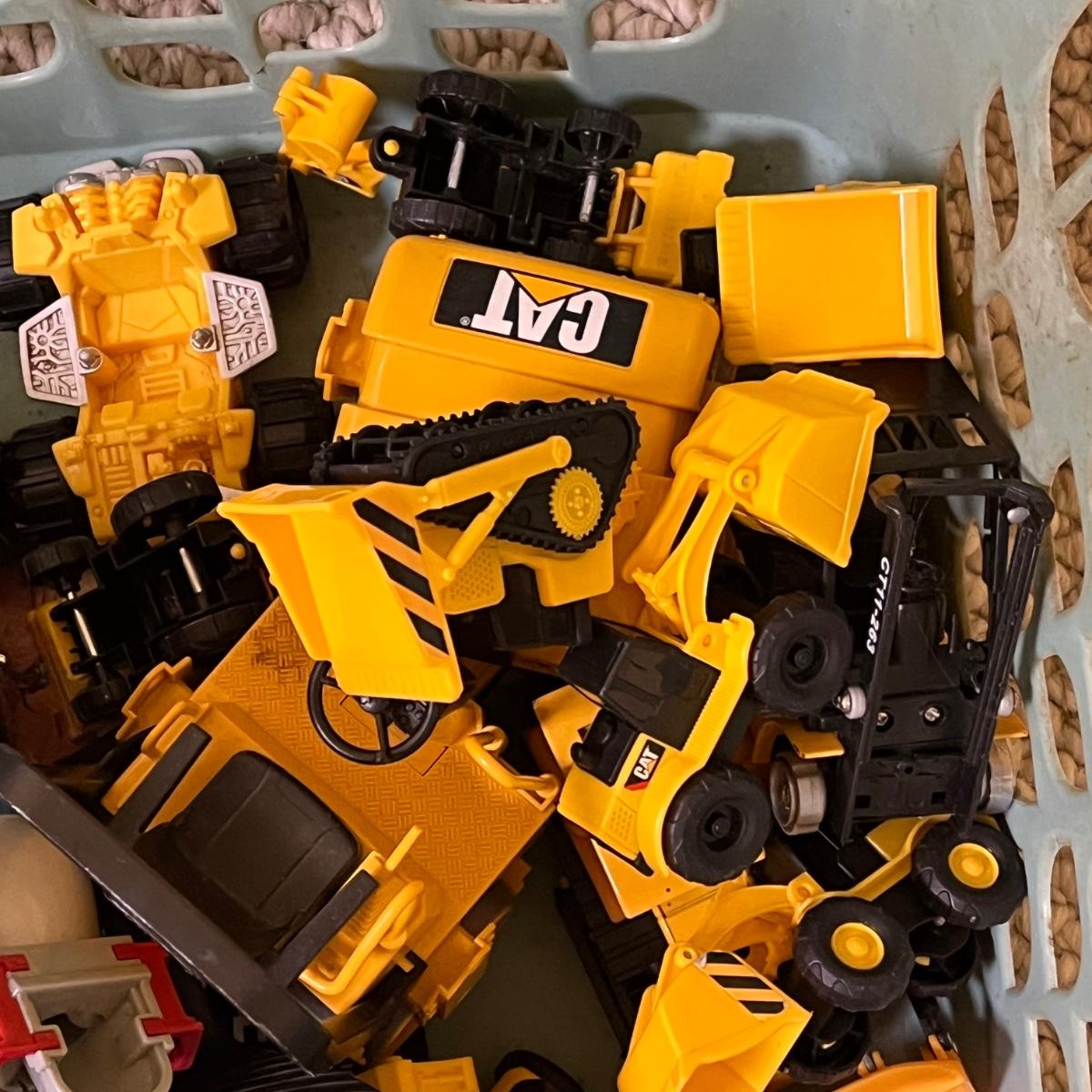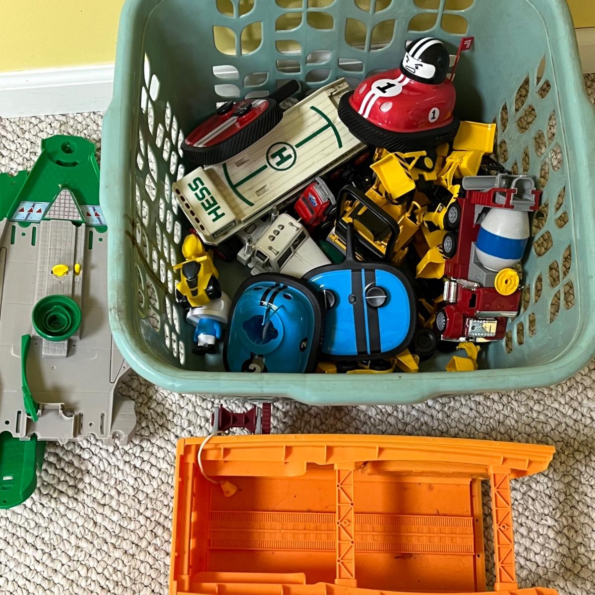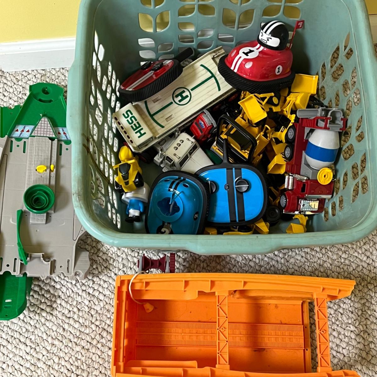 LOT 258B: Bin of Assorted Toy Vehicles- RC Bumper Cars, Construction Vehicles and More