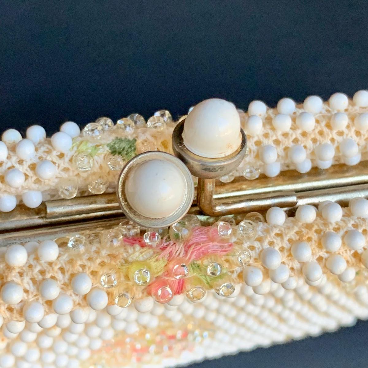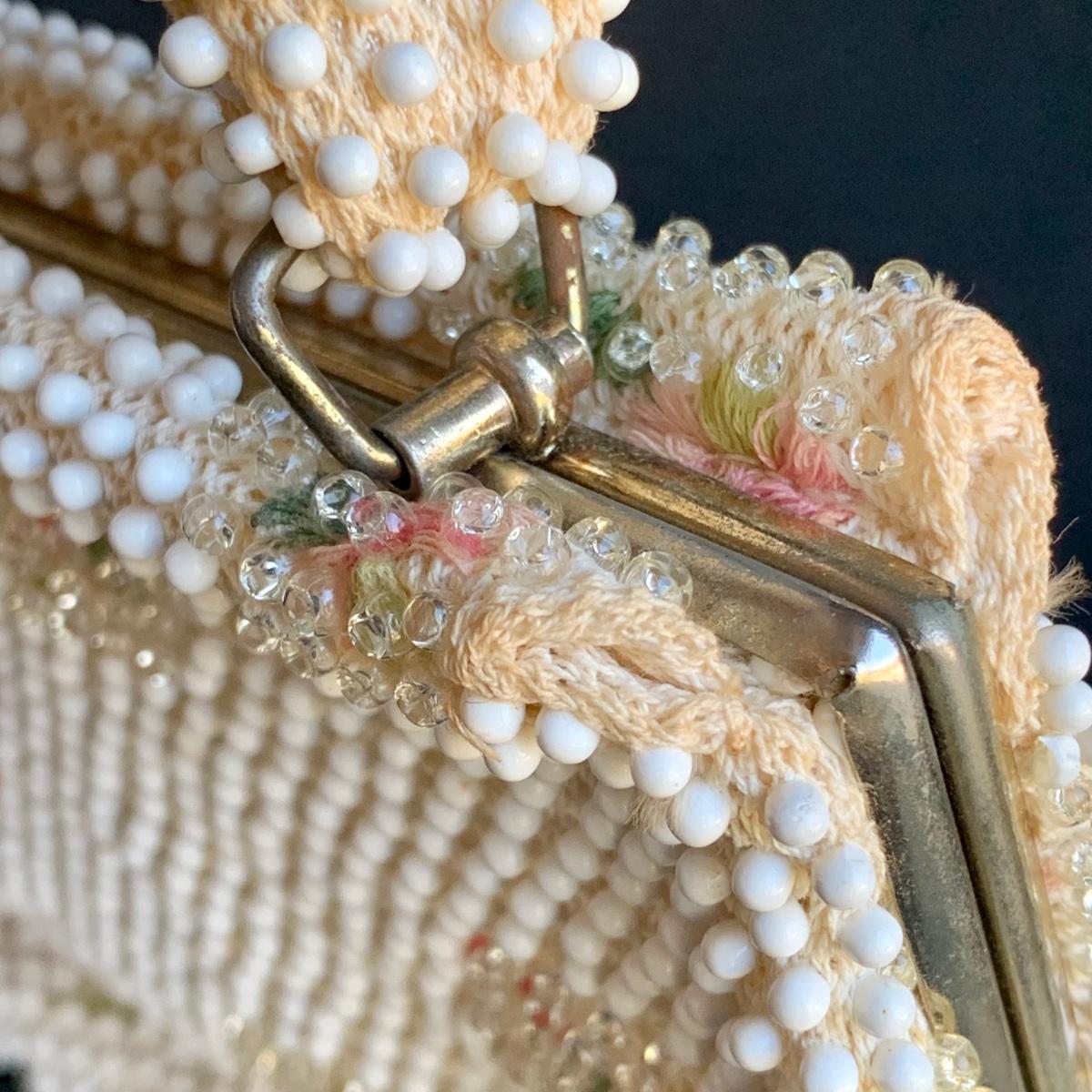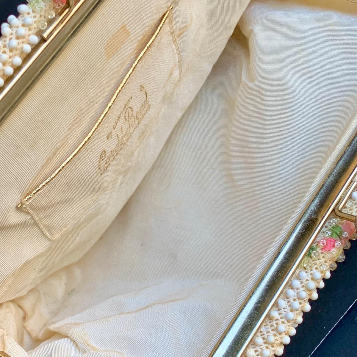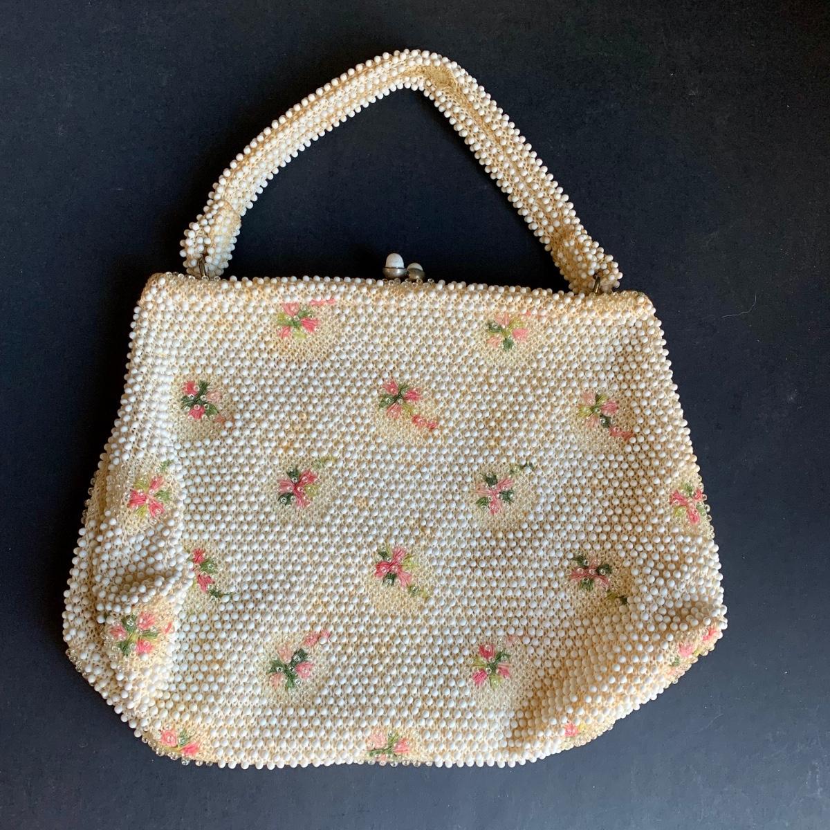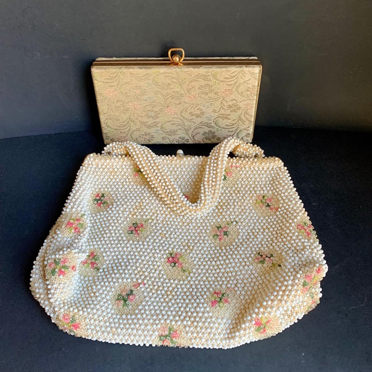 LOT 285 L: Vintage 1950's Lumured Floral Corde-Bead Handbag & Hard Case Clutch W/ Mirror