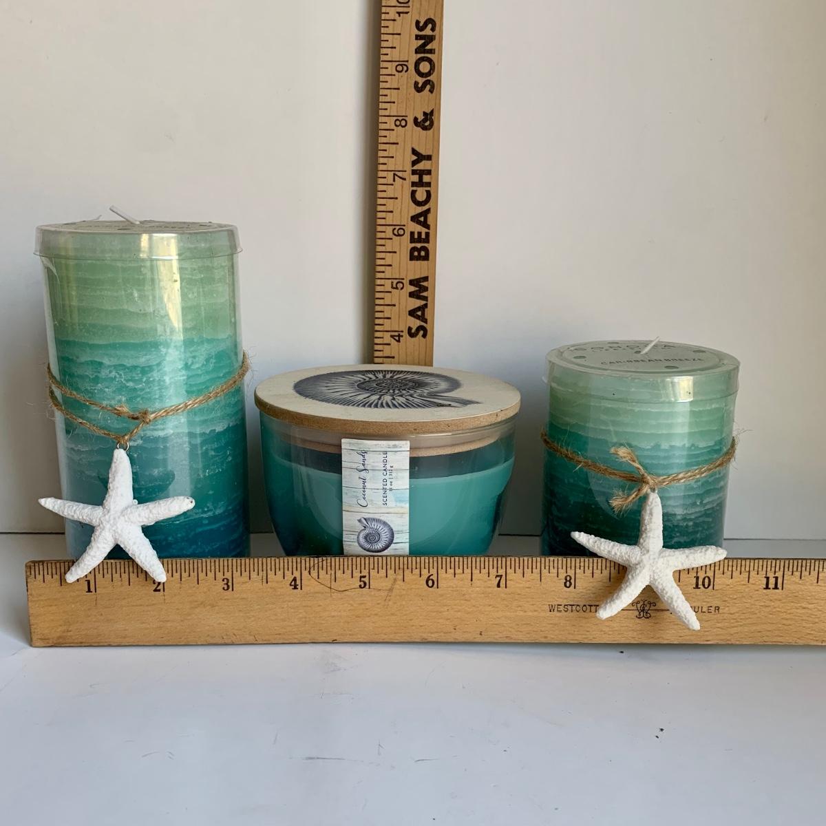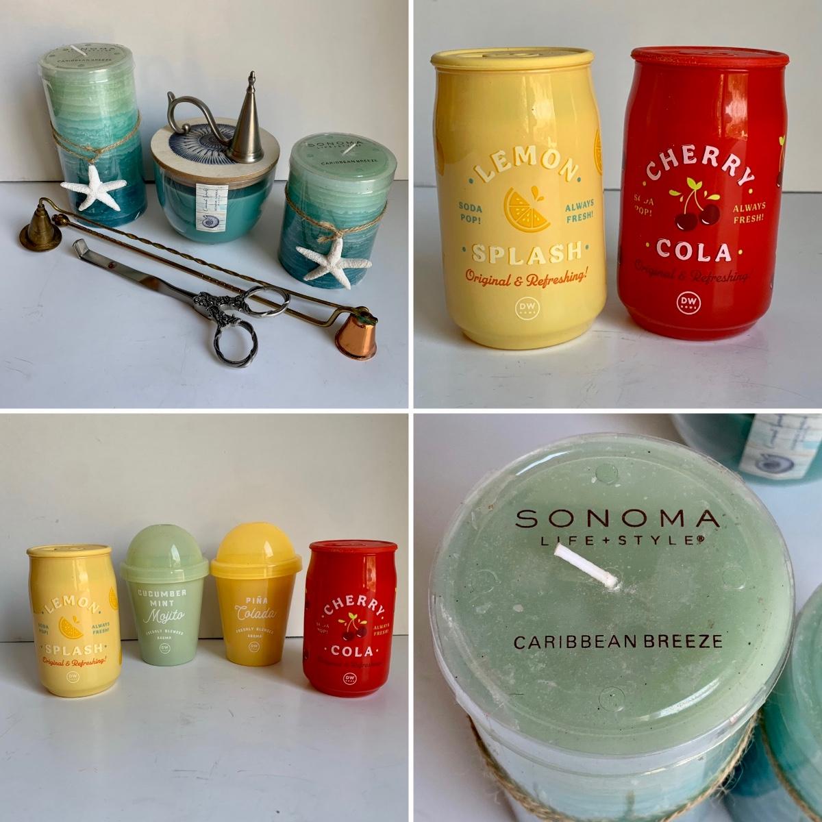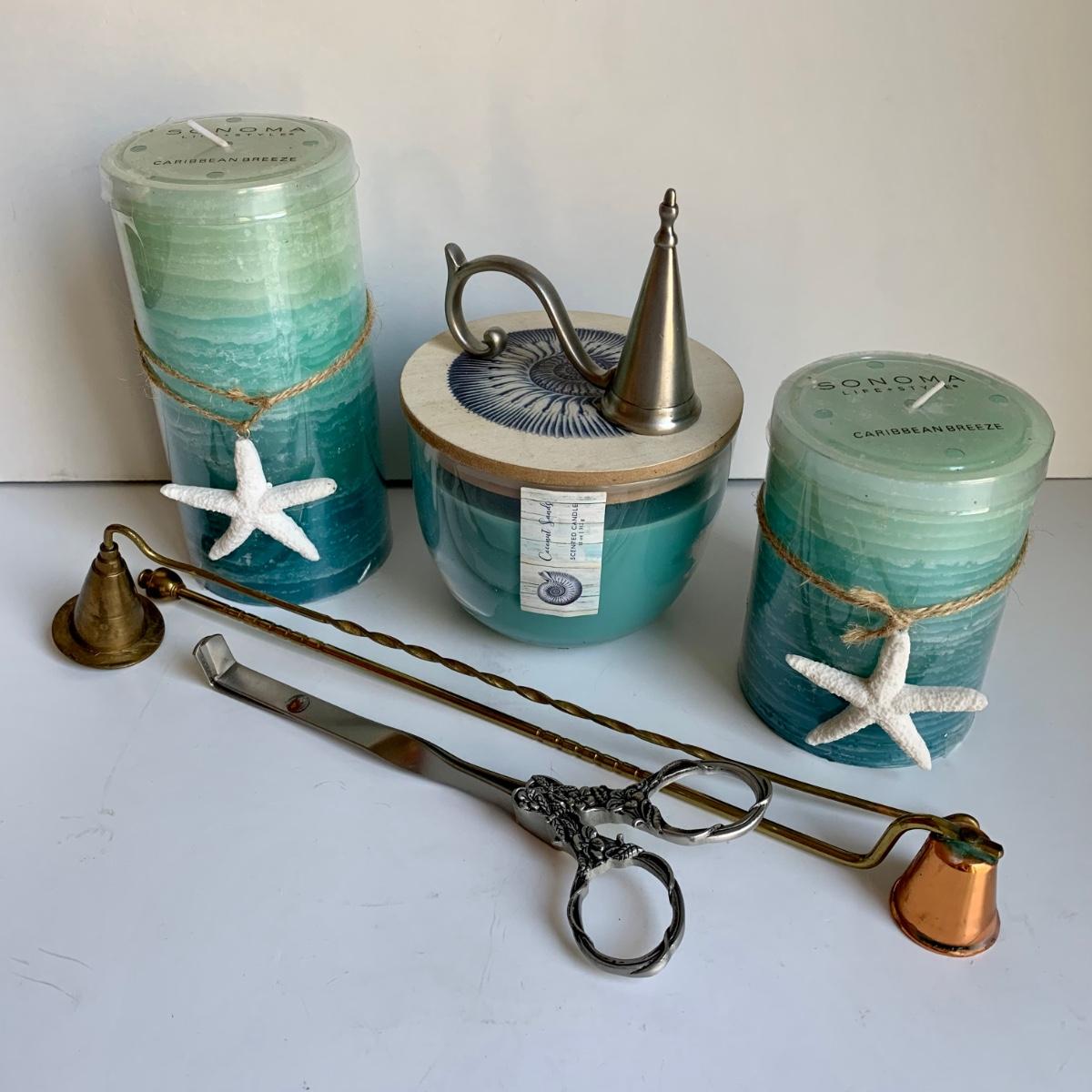 LOT 287 L: Beach & Drink Themed Candle Collection W/ Snuffers & Wick Trimmers