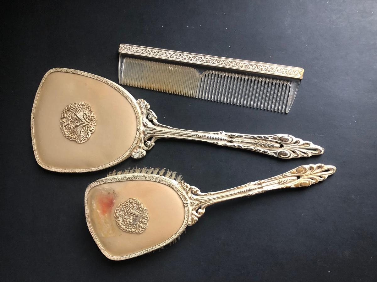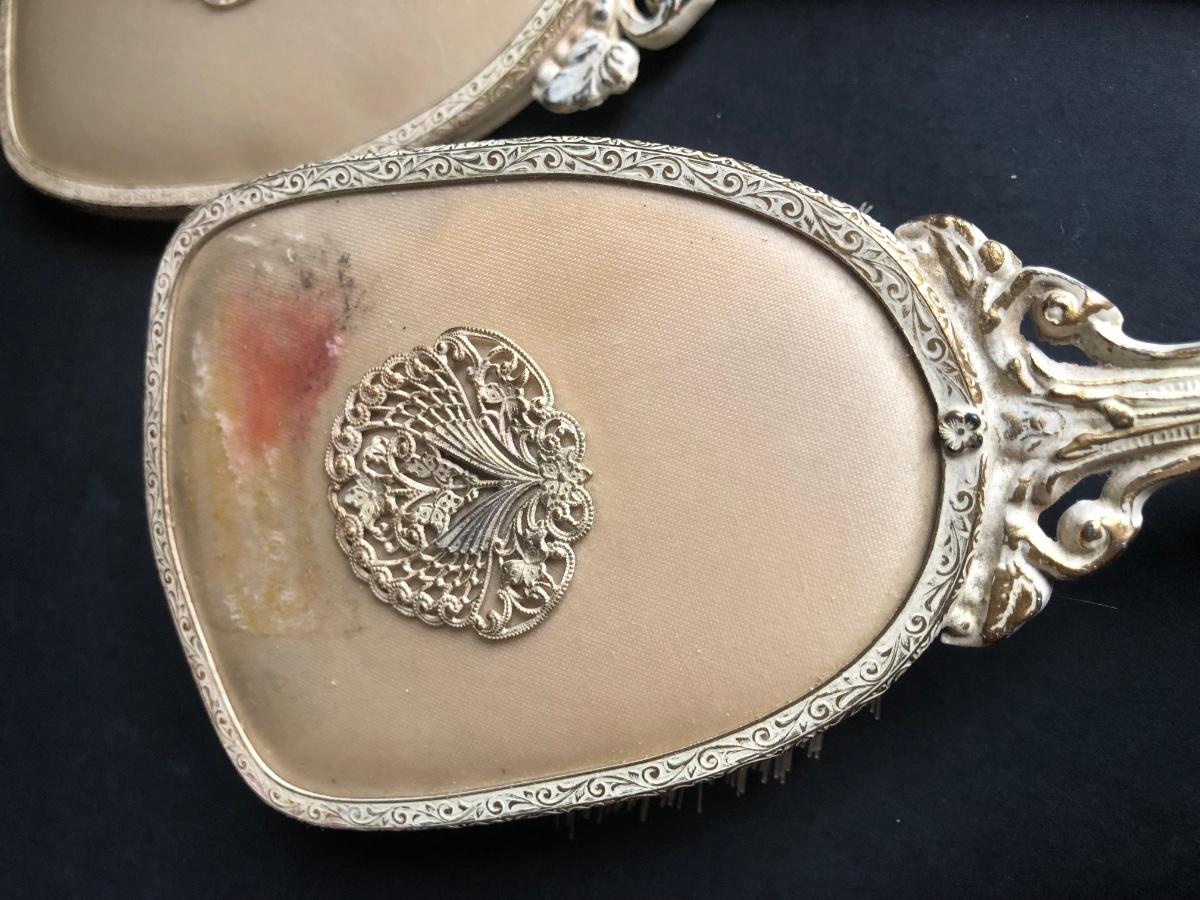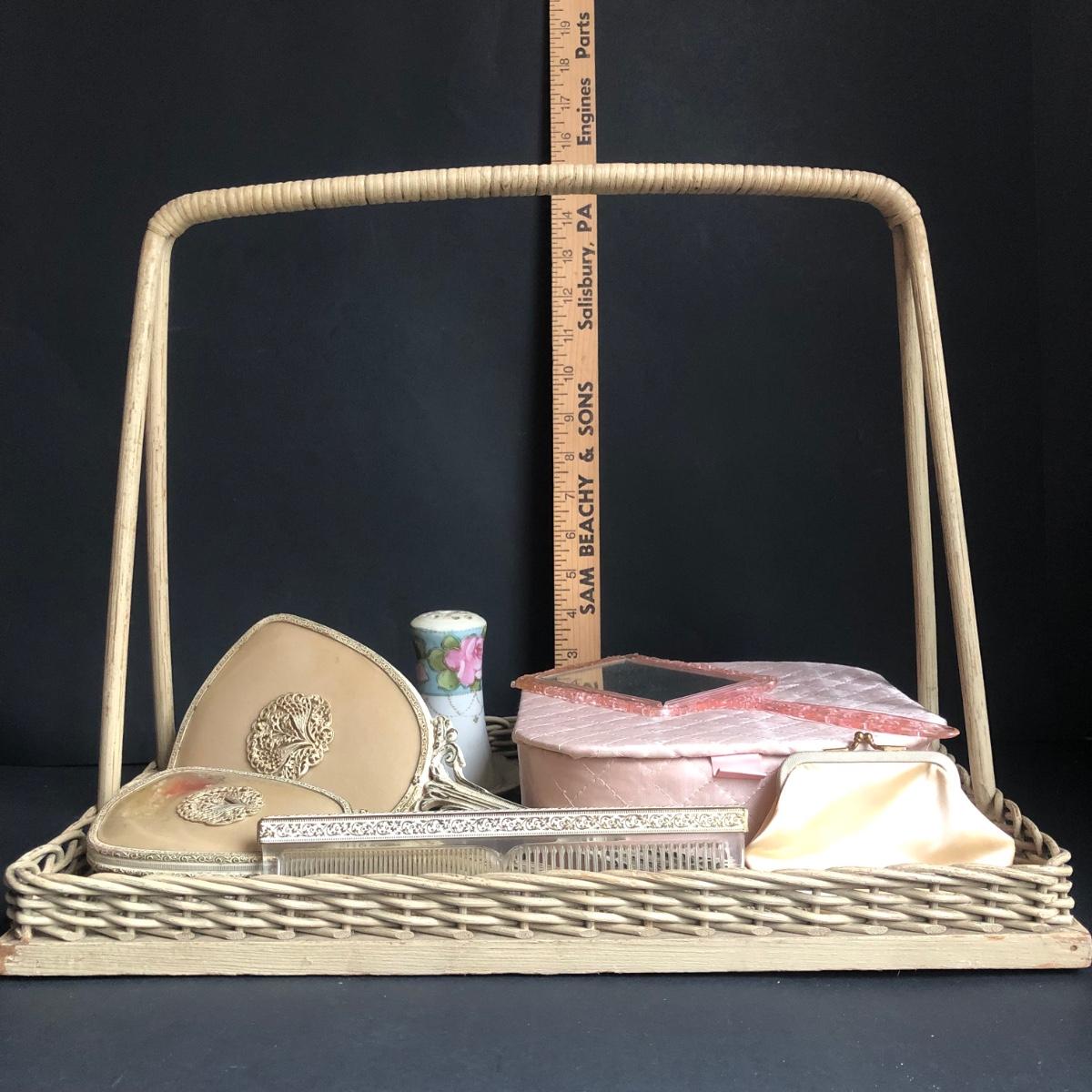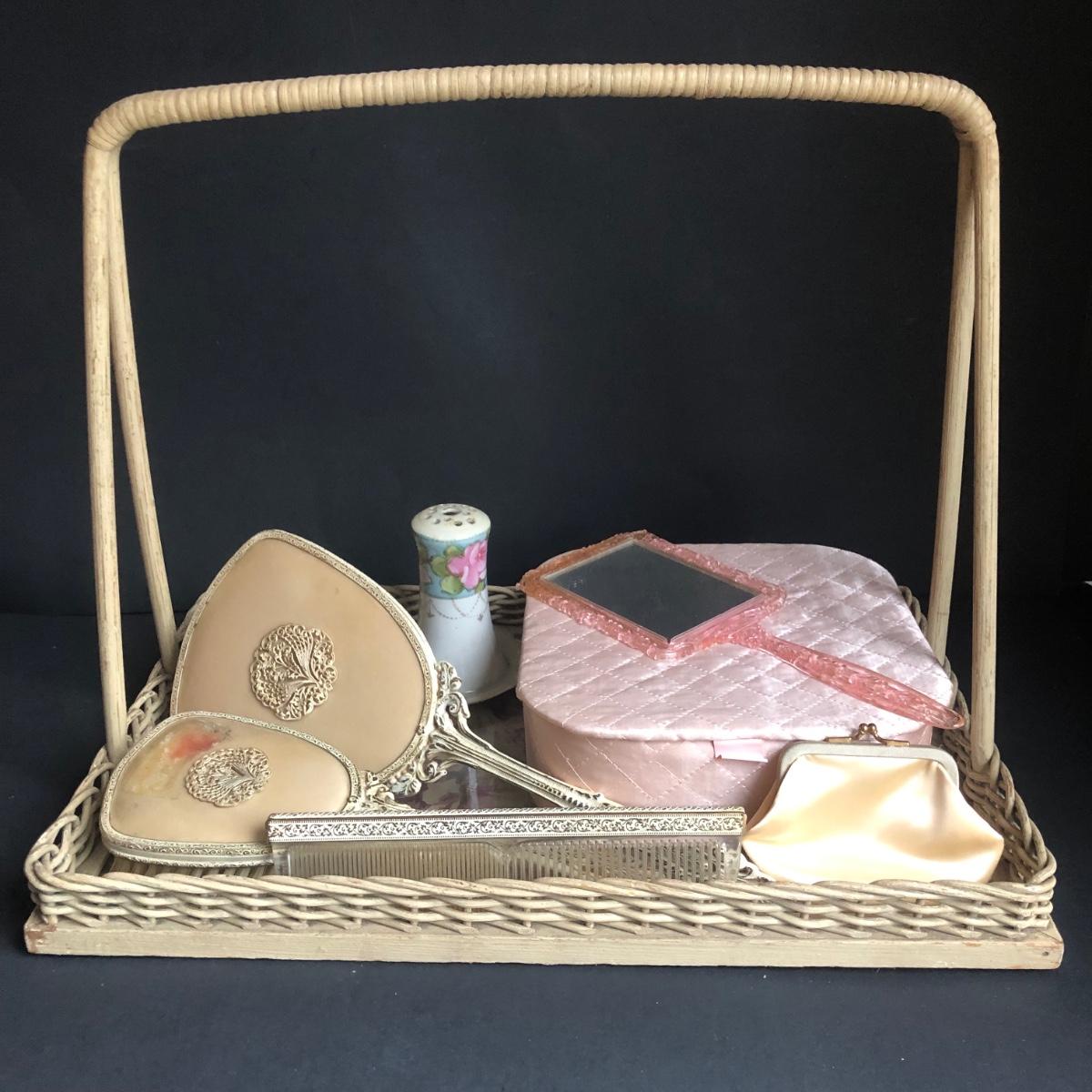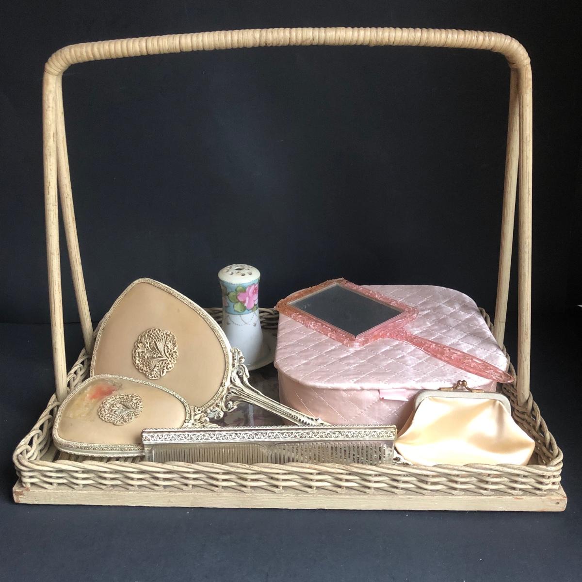 LOT 290L: Vintage Filigree Vanity 3-Piece Set, Satin Box, Floral Vanity Tray w/ Handle & More
