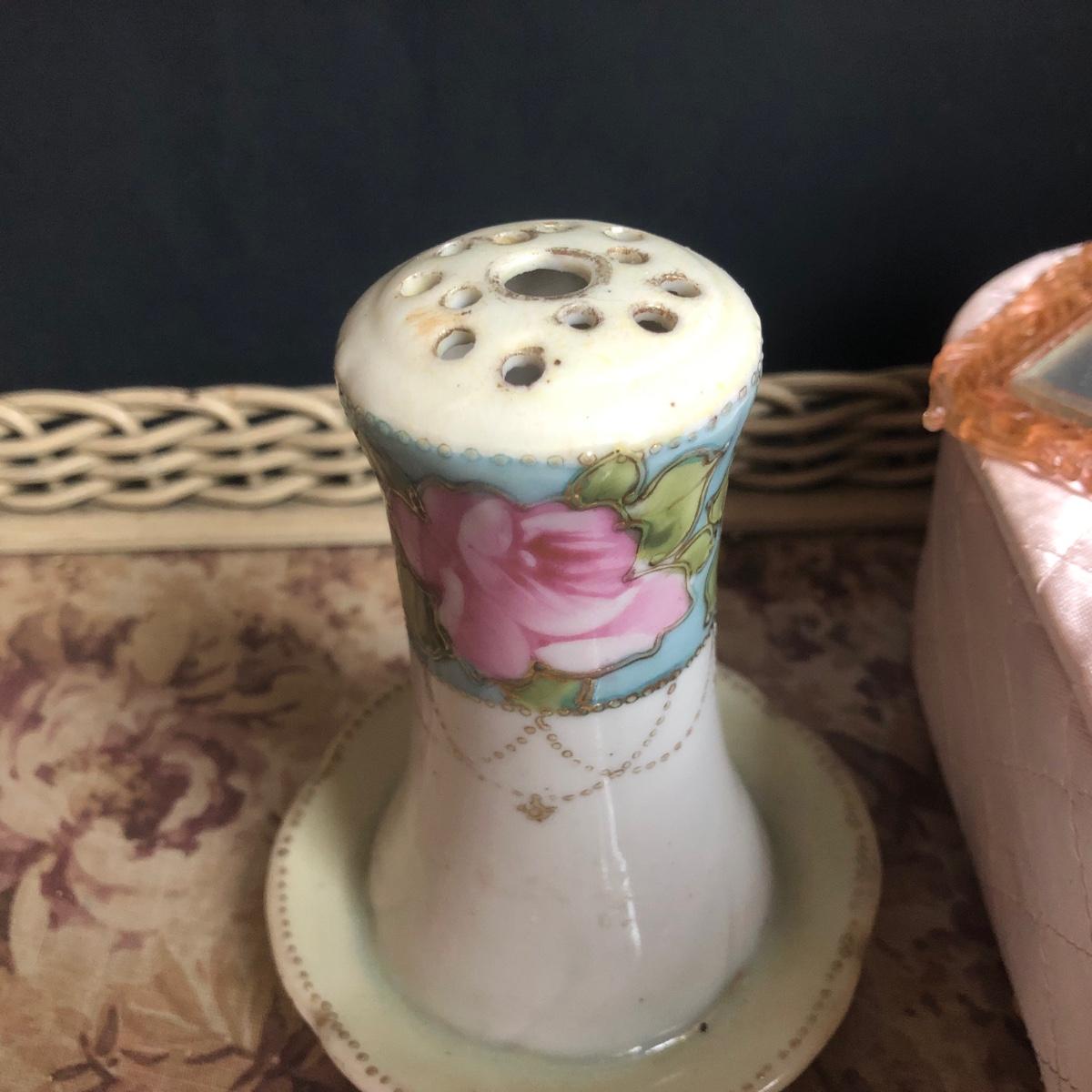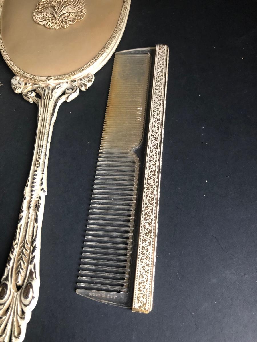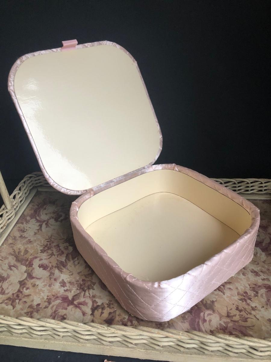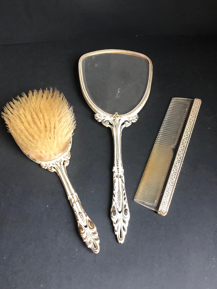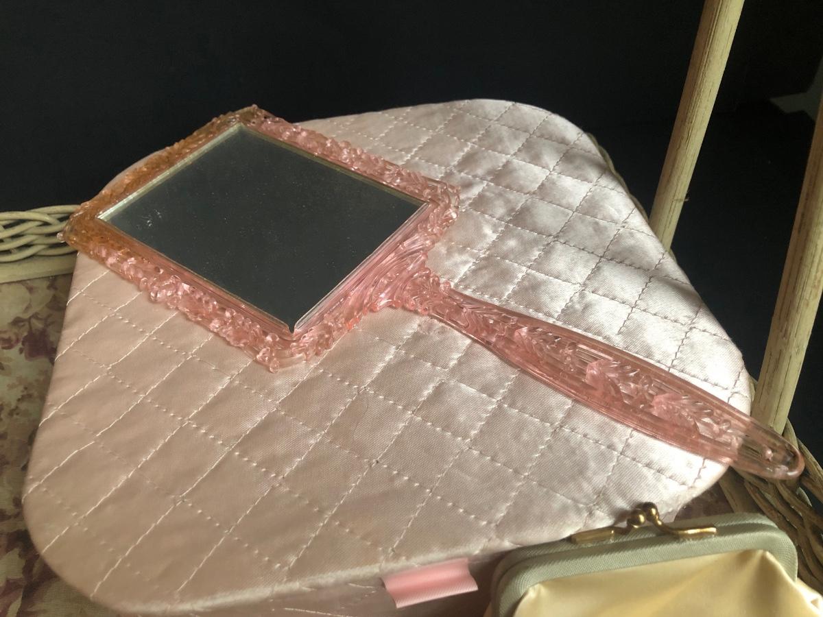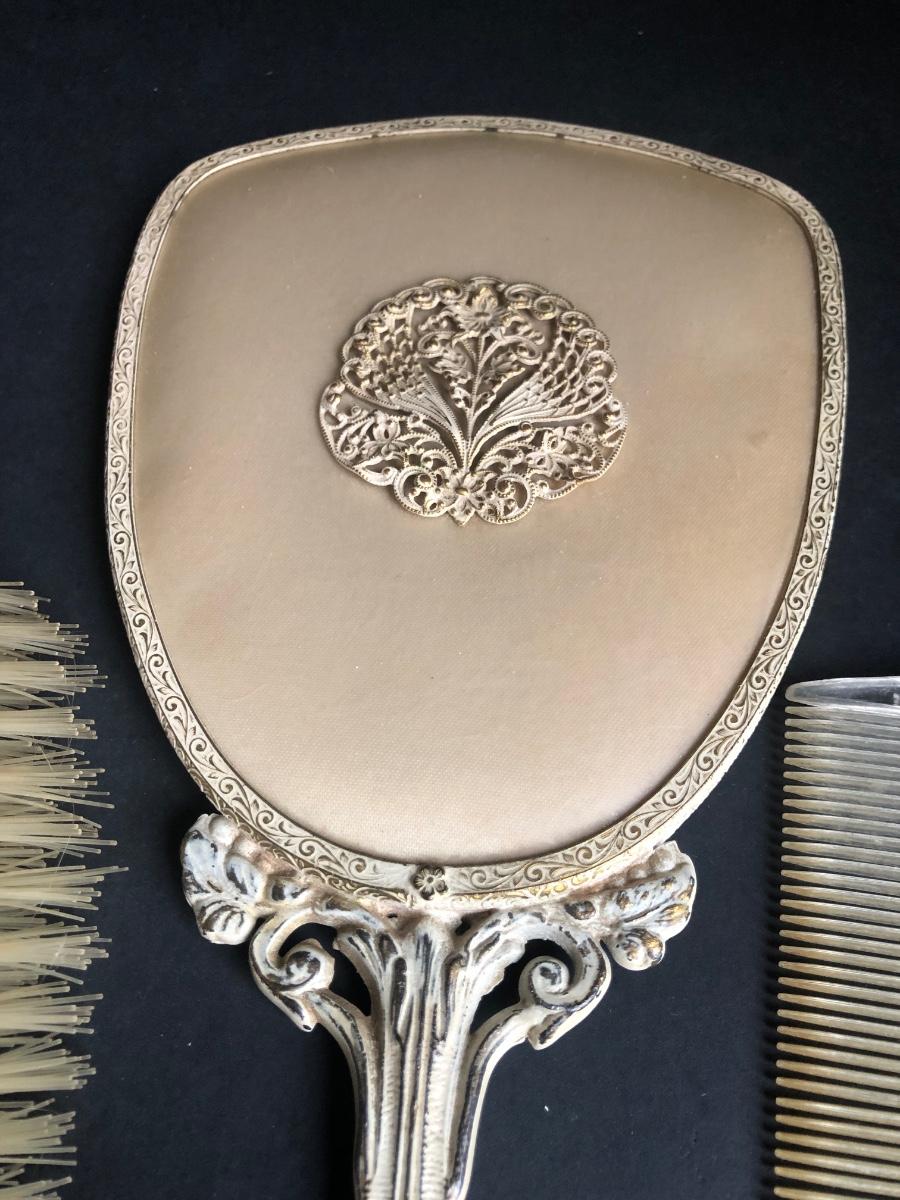 LOT 290L: Vintage Filigree Vanity 3-Piece Set, Satin Box, Floral Vanity Tray w/ Handle & More