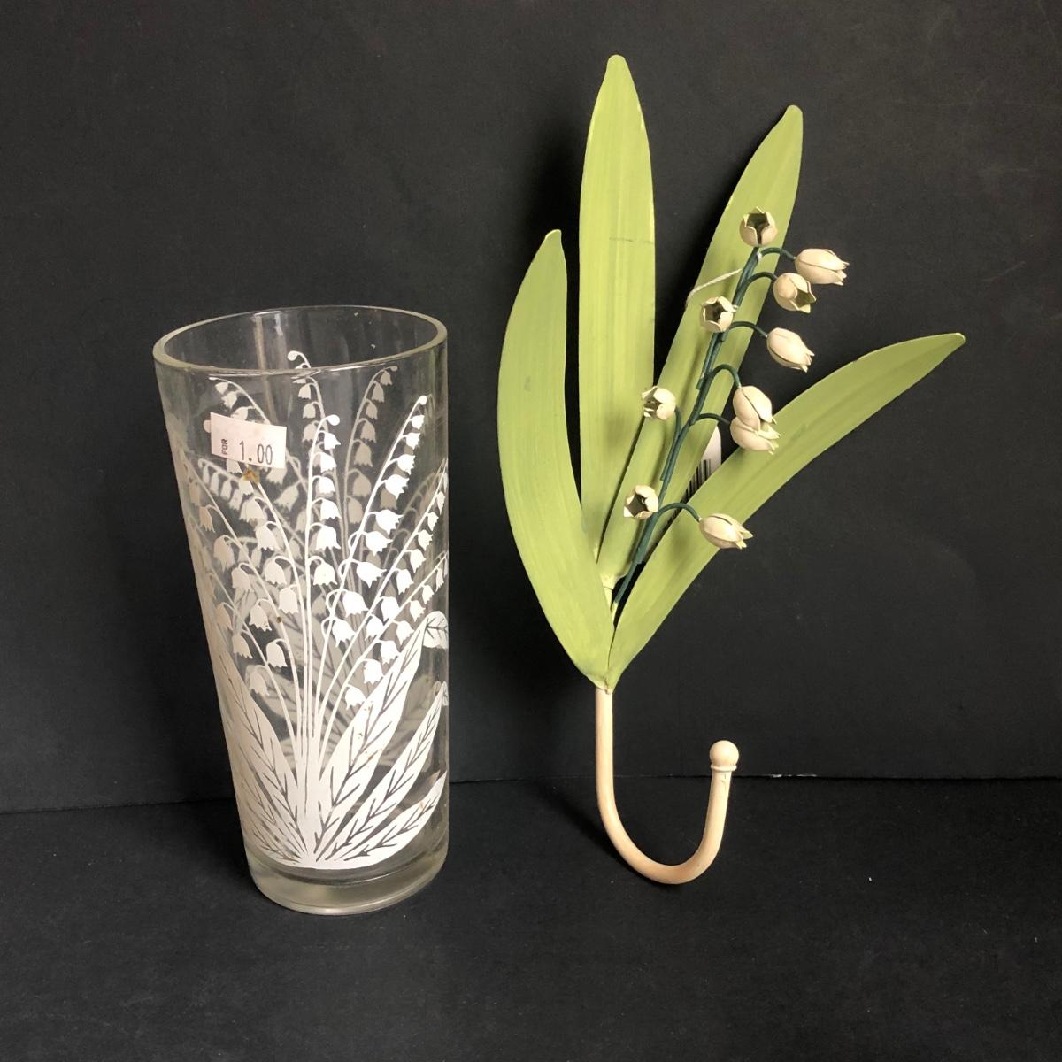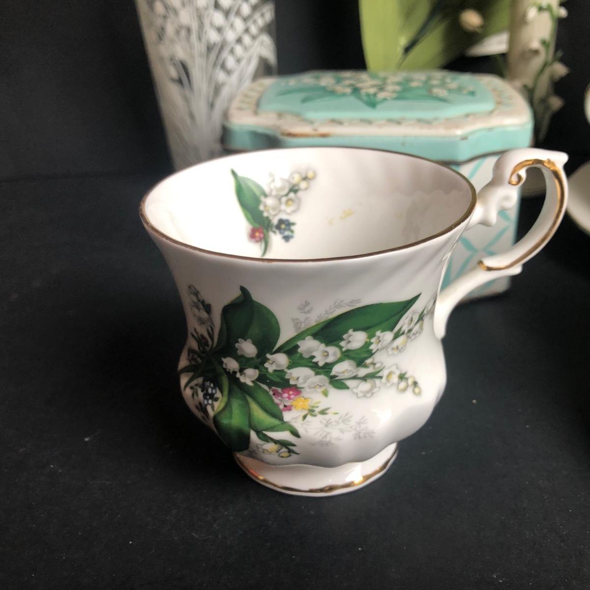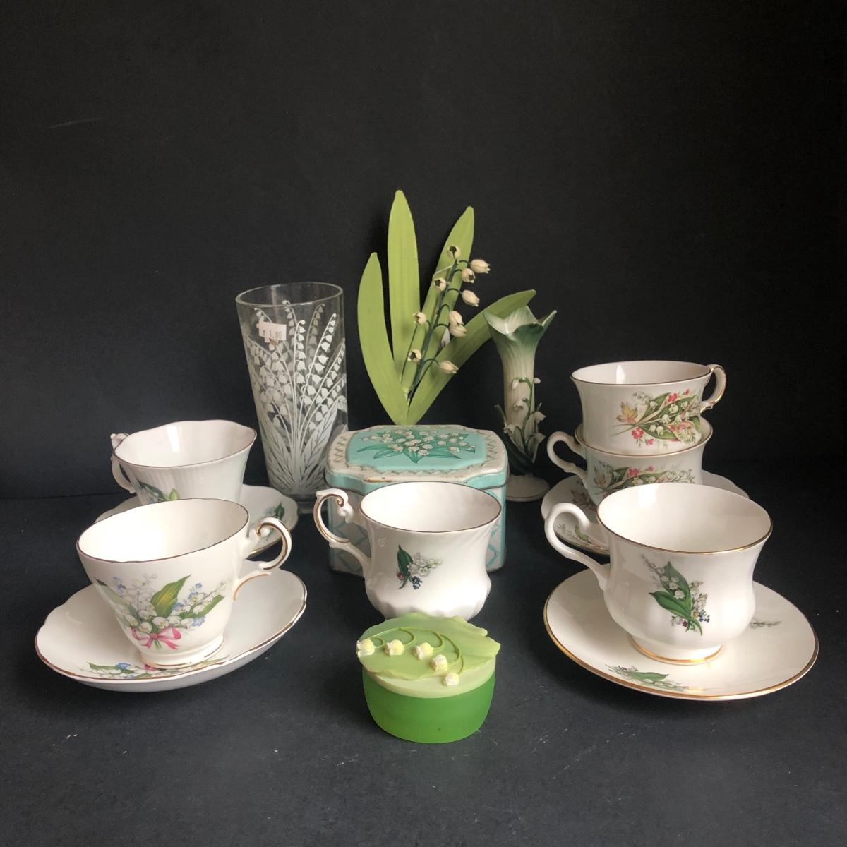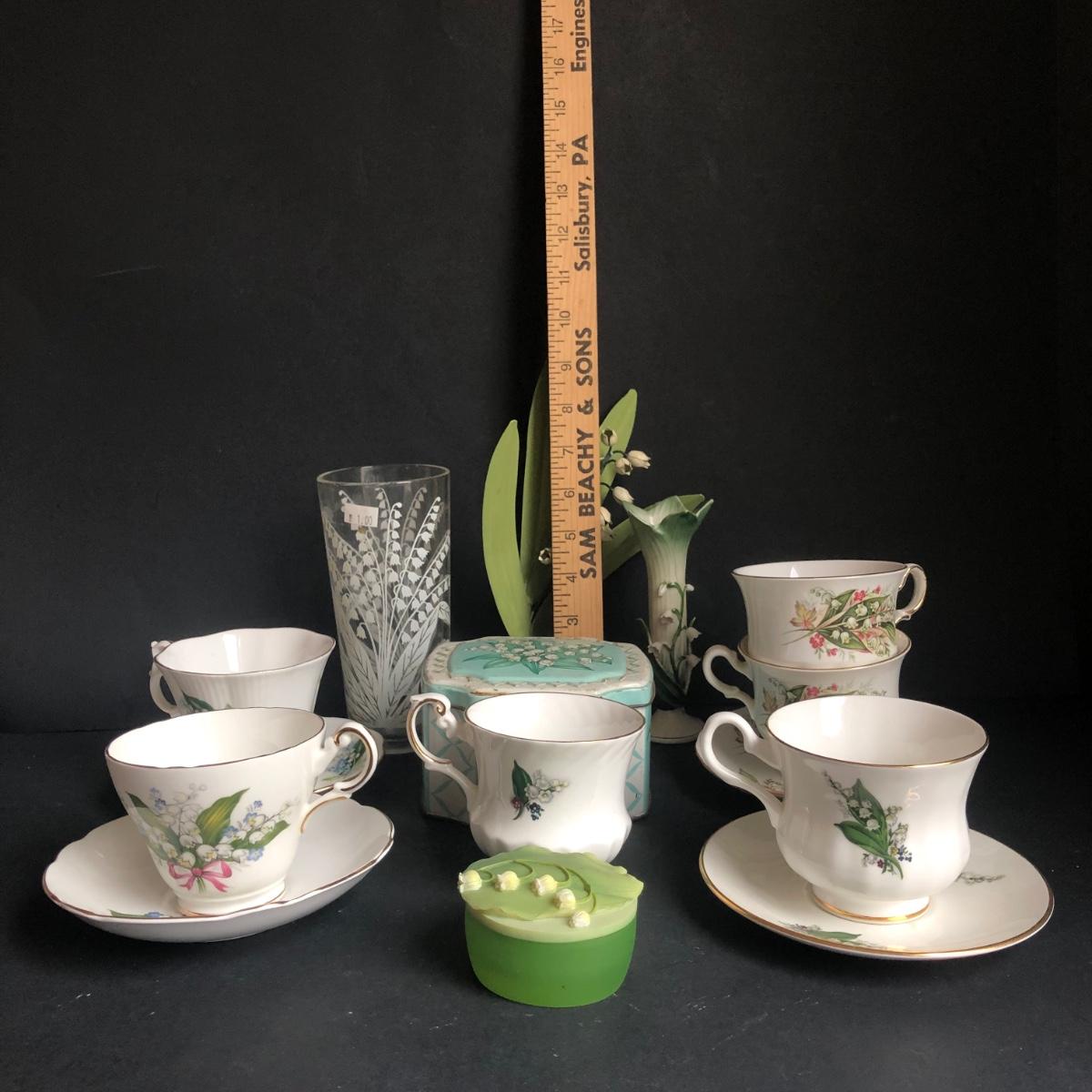 LOT 294L: Lily of the Valley Collection - Teacups w/ Saucers, Trinket Box, Tin, Wall Hook, Glass & Bud Vase