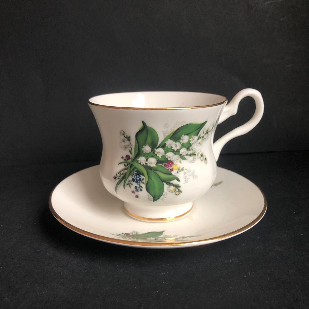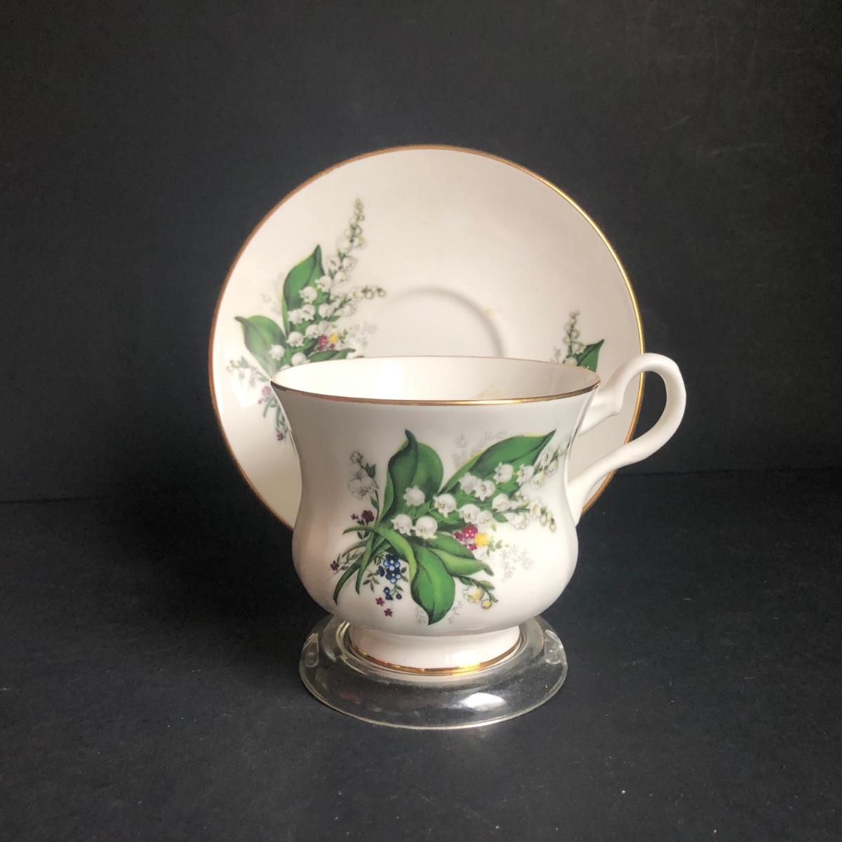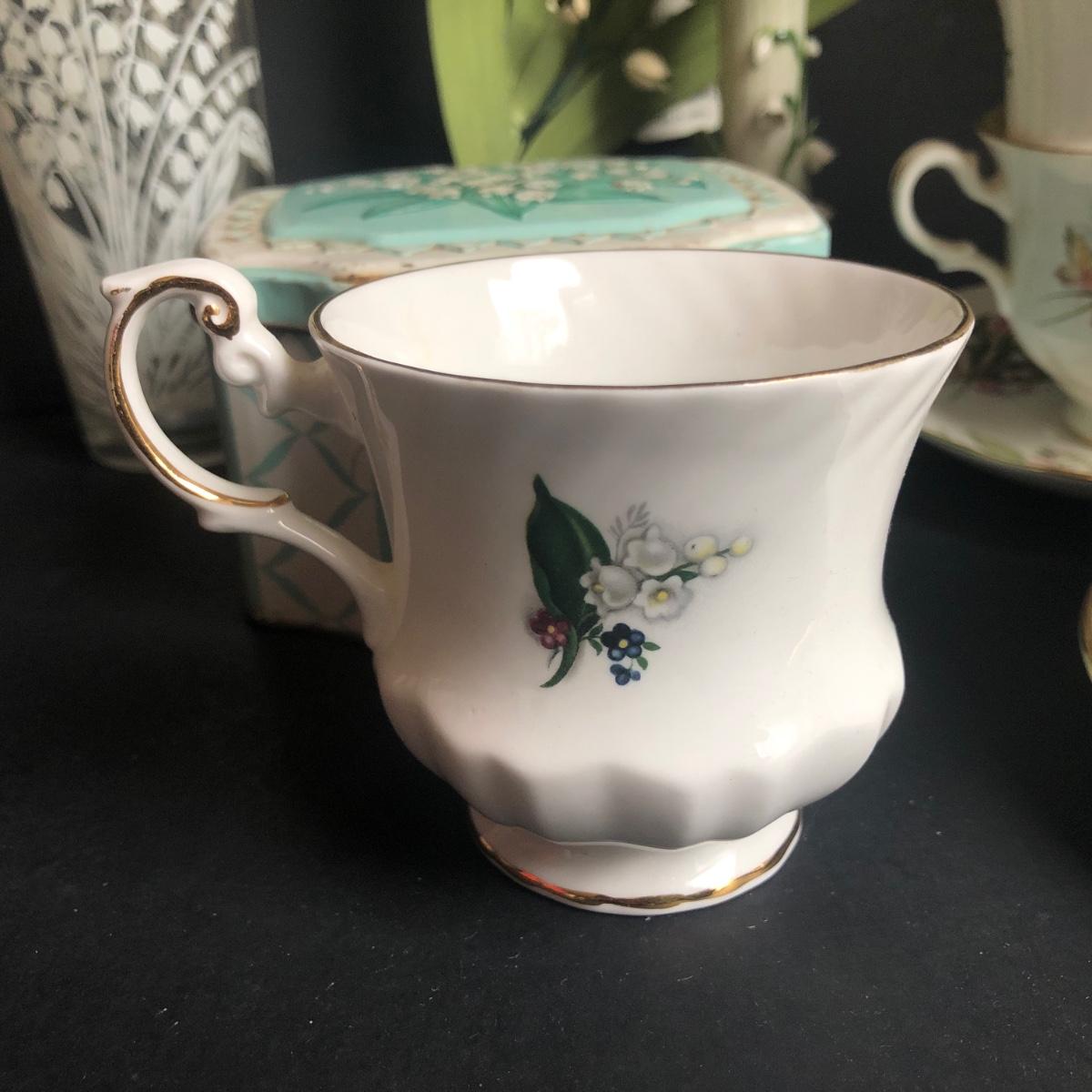 LOT 294L: Lily of the Valley Collection - Teacups w/ Saucers, Trinket Box, Tin, Wall Hook, Glass & Bud Vase