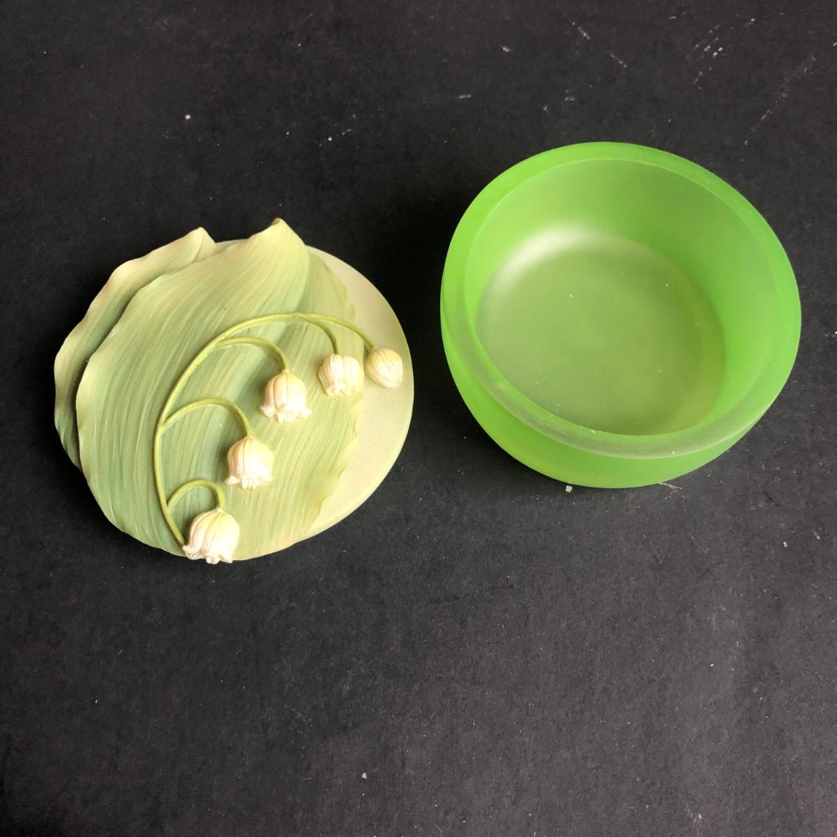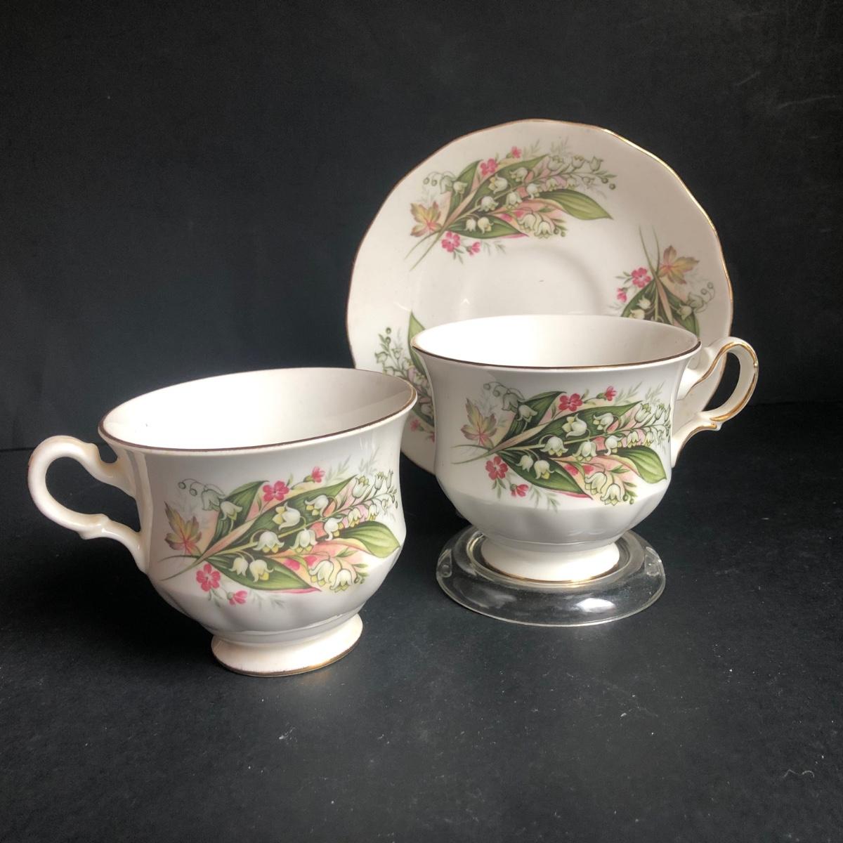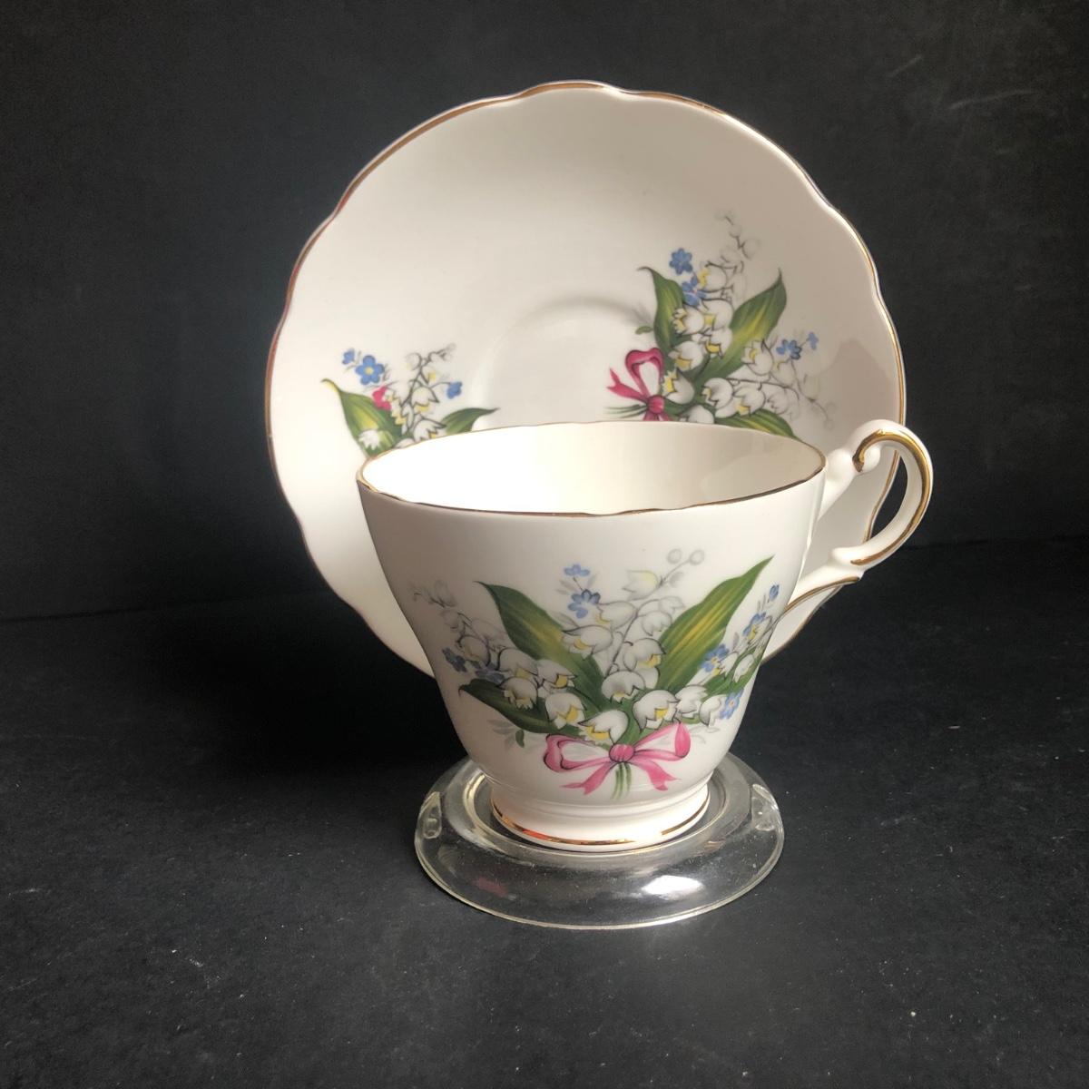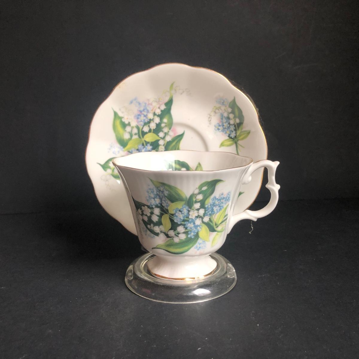 LOT 294L: Lily of the Valley Collection - Teacups w/ Saucers, Trinket Box, Tin, Wall Hook, Glass & Bud Vase