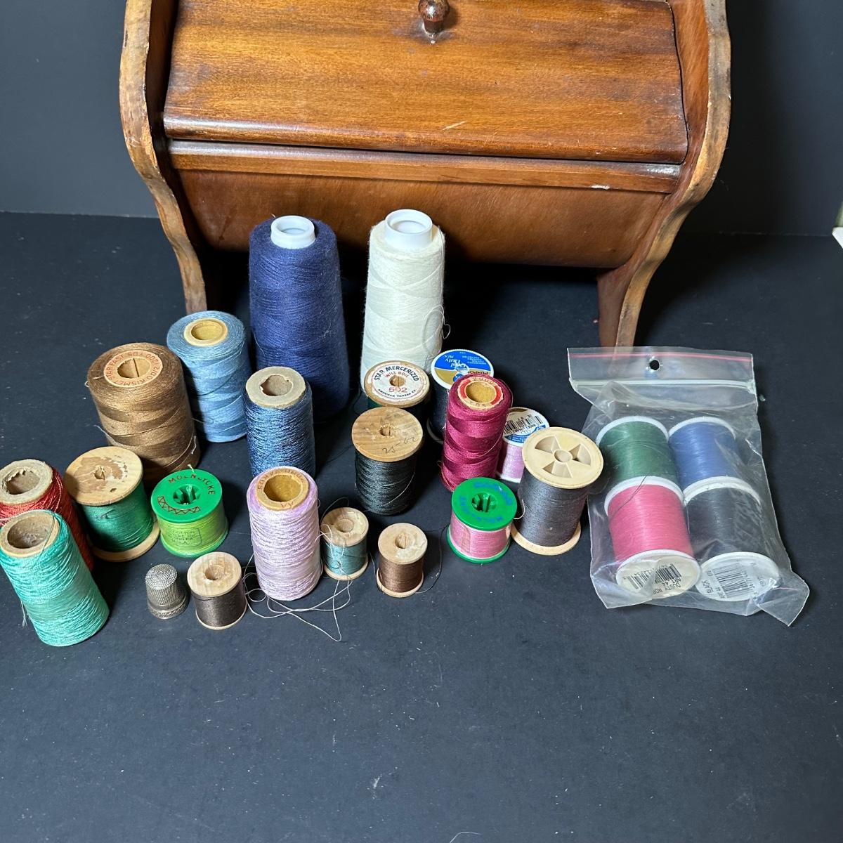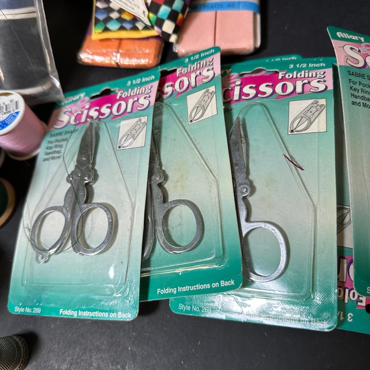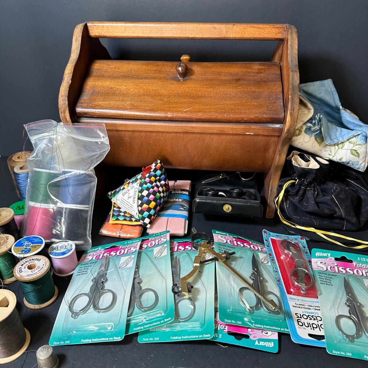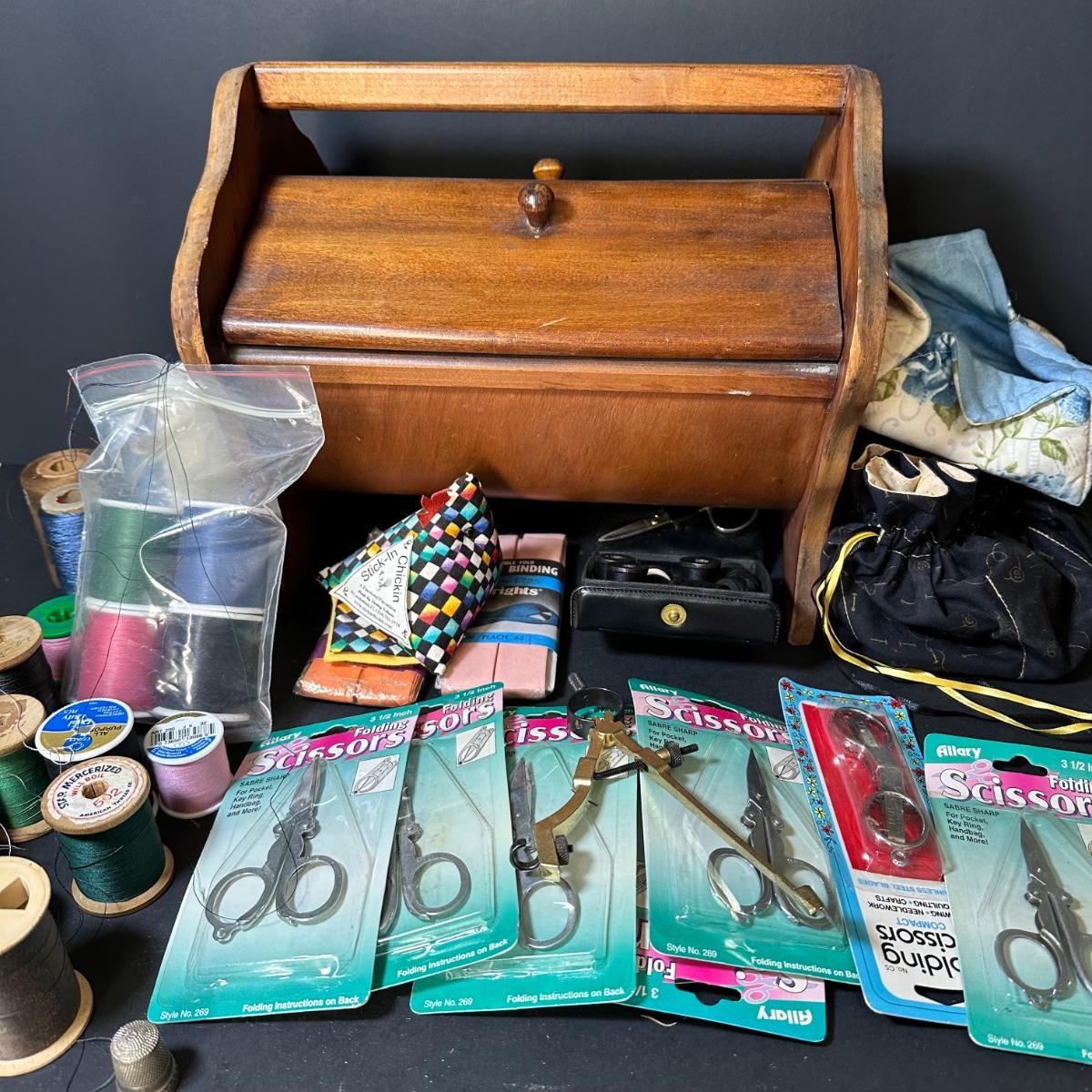 LOT 309S: Sewing Supplies - Thread, Folding Scissors, Sewing Box & More