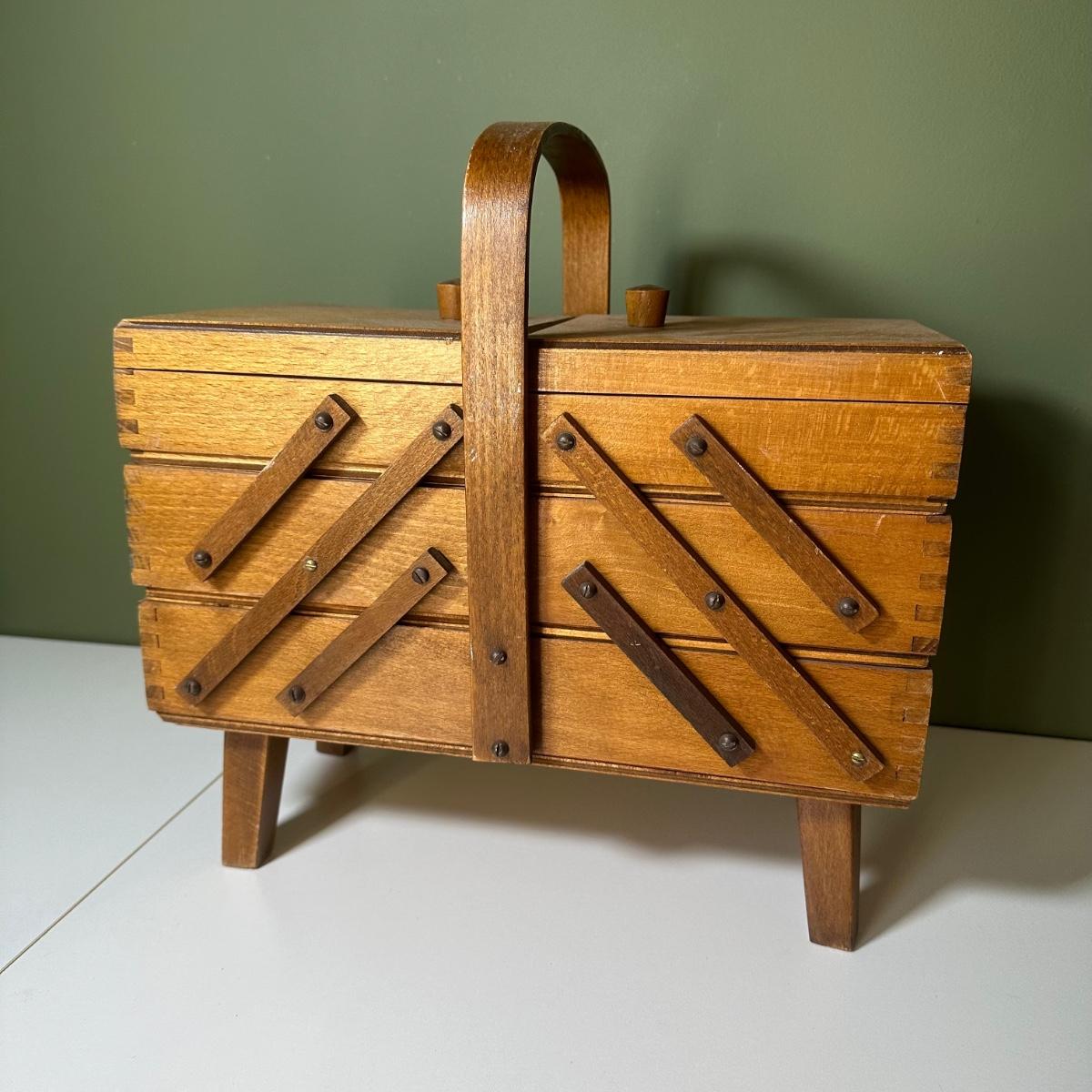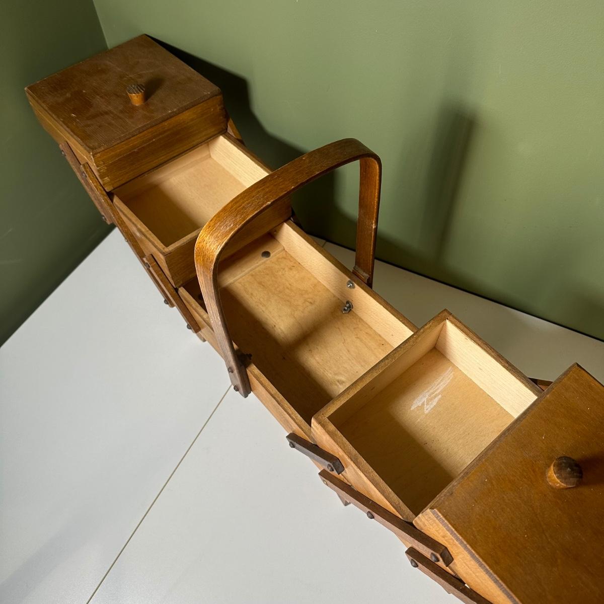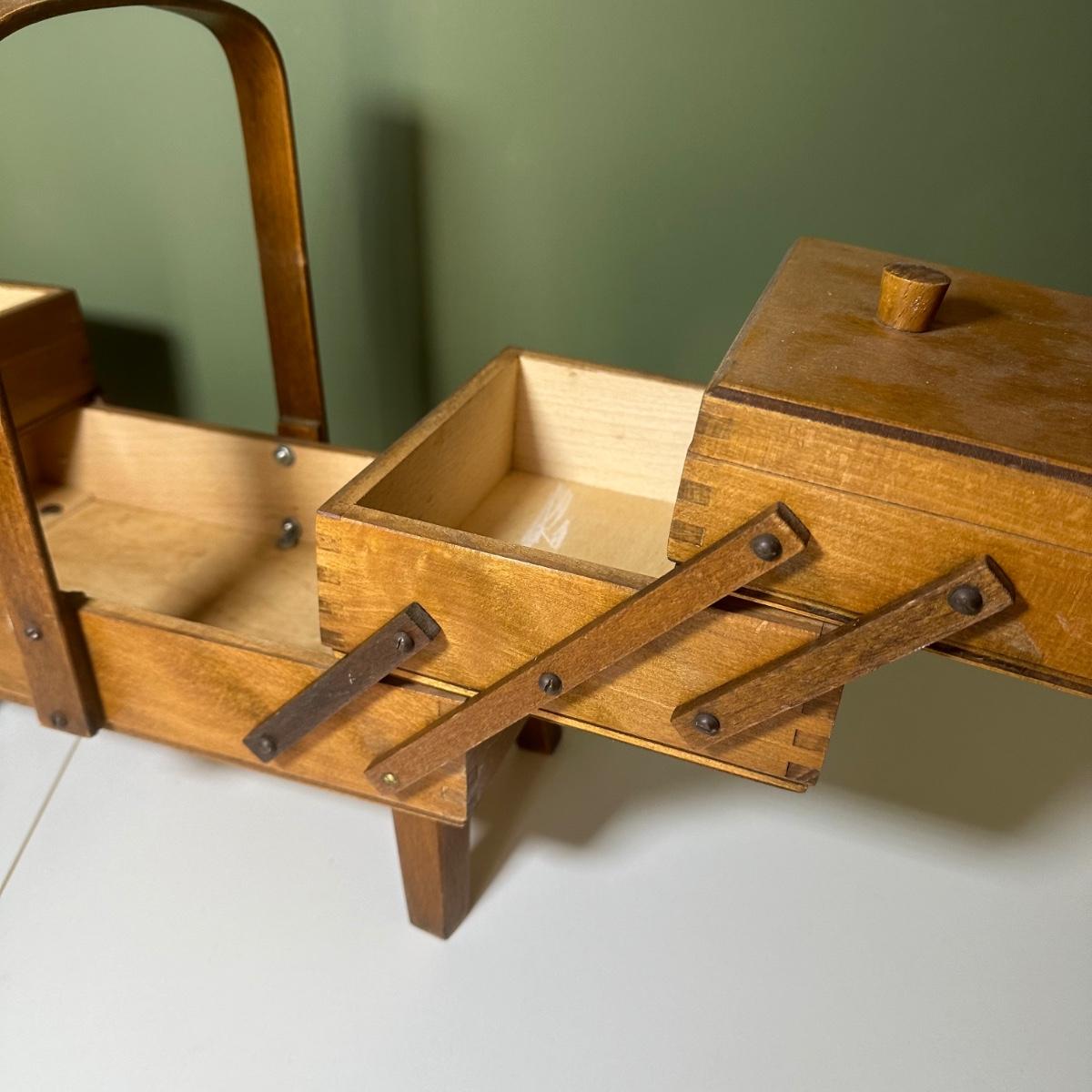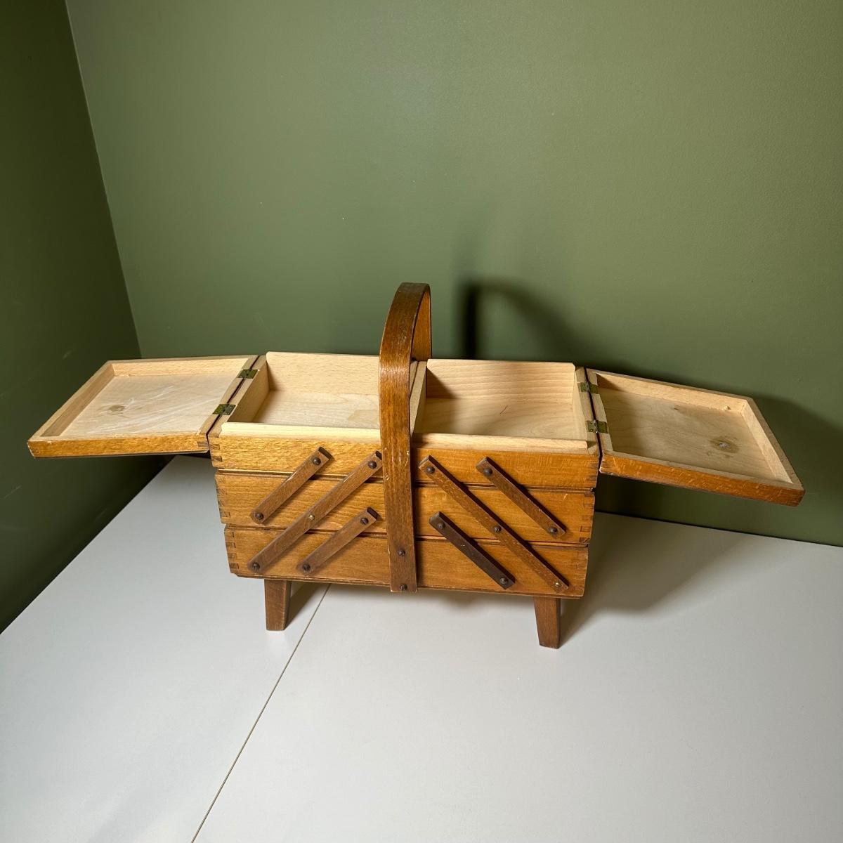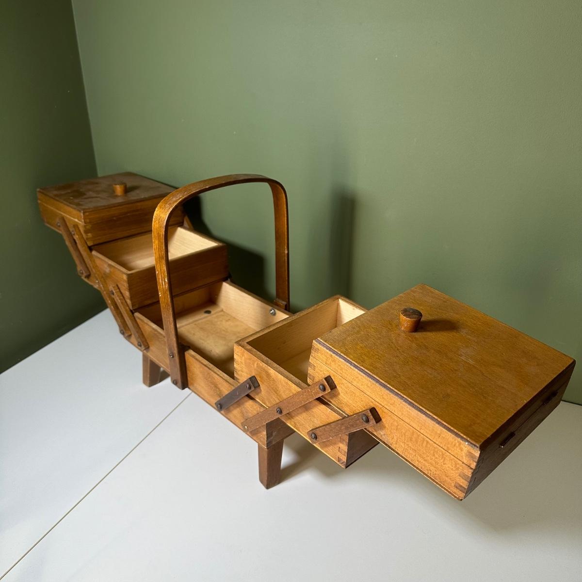 LOT 310S: Vintage Wooden Accordian Fold Out 3 Tier Sewing Box w/ Sewing Supplies, Tools, Cut n Press & More