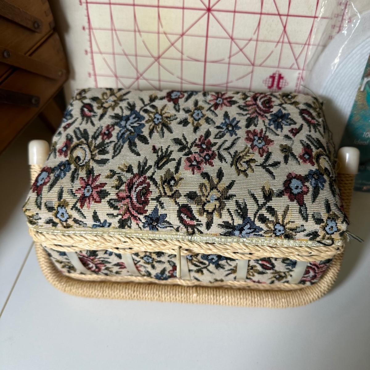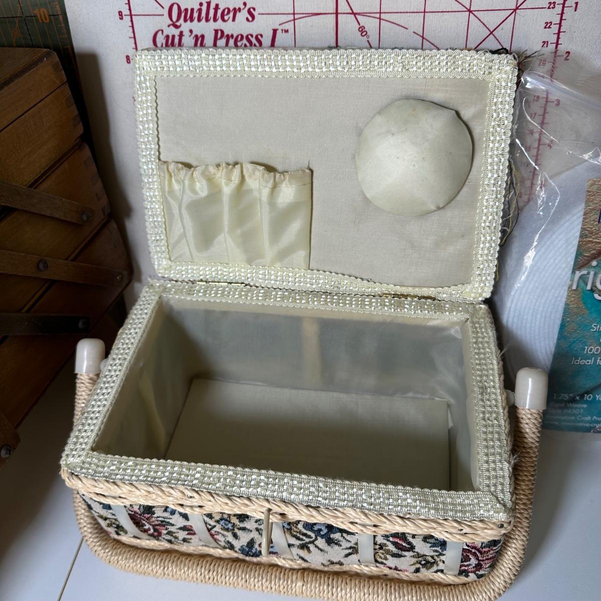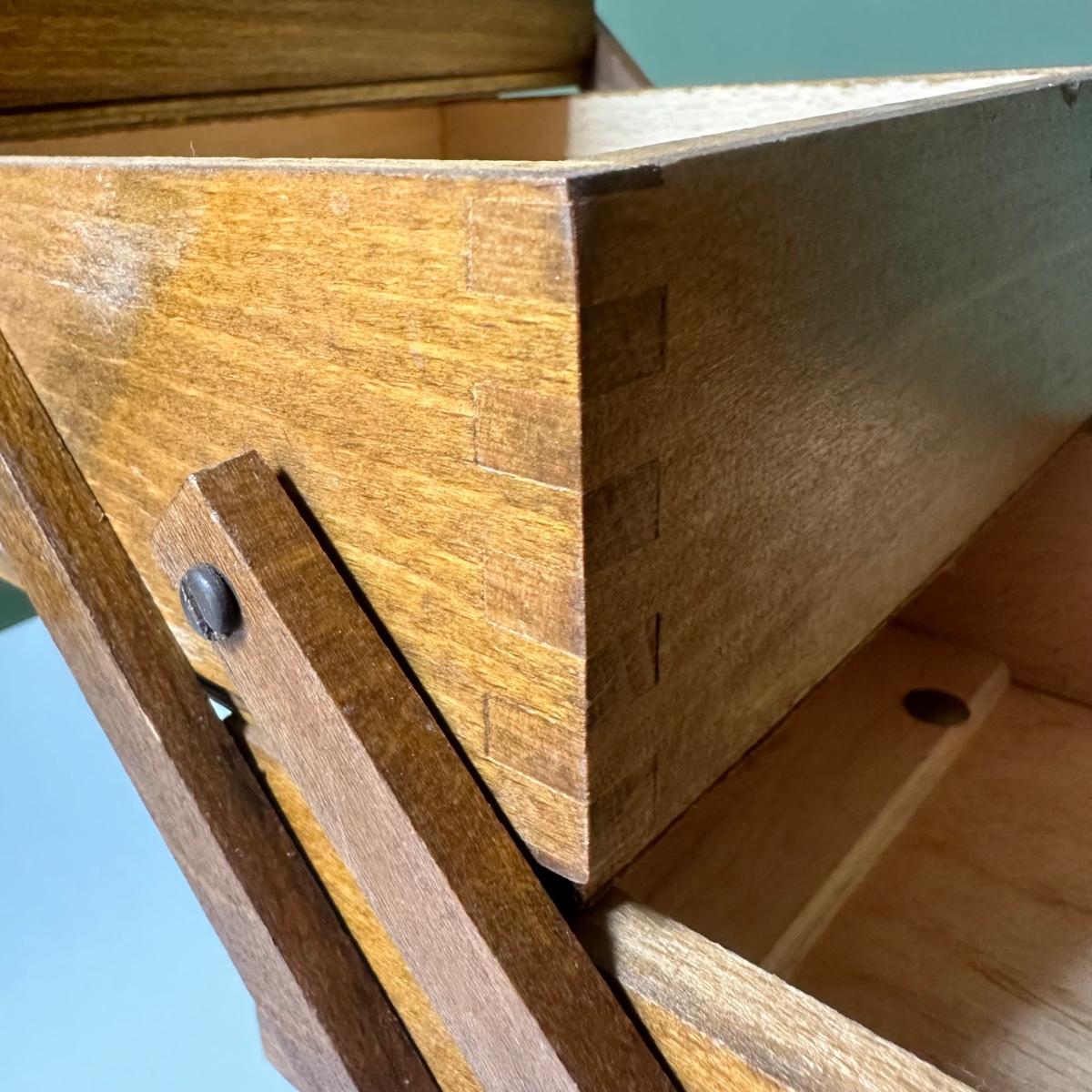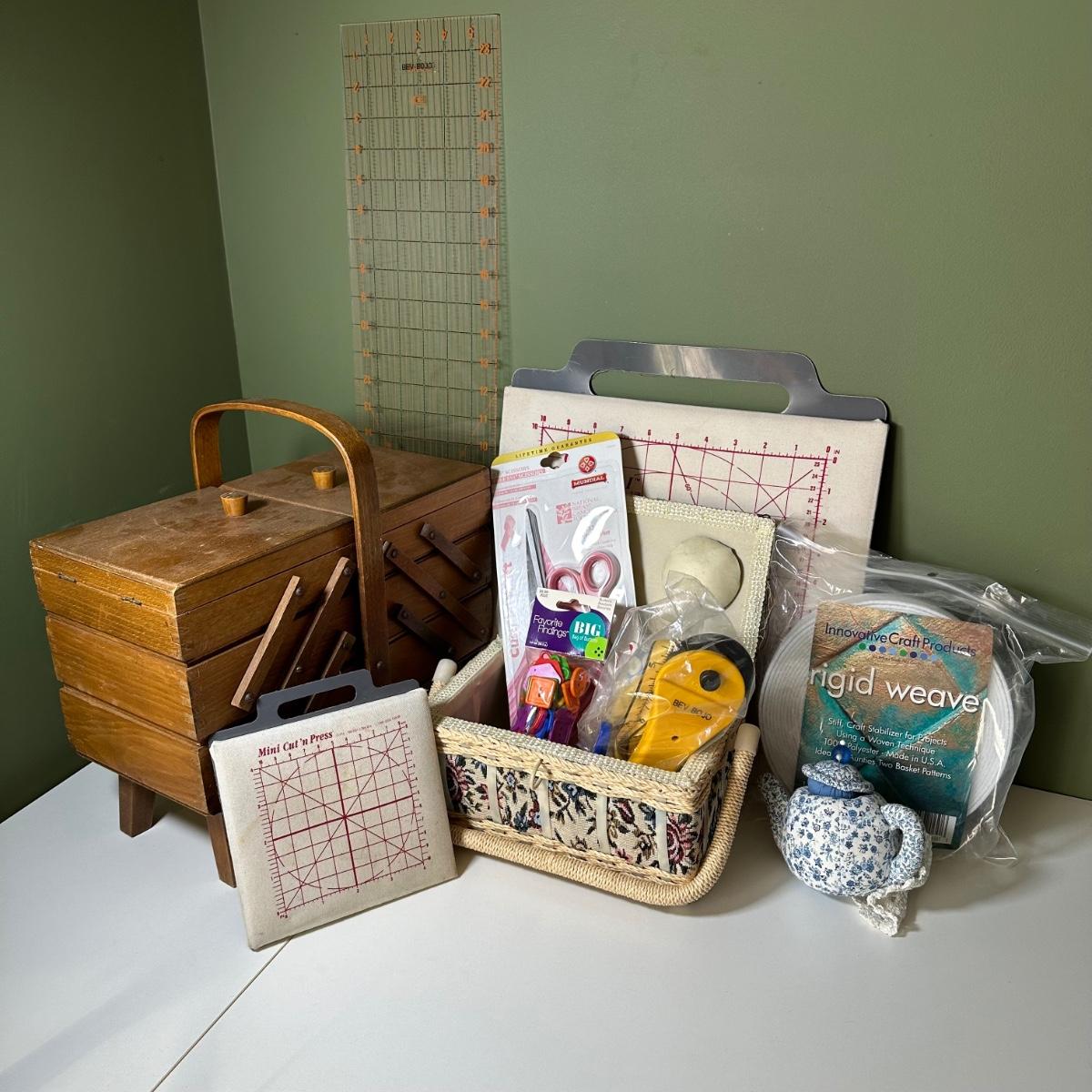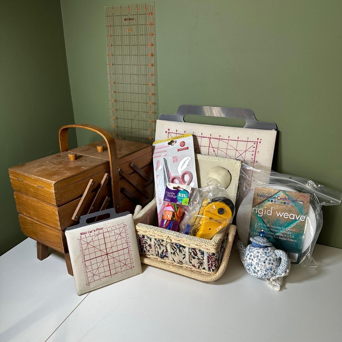 LOT 310S: Vintage Wooden Accordian Fold Out 3 Tier Sewing Box w/ Sewing Supplies, Tools, Cut n Press & More