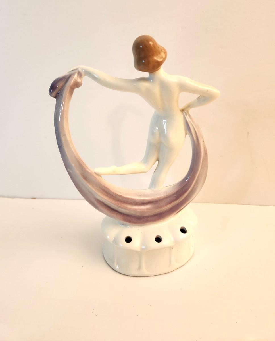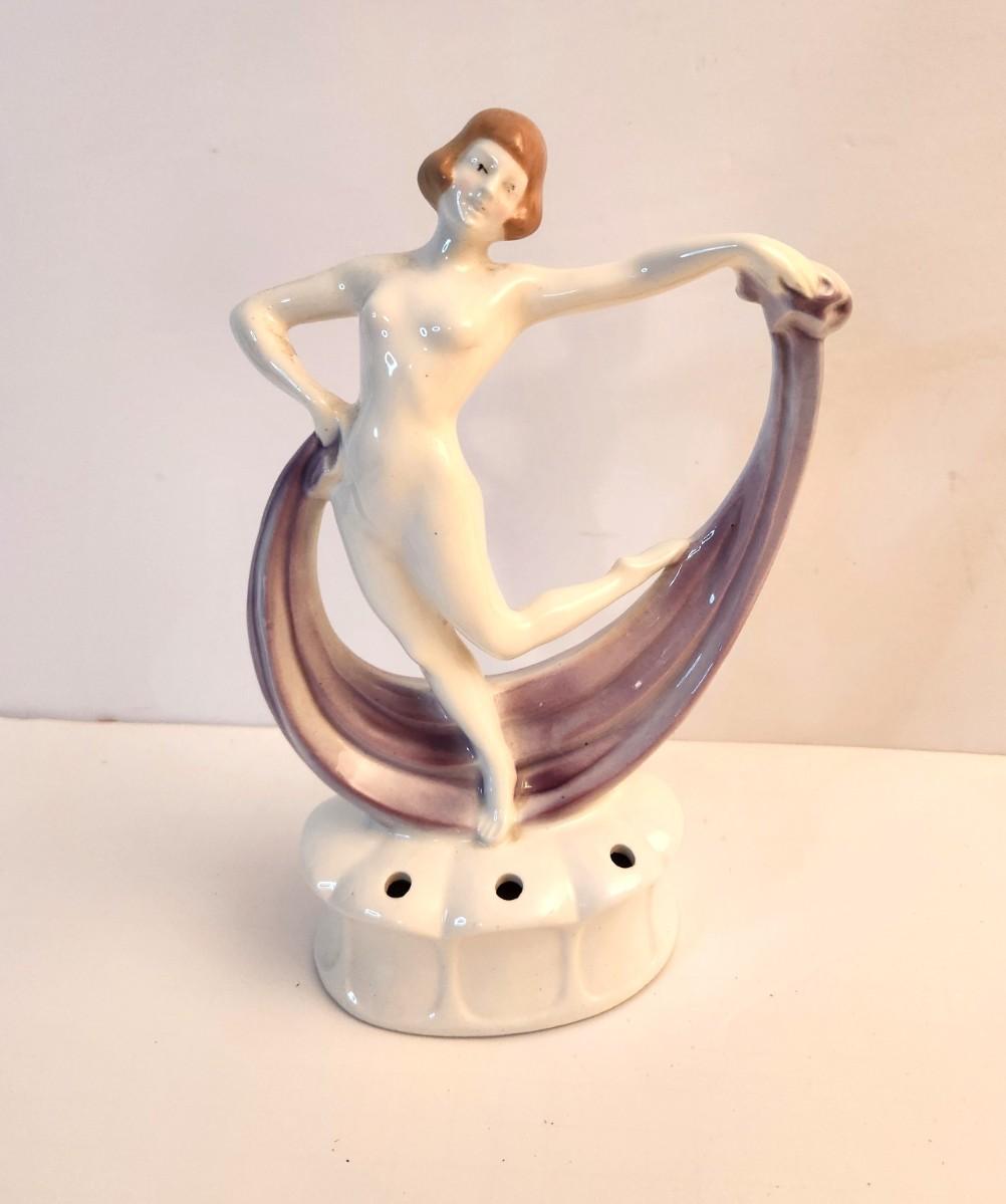 Beautiful antique Art Deco nude lady porcelain flower frog, marked "Germany." 14" tall, 6" across. She's a beauty.