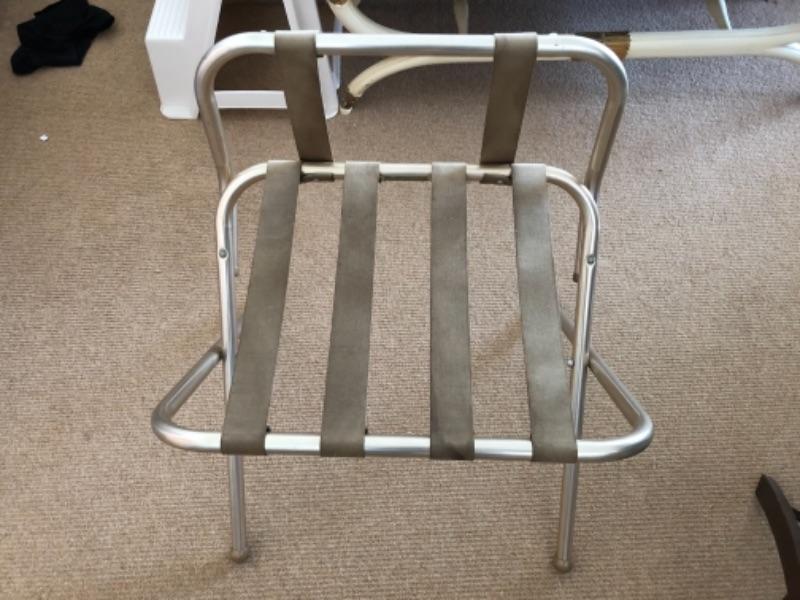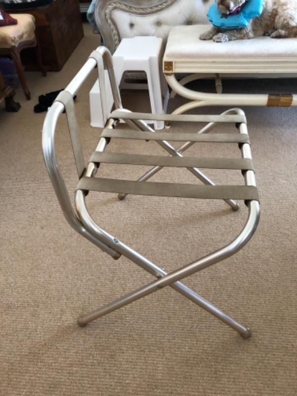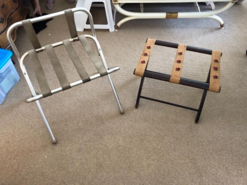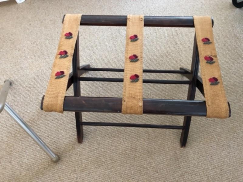 Lot 100U. Luggage racks“”1 aluminum, 1 vintage wood with embroidered straps-- $20