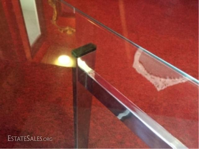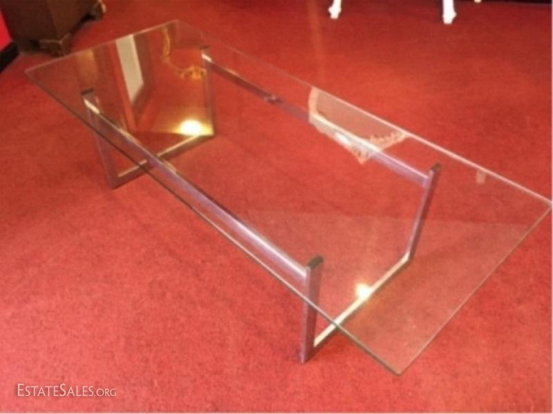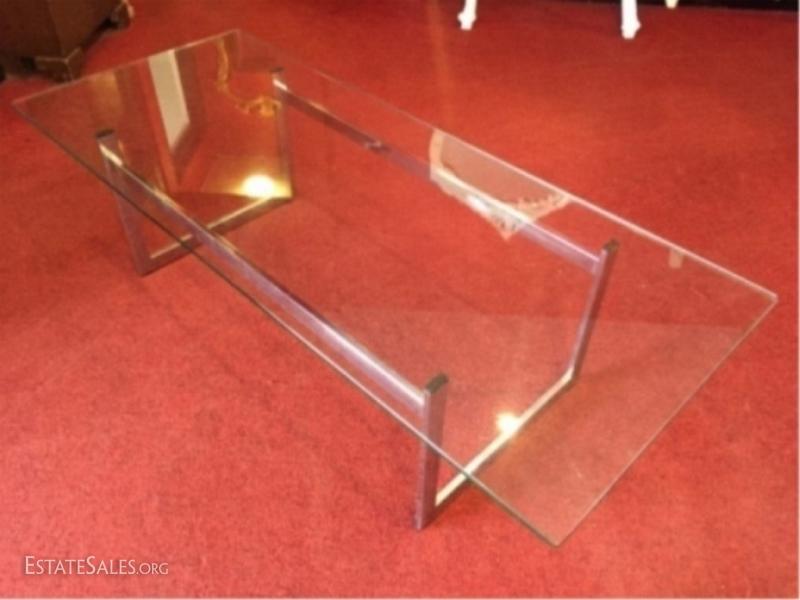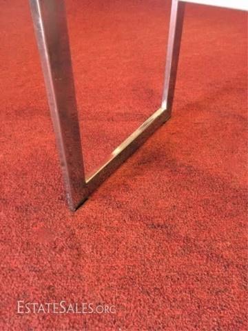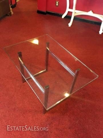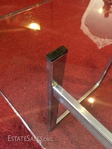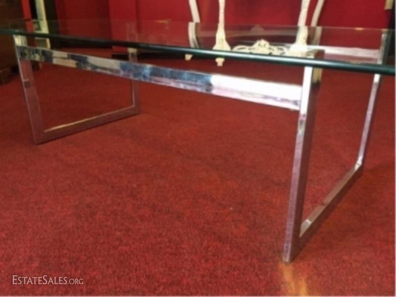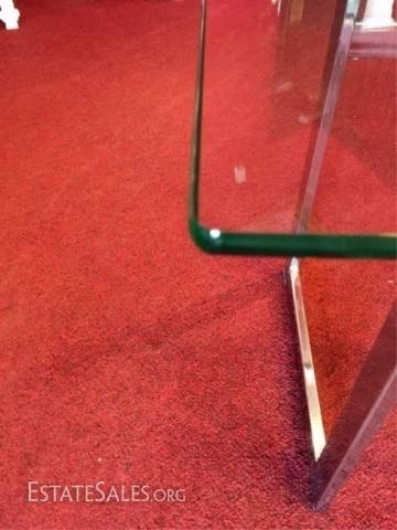LOT 101: 2 PC MODERN CHROME COFFEE AND END TABLE SET, CHROME STEEL BASES WITH GLASS TOPS, VERY GOOD GENTLY USED CONDITION, COFFEE TABLE MEASURES 60" X 25" X 15"H. SIDE TABLE IS 32" X 22" X 20"H, SKUJMD