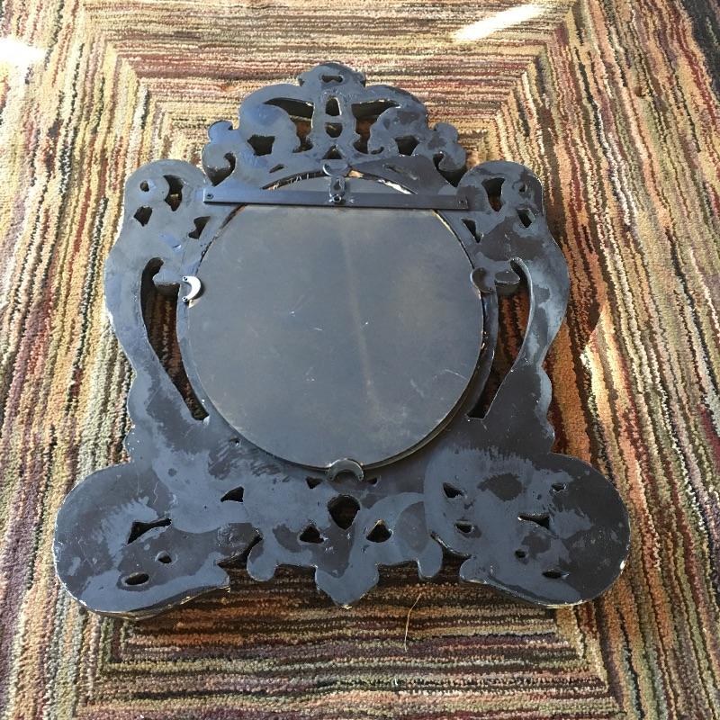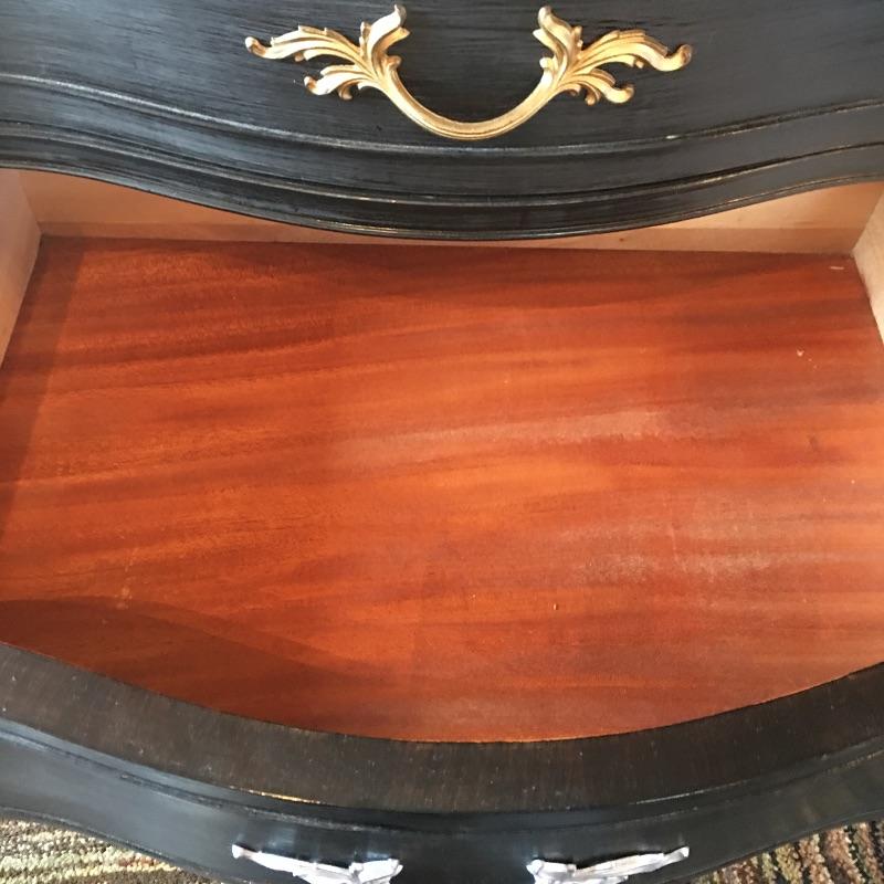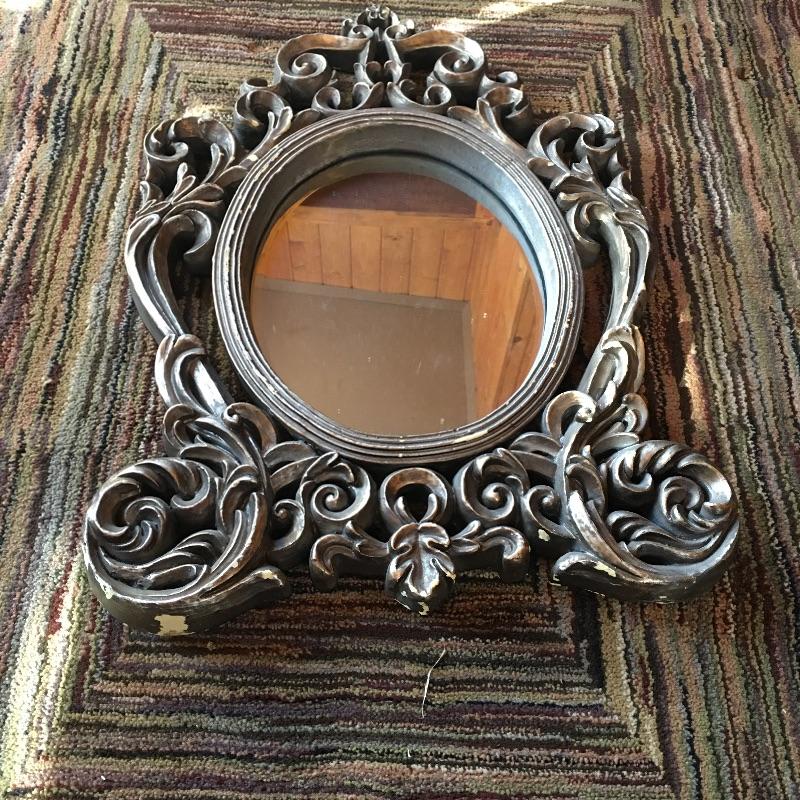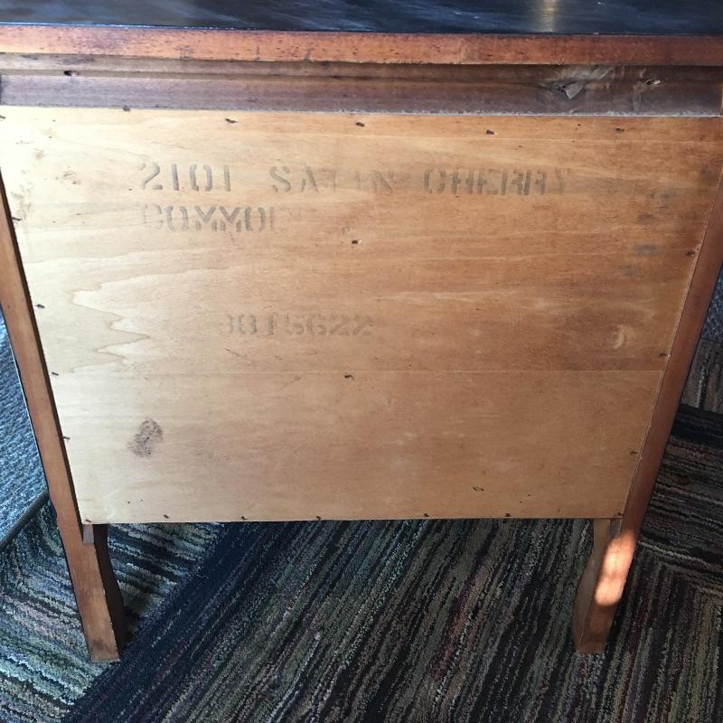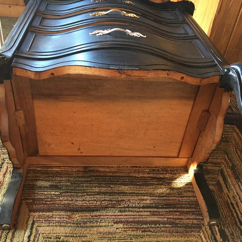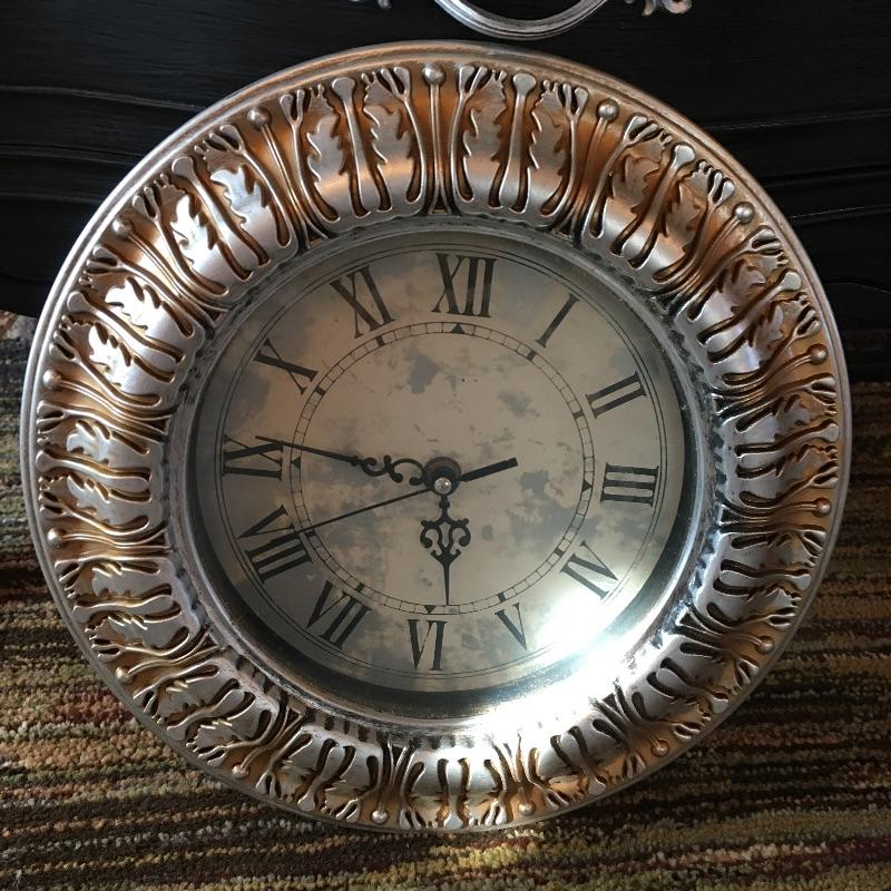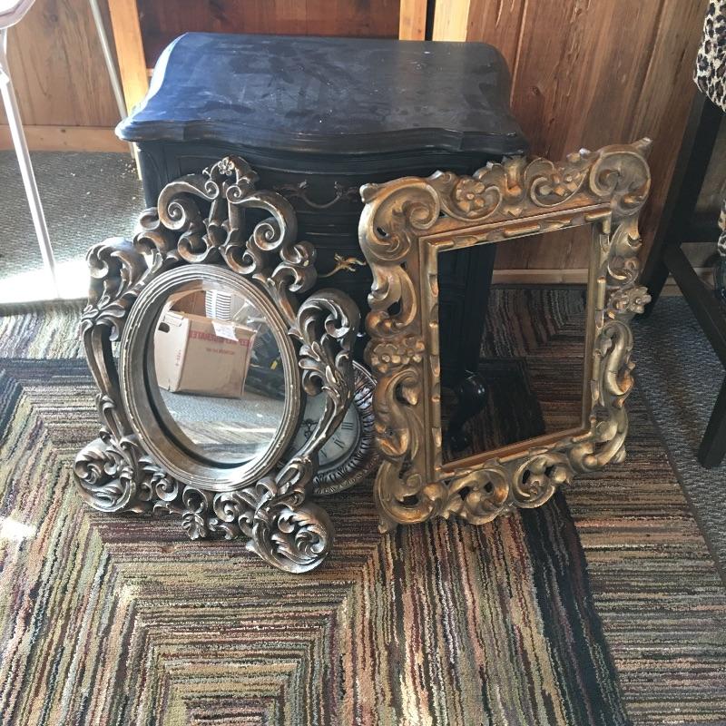 This collection of home furnishings includes area rug, three dovetailed drawer side table, clock, mirror and a plastic frame. Drawer side table measures 24” x 17”. Gold ornate frame measures 20.5” x 26” and the ornate mirror measures 19” x 26”.