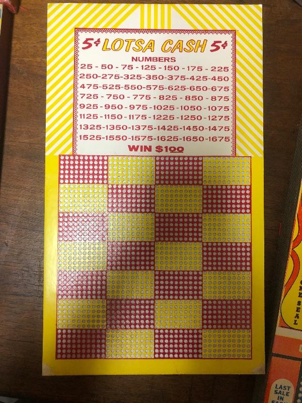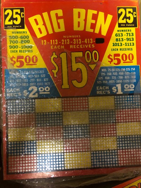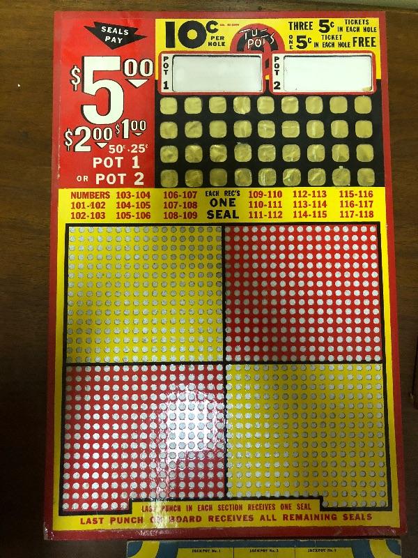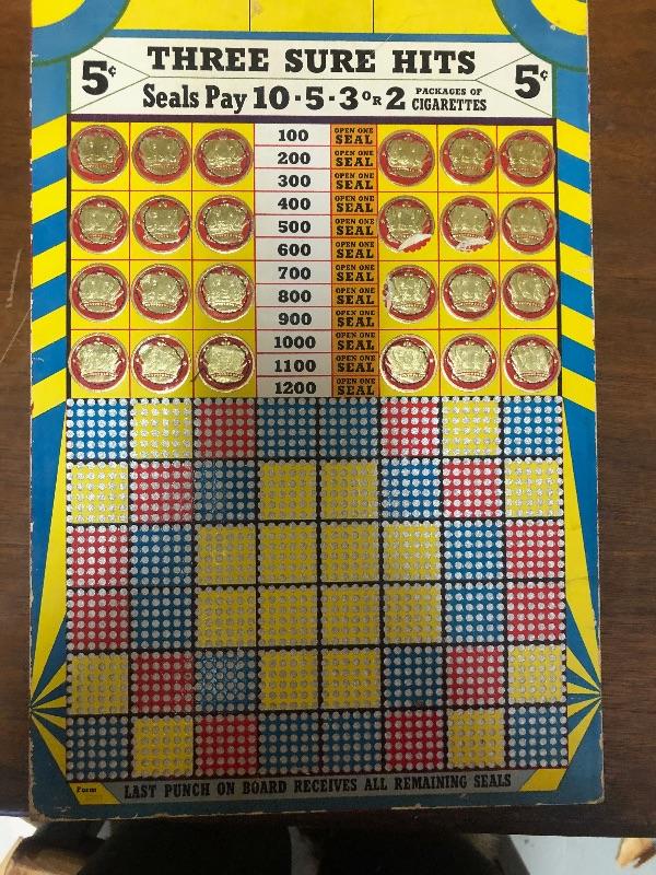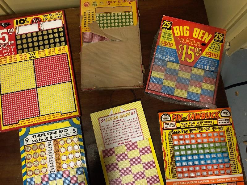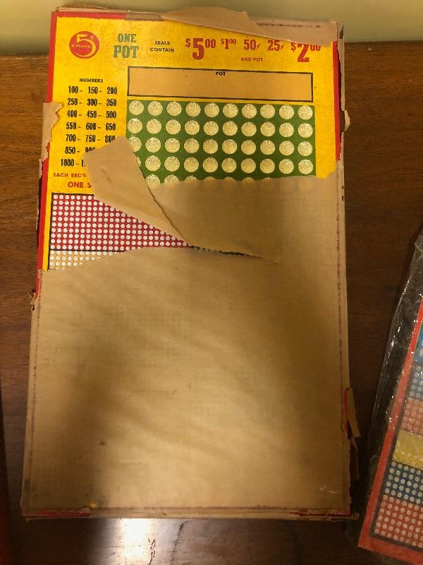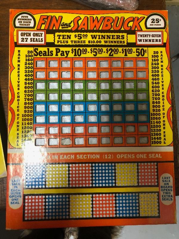 6 boards: Seals pay $5, one pot (partially wrapped), Big Ben(partially wrapped), Finn and Sawbucks, lotsa cash, three sure hitsVintage used condition