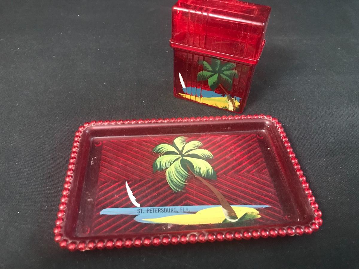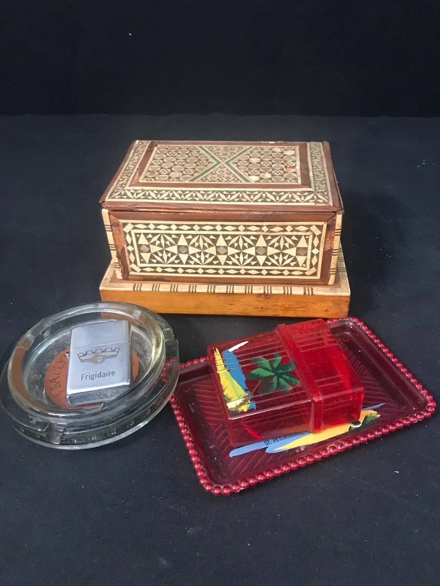 Vintage smoking paraphernalia - a music box desktop cigarette box, zippo lighter, ashtrays from Atlantic City casinos, and a plastic souvenir set from St. Petersburg, Florida including a tray and a cigarette pack protective case. The zippo lid doesn't stay clicked in place when closed and is untested and the desktop box is broken - the top of the box has come off. Please see all pictures as they are the best representation of the items. The pictures show condition, measurements if taken, and what is included in the lot. Due to the large amount that we photograph and the time frame, we are not always able to take measurements. All items unless noted, are pre-owned and have been used. If you purchased furniture, you must bring help. We do not allow one person to carry large furniture out on their own. Bring help, tools and a truck for the safety of our client’s homes, and your personal safety. Company policy. Thank you.