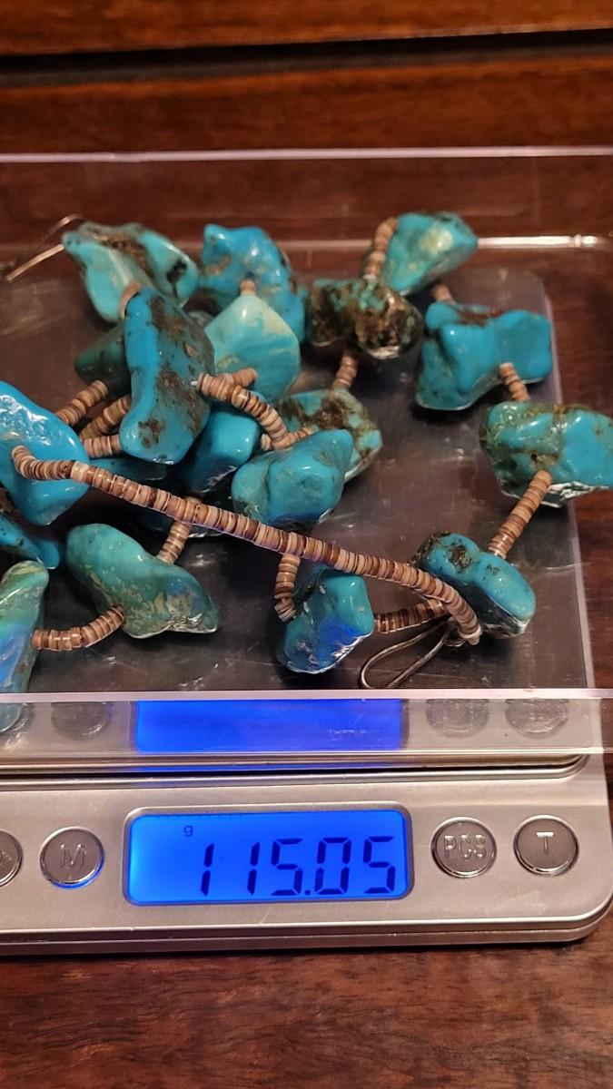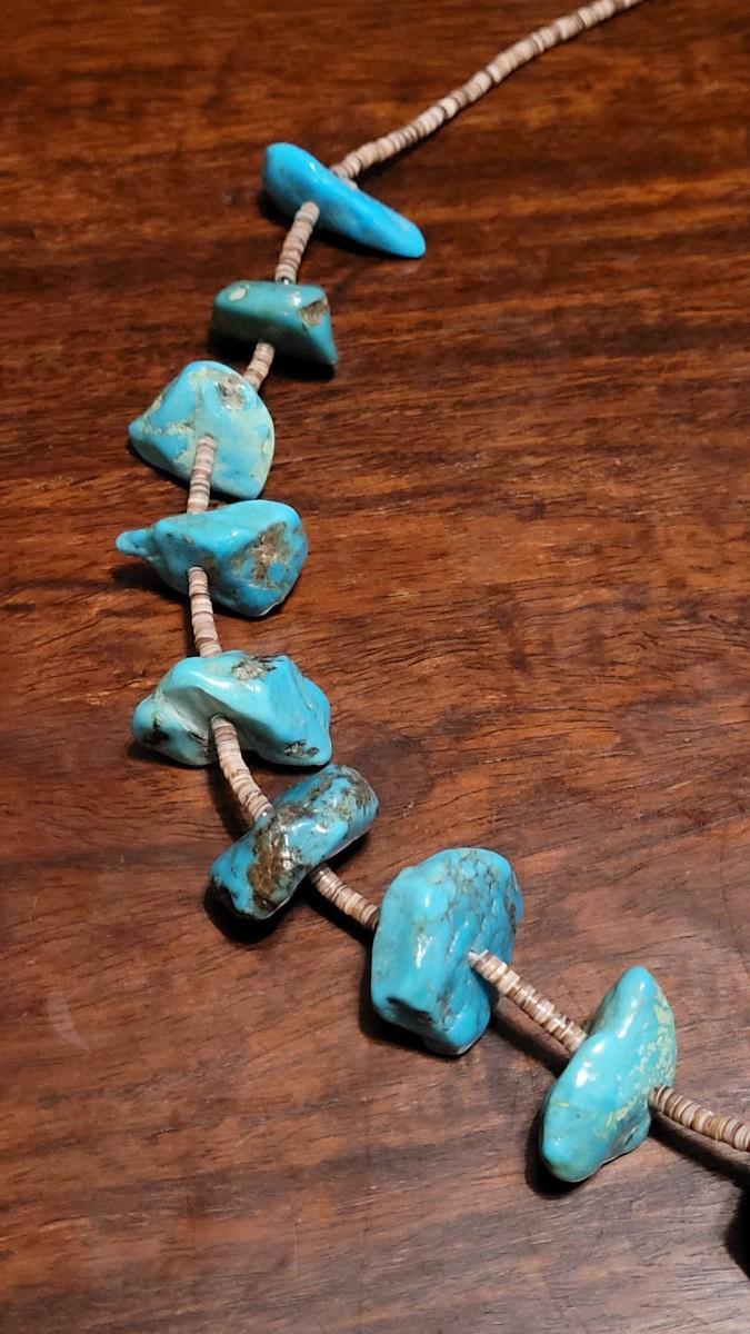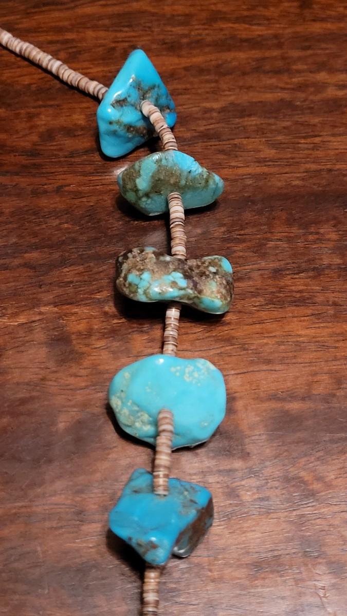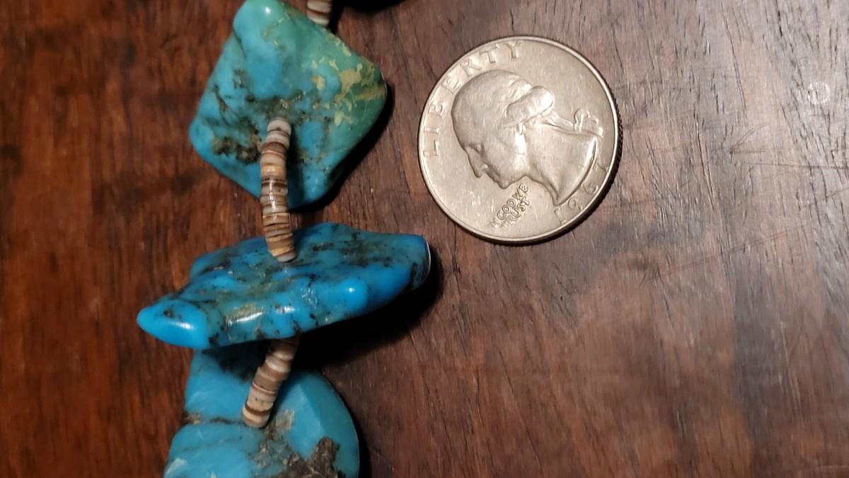 This beautiful Santo Domingo necklace is 29.5" long. The turquoise comes from the Royston turquoise mines paired with shell heishi beads. The stones are around the size of a quarter. True statement piece.