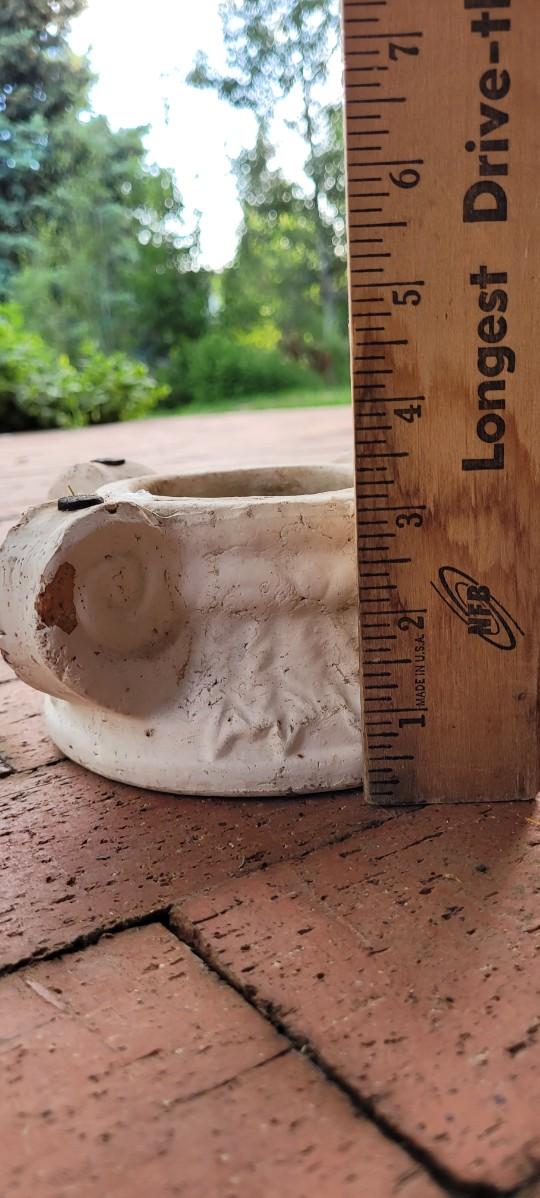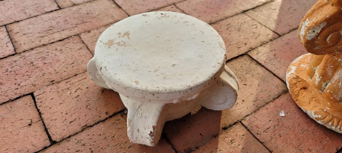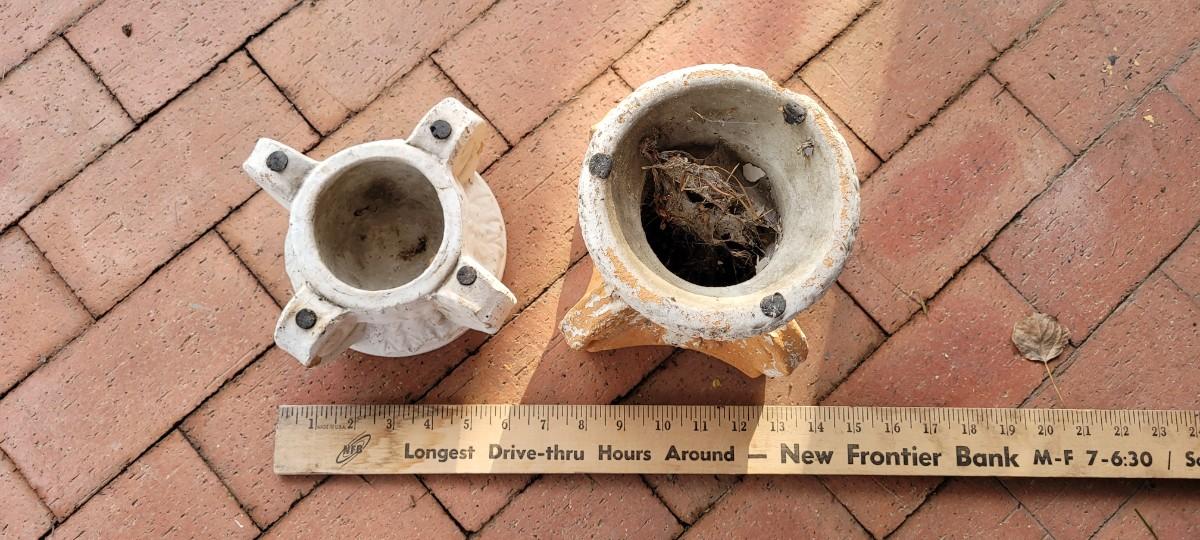 Both of these vintage clay composition garden stands appear to be in nice condition with wear consistent with age and general outdoor use.