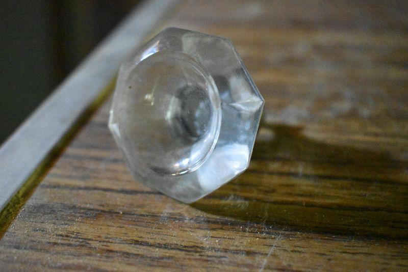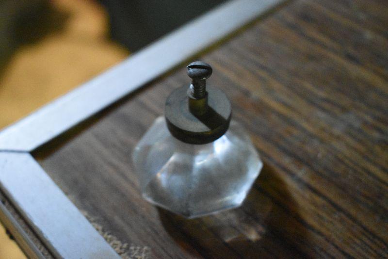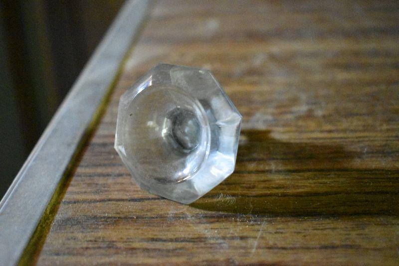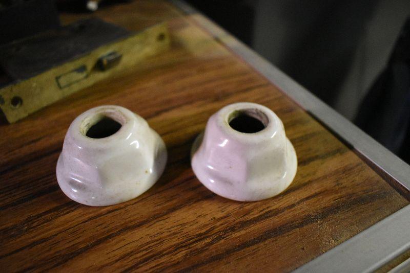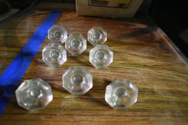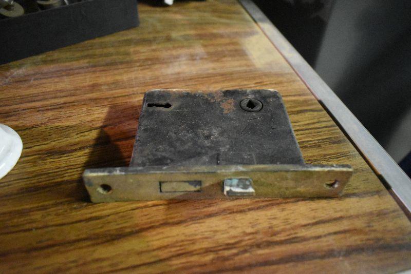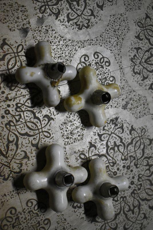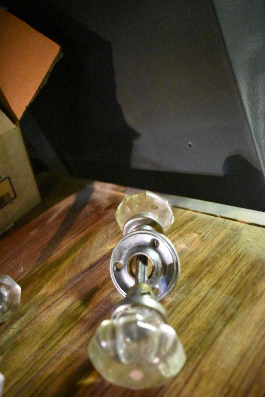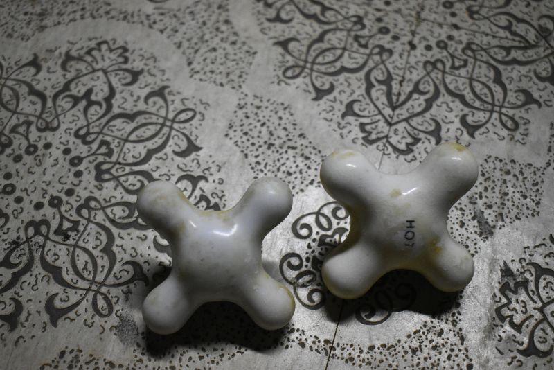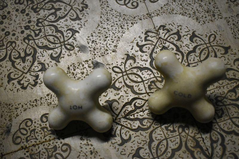 Porcelain sink knobs, glass door knobs, and metal locks.