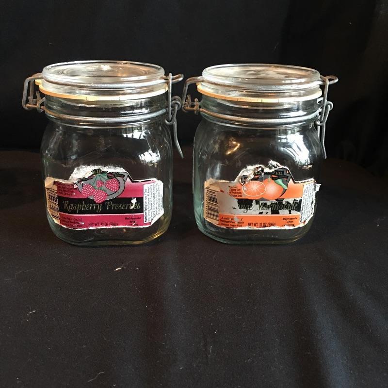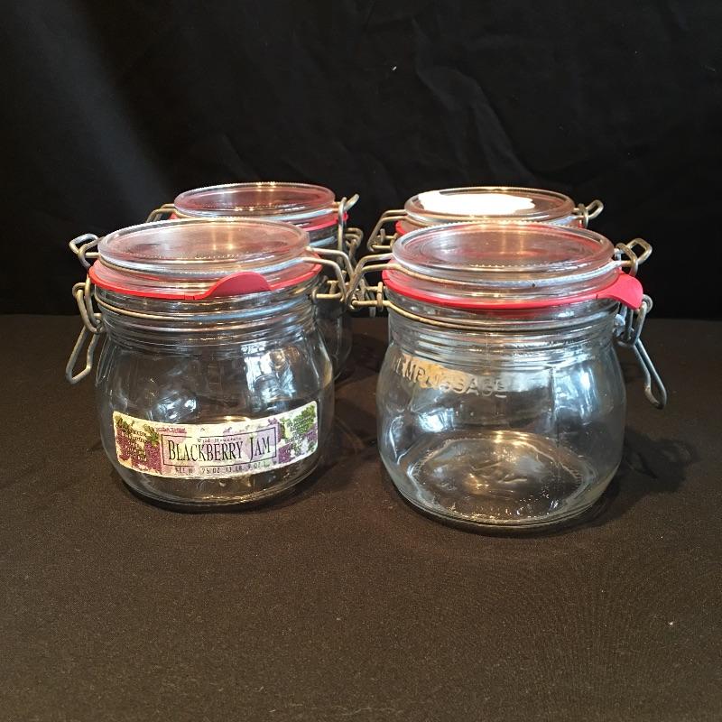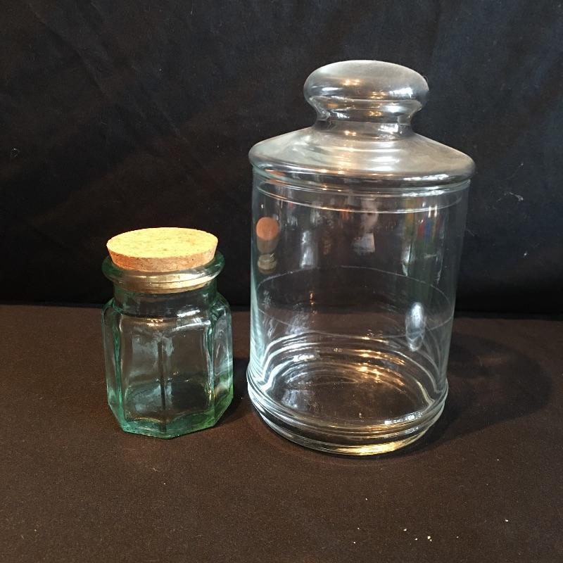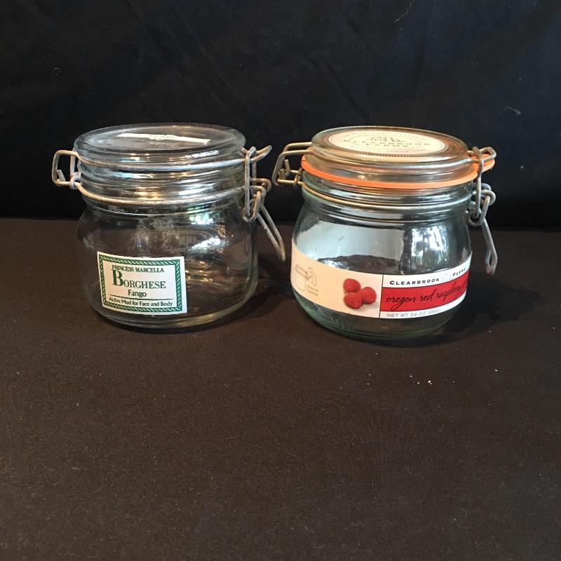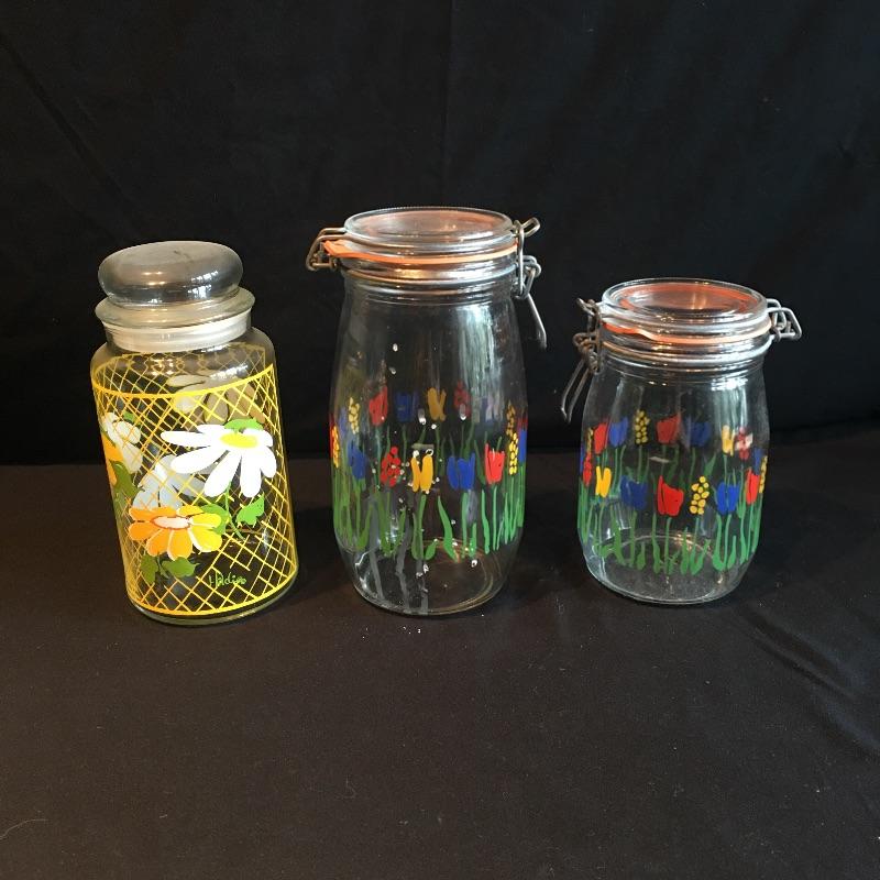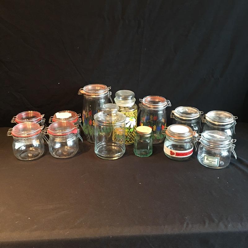 A nice selection of glass jars to store food or use them to store items for your screws or even crafts. Lot includes ten glass jars with clamp lids and two jars with set on lids and one jar with a cork lid. Largest jar measures 4.50D x 9” tall.