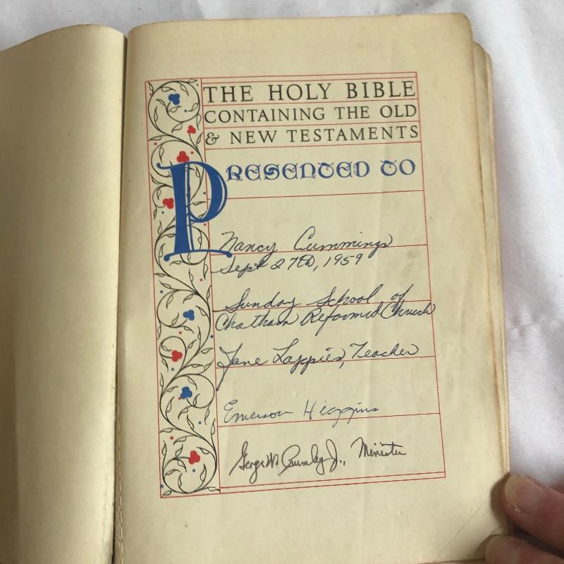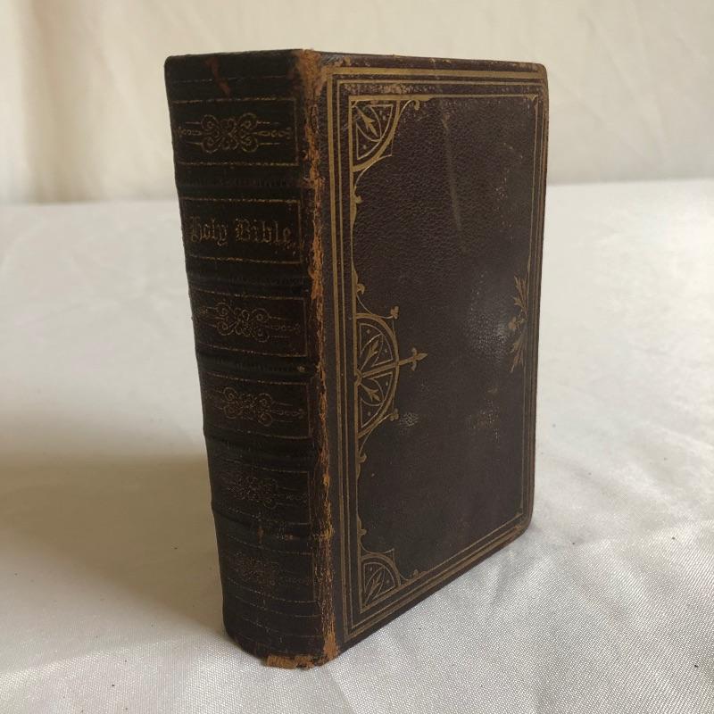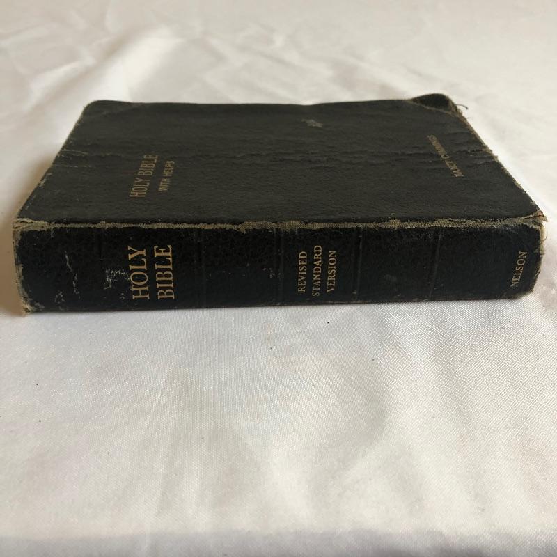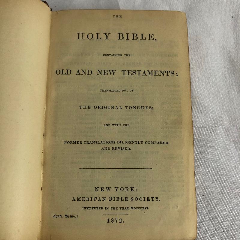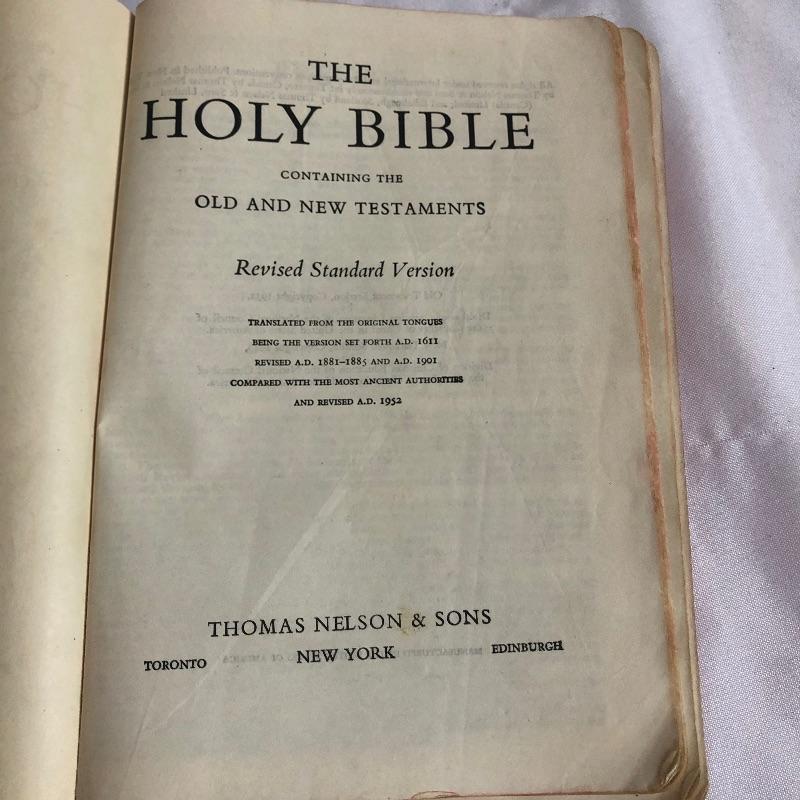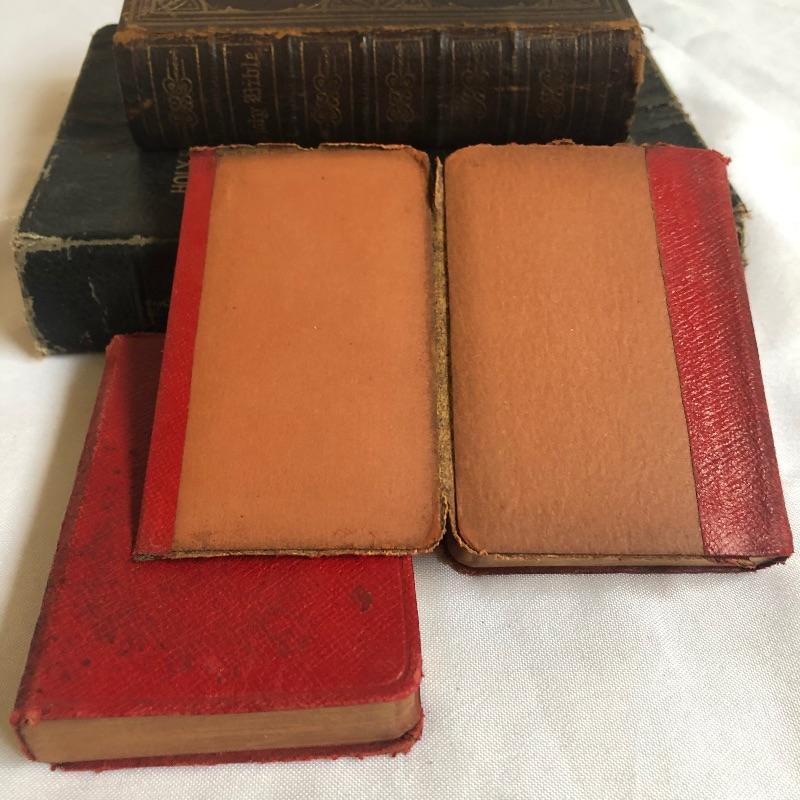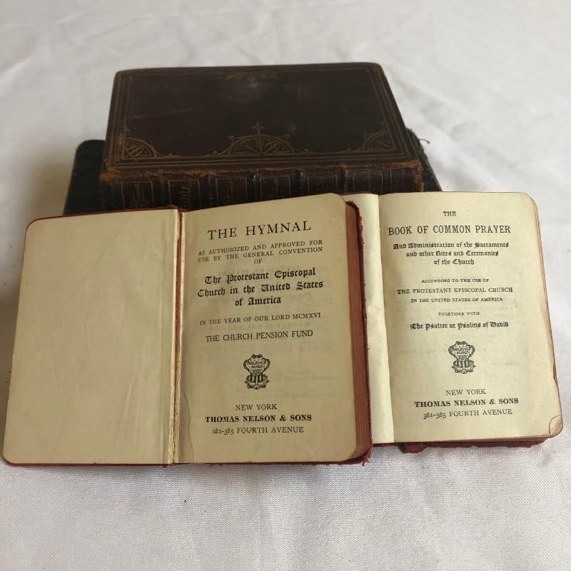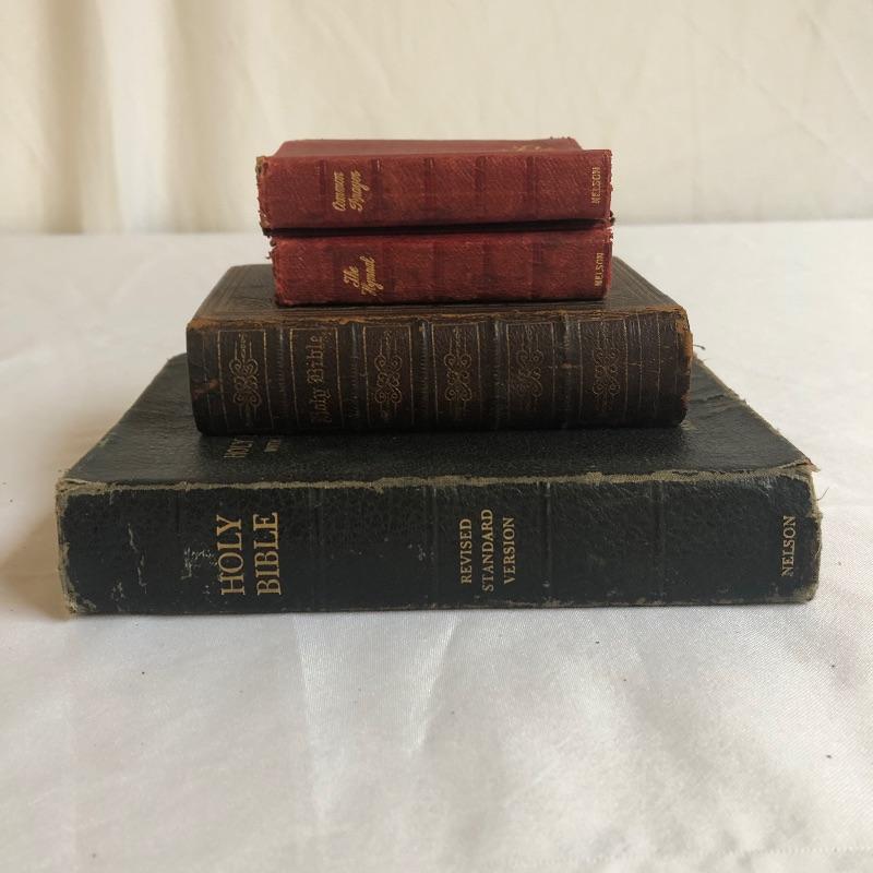 Included are two Bibles, a Book of Common Prayer and a Hymnal. Each are aged but in fine enough condition. The Book Of Common Prayer and Hymnal have a copyright date of 1920 and measure 4” x 3”. One of the back covers is slightly damaged. The smaller of the two bibles measure 5.5” x 3.5”. It has gold lettering and design on the cover and is dedicated on the inside pages. This Bible has a copyright date of 1872. The large of the two bibles measures 7.5” x 5.5”. The name Nancy Cummings is stamped on the front cover and there is a dedication to her inside the book. This bible is dated 1952. Shipping Available.