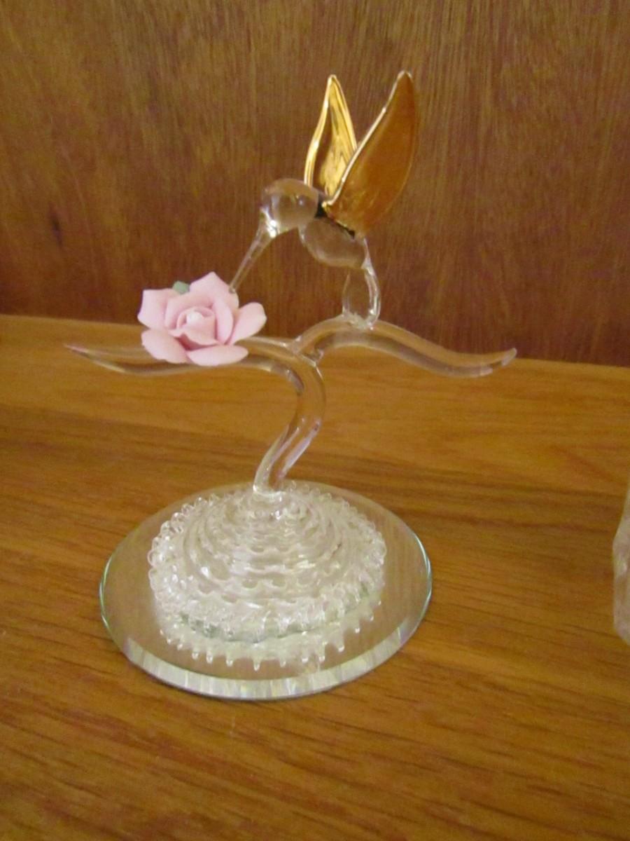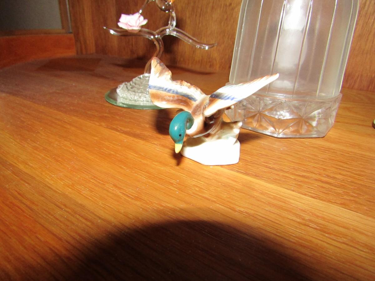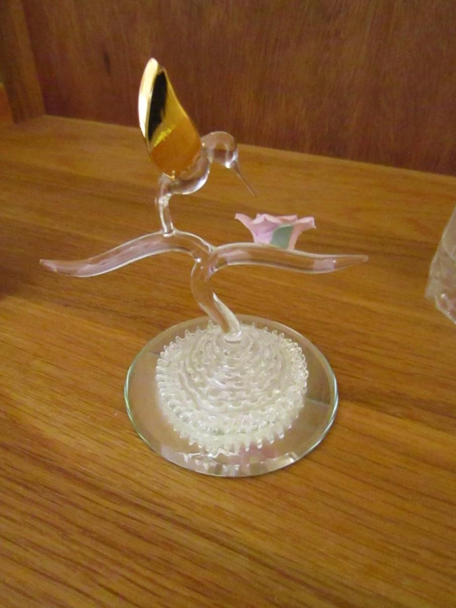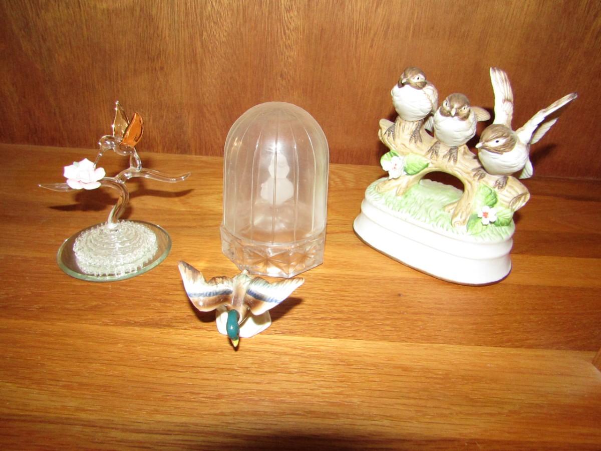 GLASS BIRD IN A GLASS BIRDCAGE, PORCELAIN DUCK AND GLASS HUMMING BIRD