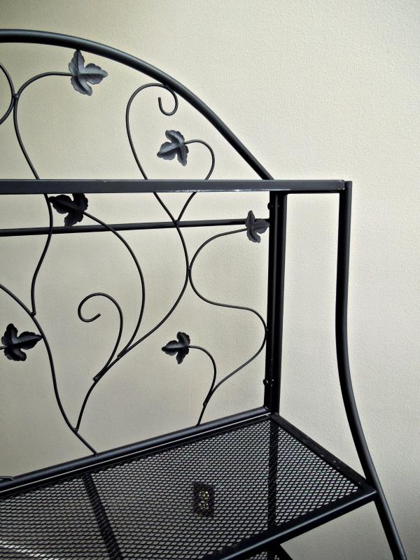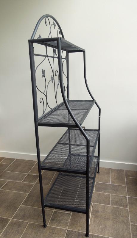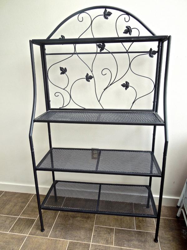 Black metal mesh shelves bakers or gardening shelves. Does not fold, however shelves are removable. Dimensions are 65 x 36 x15. No damage noted. Disassembles.