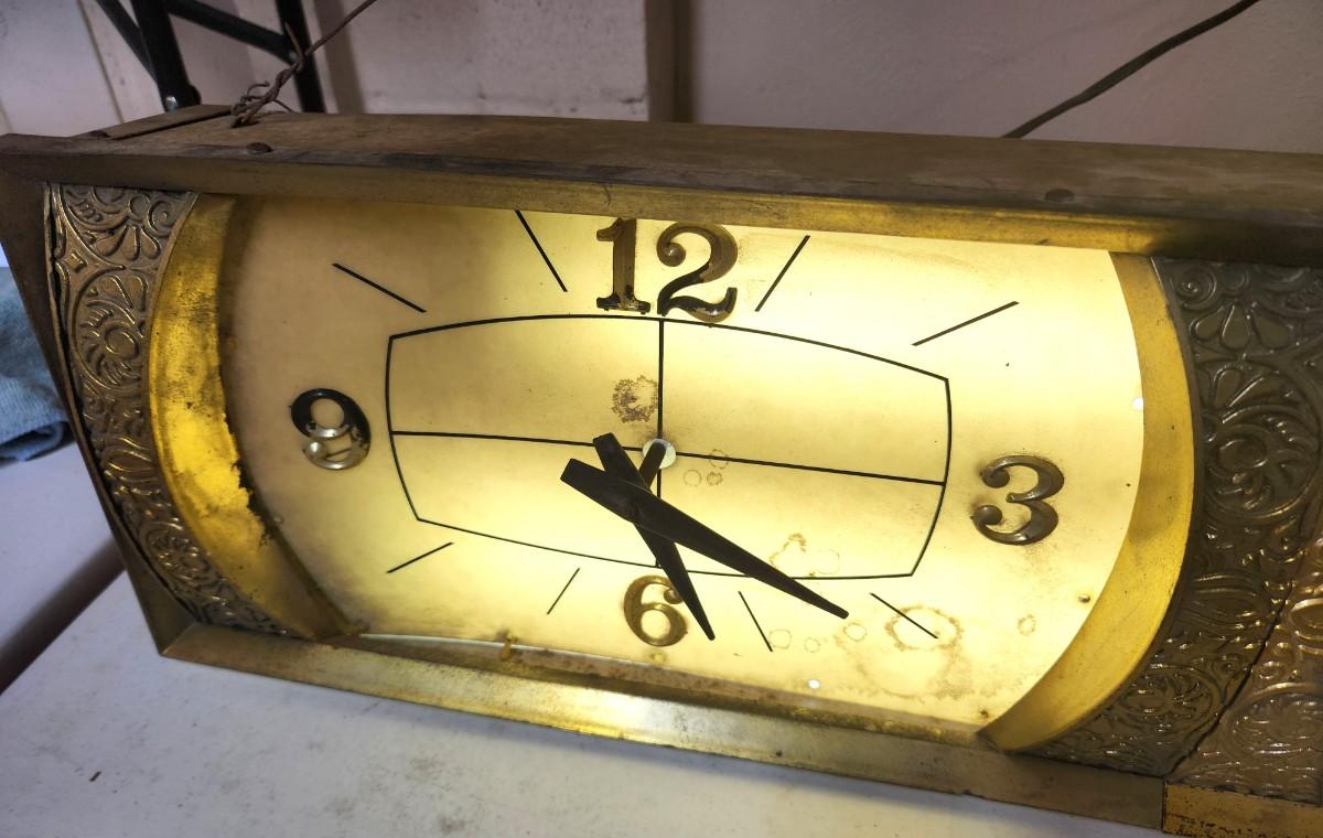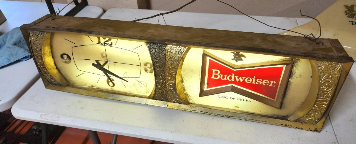 This vintage Budweiser Beer lighted sign is a project piece - lights up, pull cord works, clock does NOT work. Needs cleaning up. 31.5" long, 6" tall.