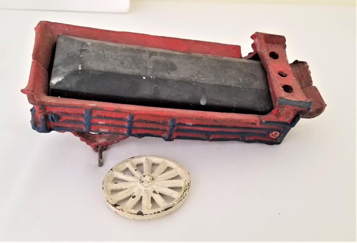 This contemporary cast iron toy is 28" long and 6.5" tall - back wheel on wagon will come off - need bolt to keep in place. Otherwise, good.