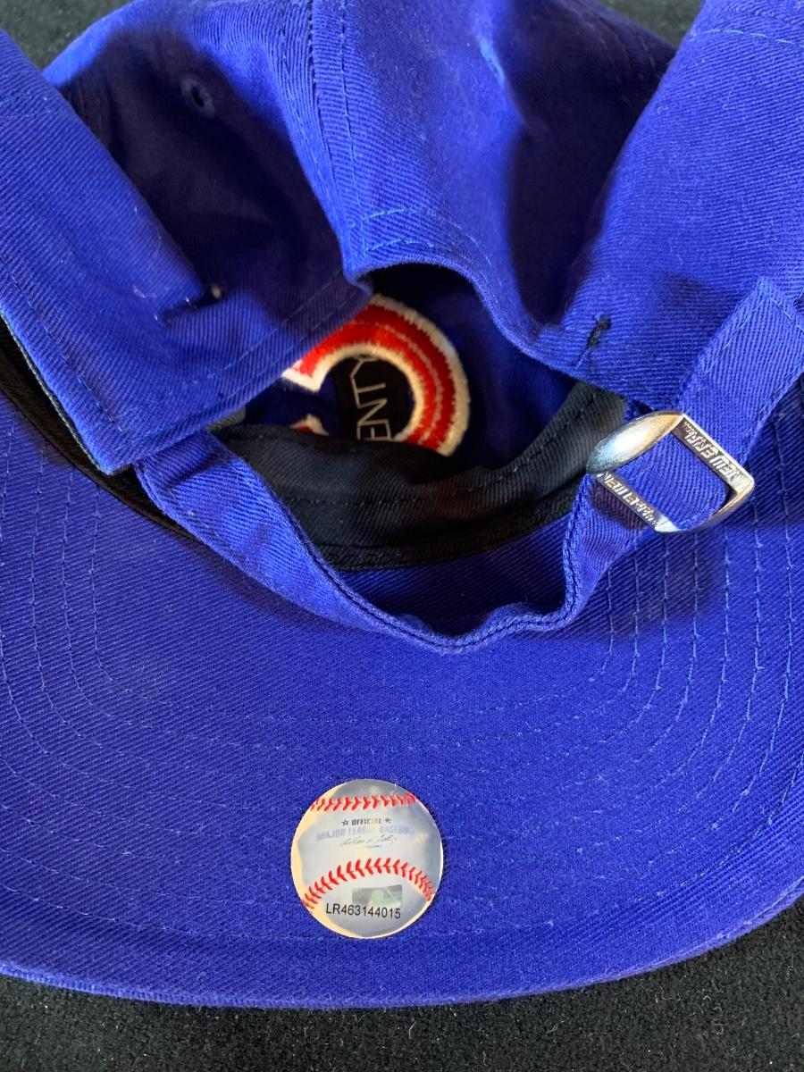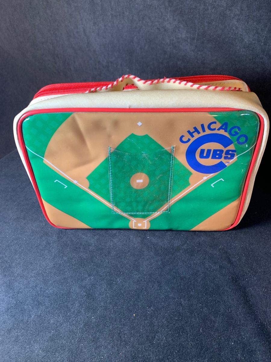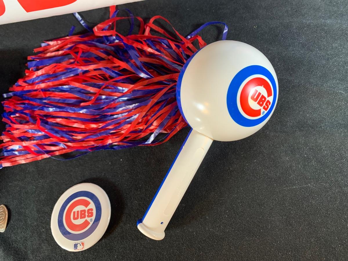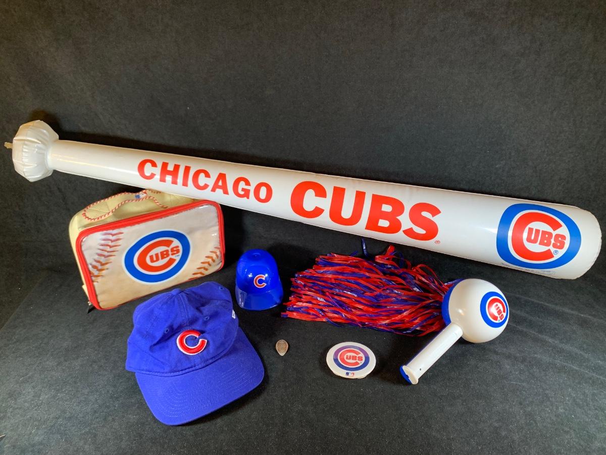 Adorable Chicago Cubs lunchbox, inflatable bat, baseball hat ice-cream holder, New Era Cubs adjustable baseball hat, plastic noise maker/pom pom and pin.