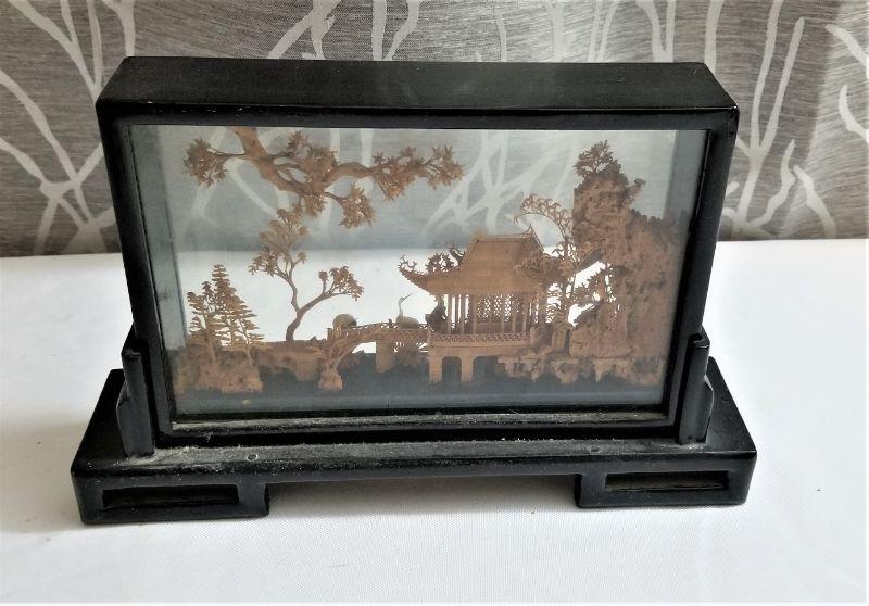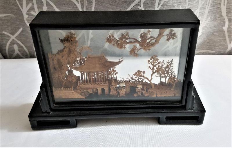 Well executed Asian temple scene done entirely in cork - very delicate - good condition. Black lacquer display case. Measures 9" x 6".