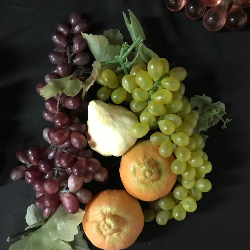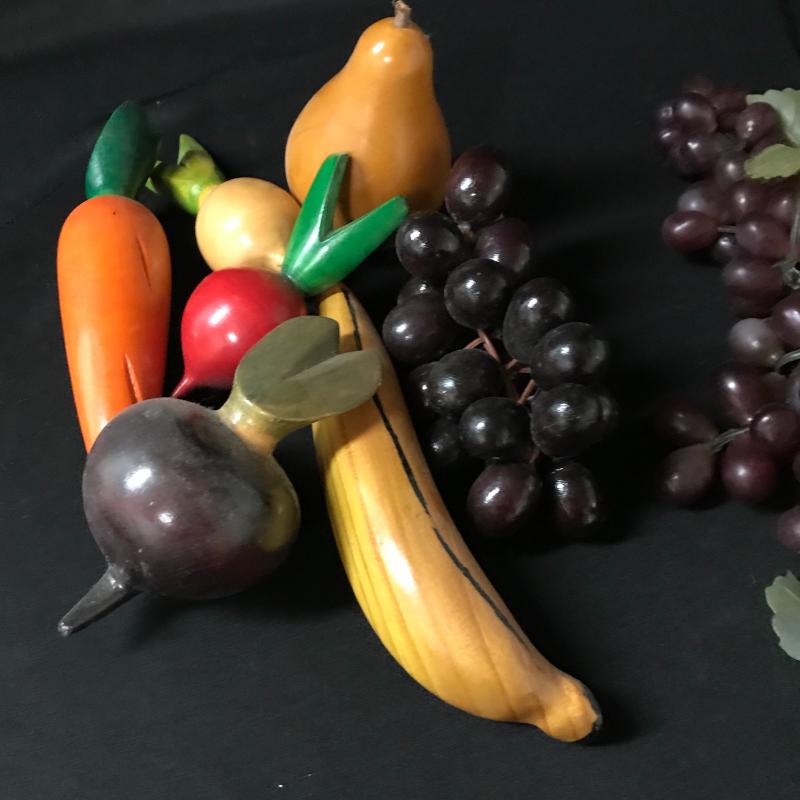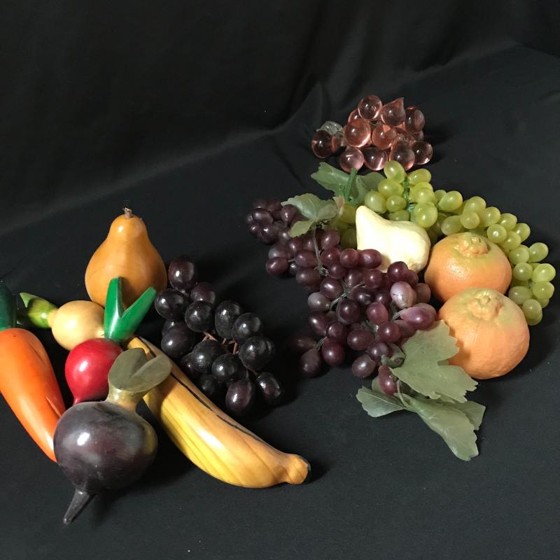 Three collections of fruit in different mediums. 7 pieces of wood painted fruits and vegetables. 5 pieces of plastic fruits and herb. One wire and glass grape collection. Two pieces unattached. This lot is available for shipping or local pick up in Asheville, NC.