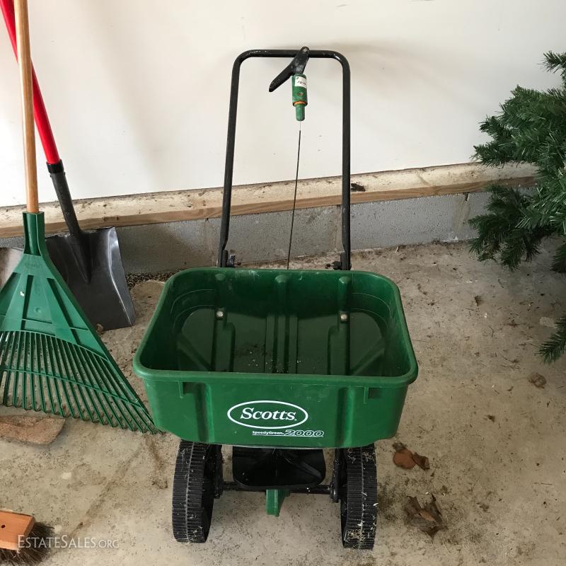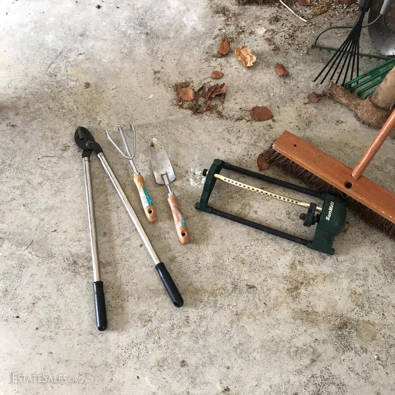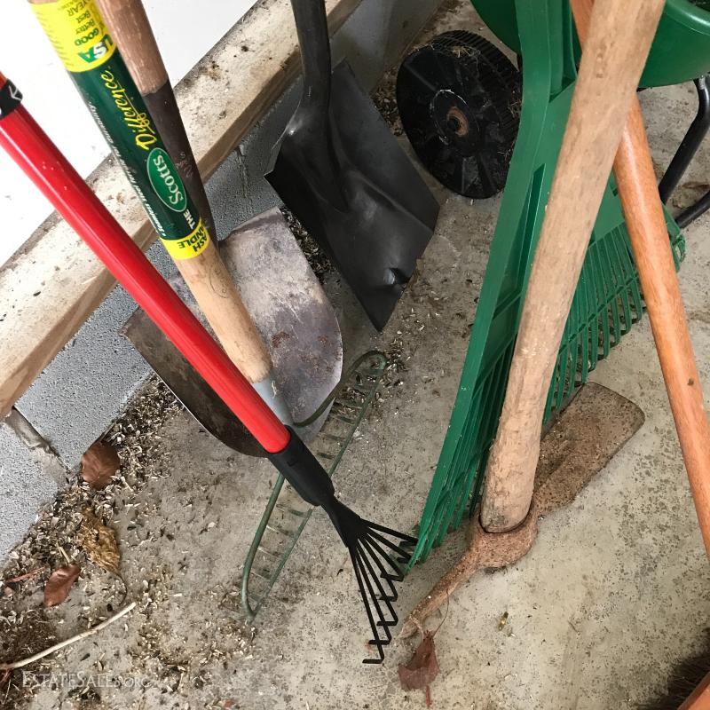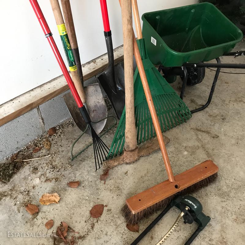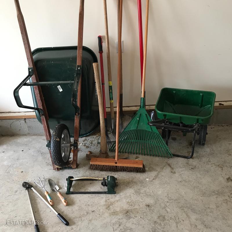 Basics for your first home or good replacements if things are worn out. Solid wheel barrow, shop broom, 2 shovels, 3 rakes, clippers, sprinkler, seeder, pick axe and more. This lot is available for local pick up in Mills River, NC only.