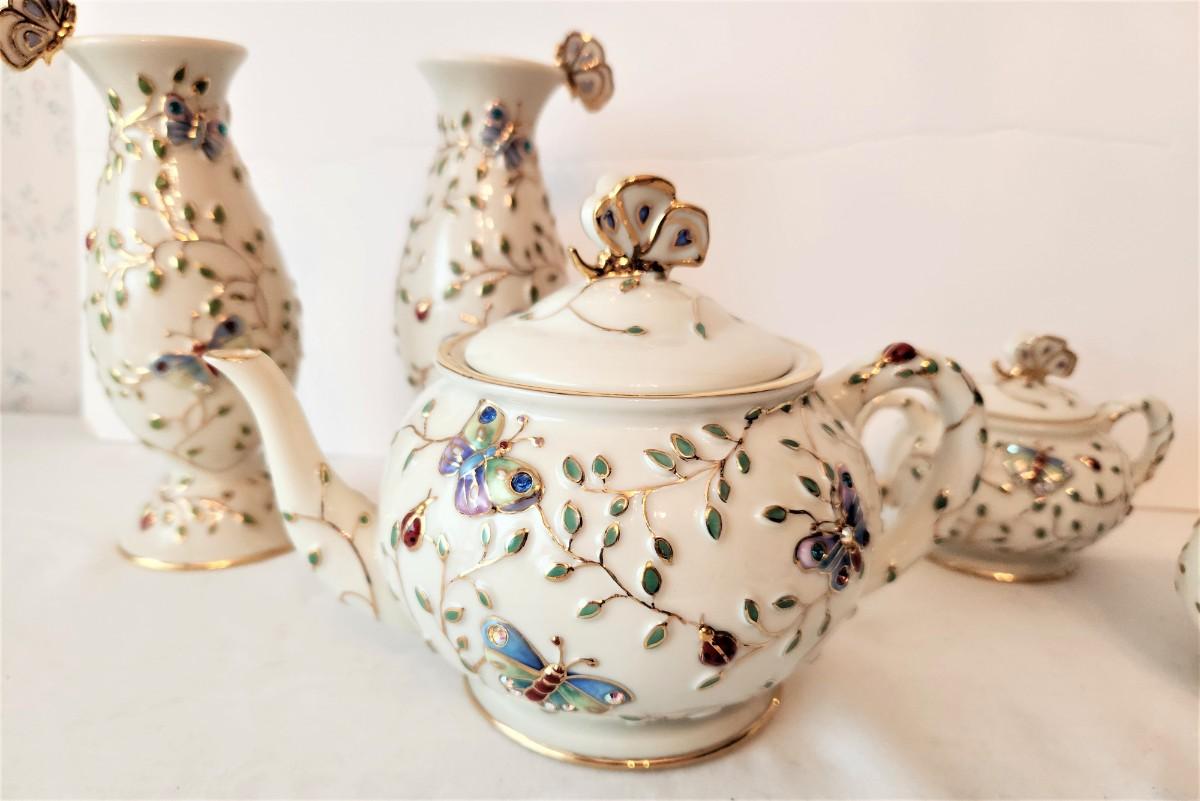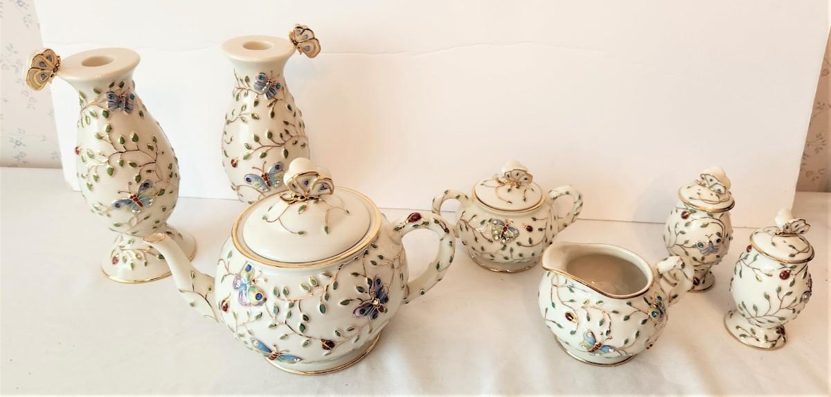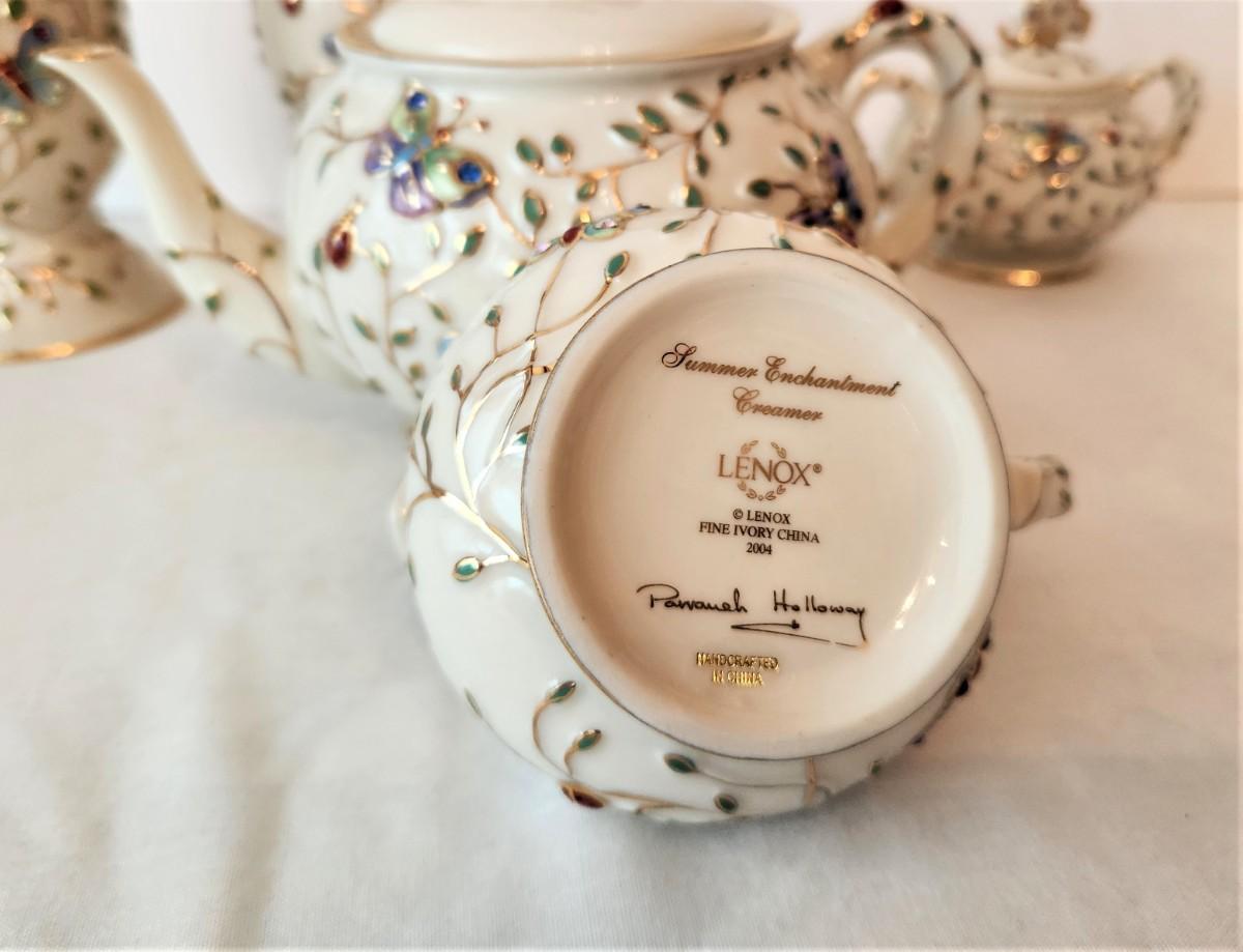 Complete LENOX porcelain "Summer Enchantment" tea service - 7 pieces. Made in 2004, good condition, no box. 2 candlesticks (each 7" tall), tea pot, sugar/creamer, cup/saucer.