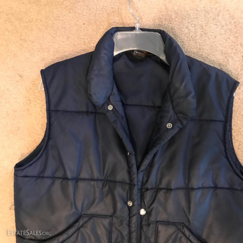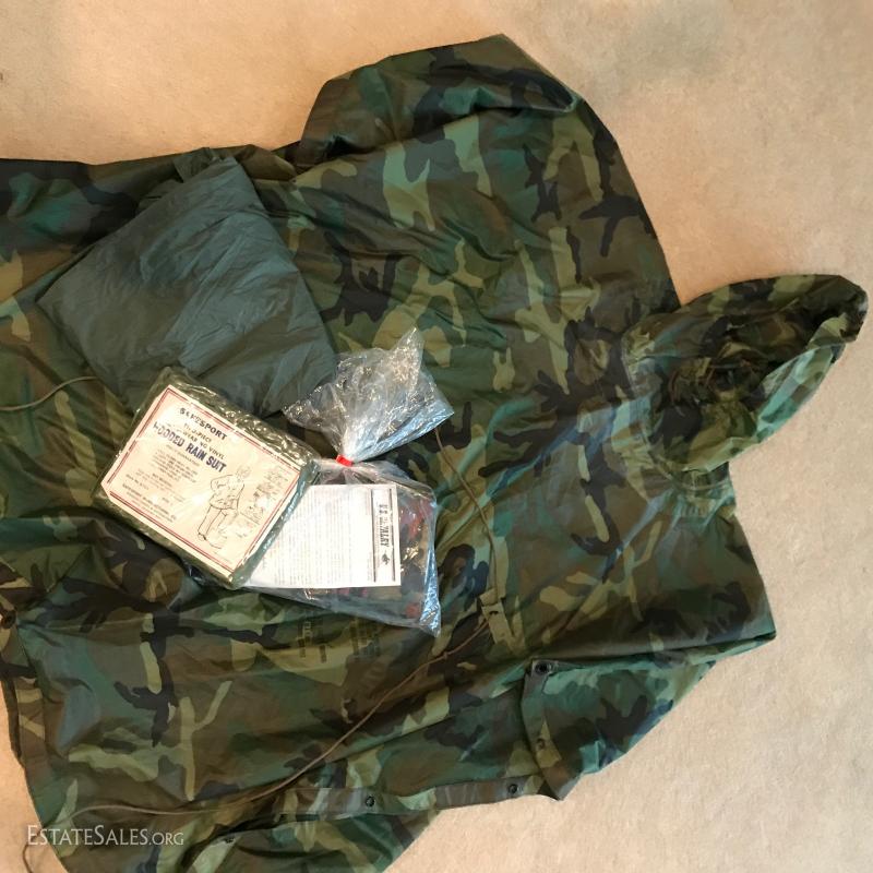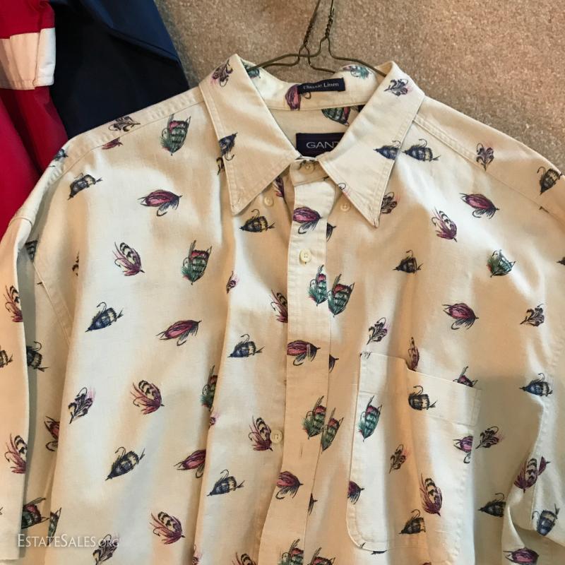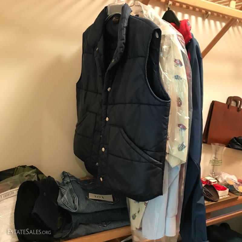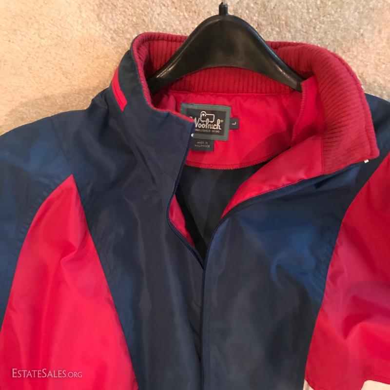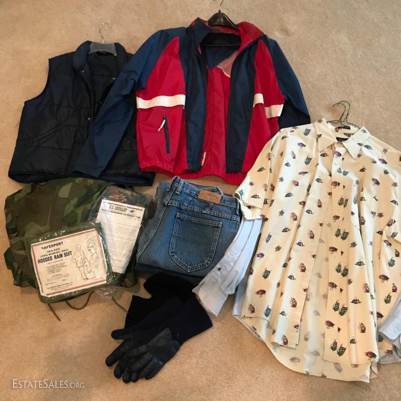 Mens clothing, large Woolrich jacket, medium Sears sleeveless puffer jacket, xl Gant fly fishing shirt, camo hooded parka and pants, (one still in plastic) wool gloves and more. Please note--Jeans are NOT included in this lot.