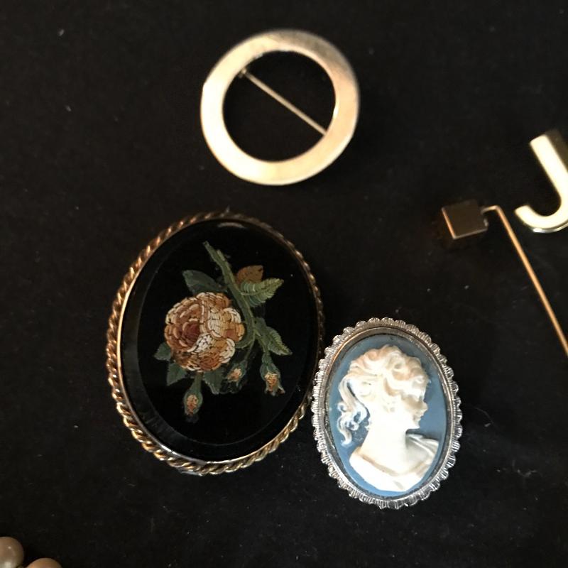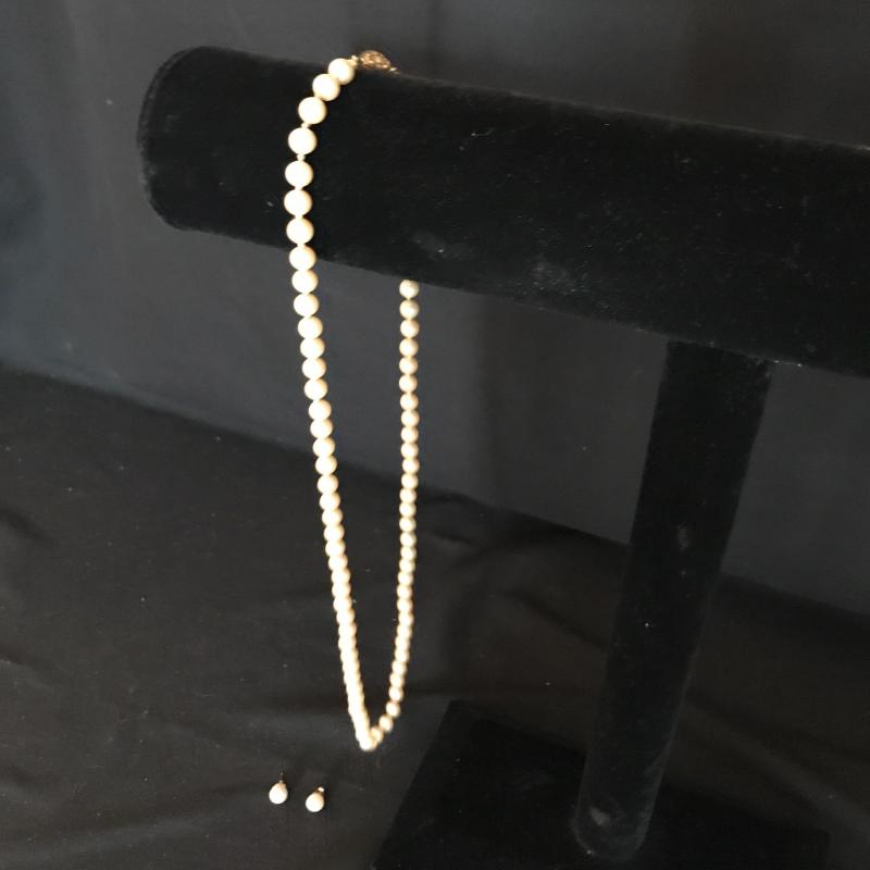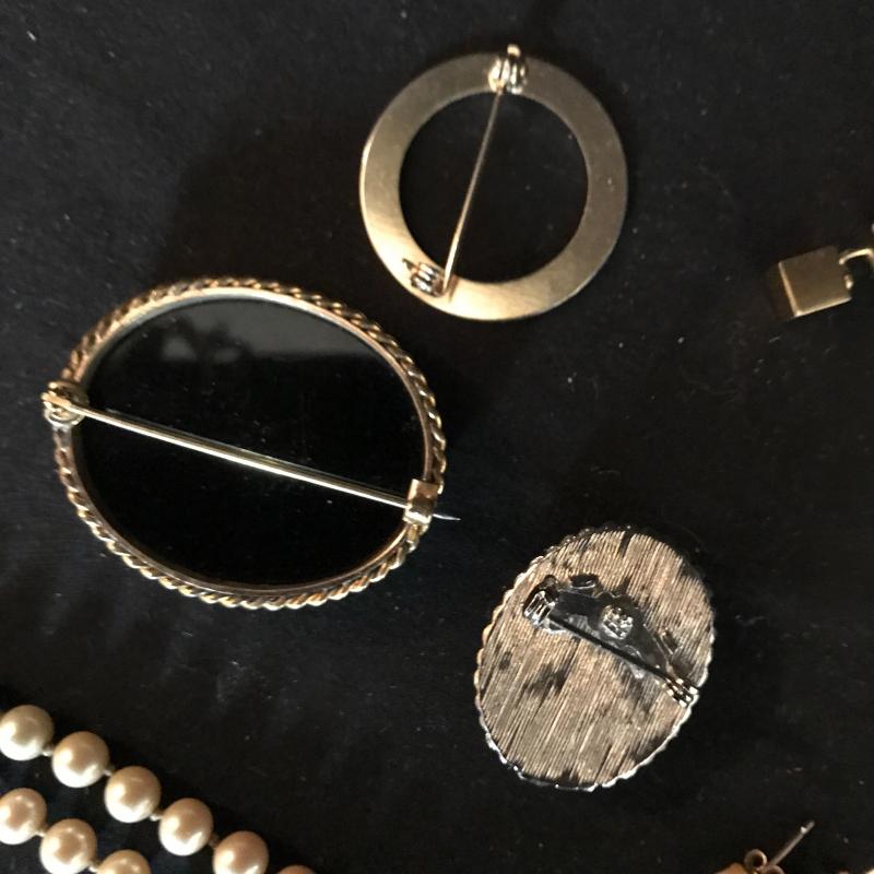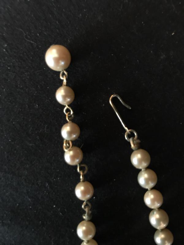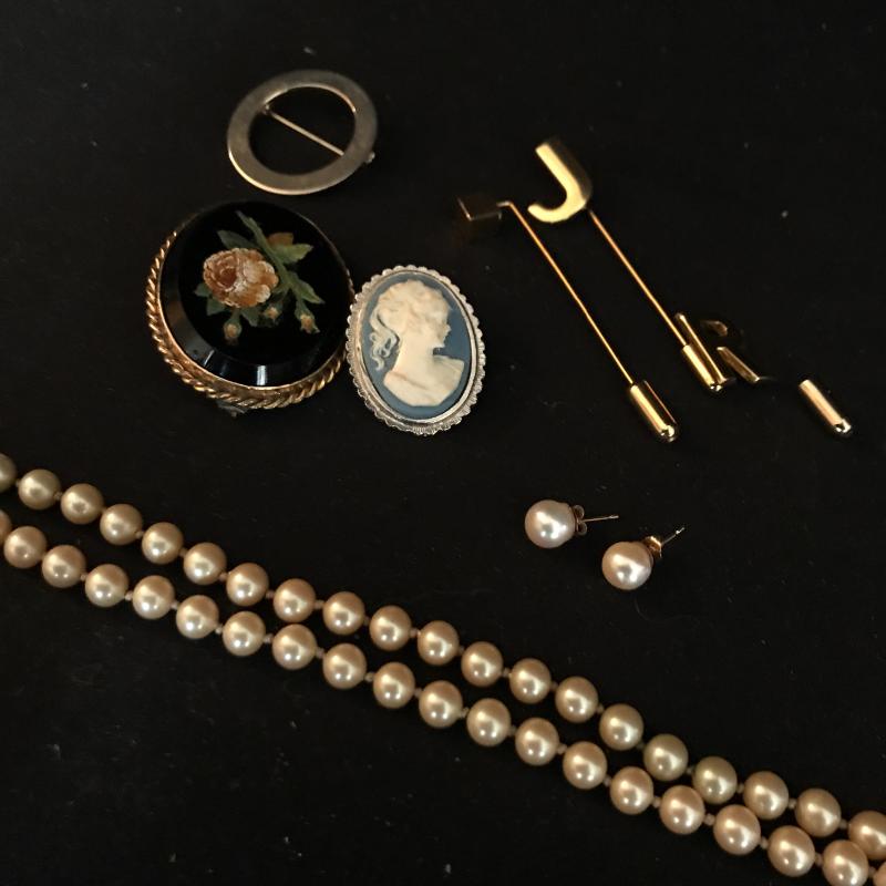 One pearl necklace is 24” long and the other is 17” long. Includes matching earrings. Seem to be authentic pearls but can not verify. Lot also includes several pins. See photos. Shipping or local pick up in Flat Rock, NC.