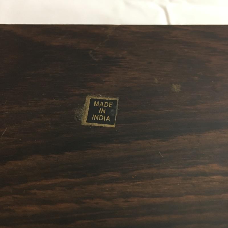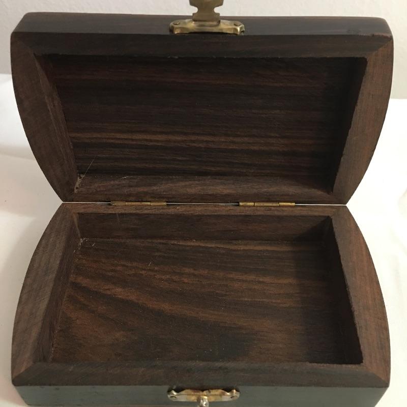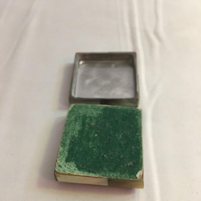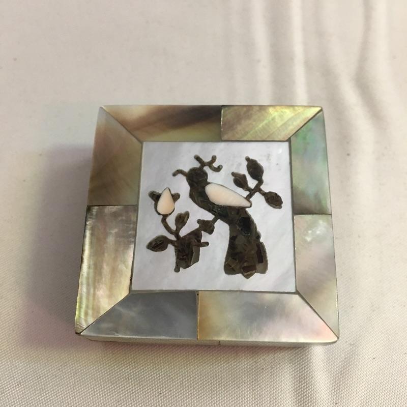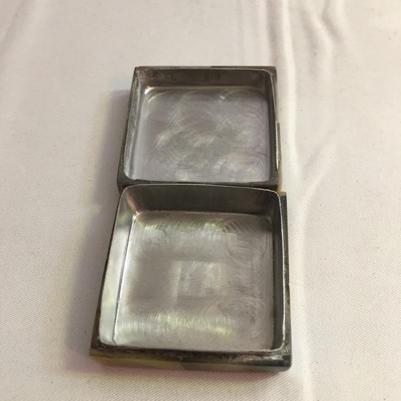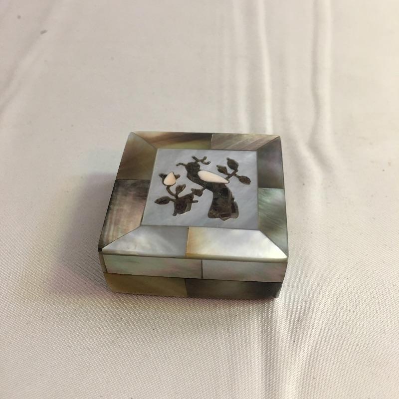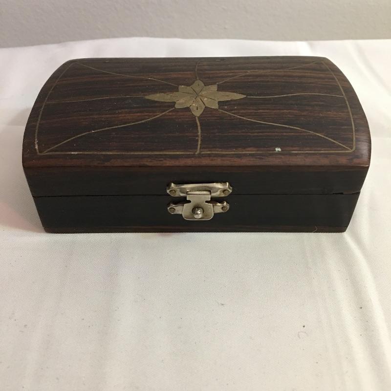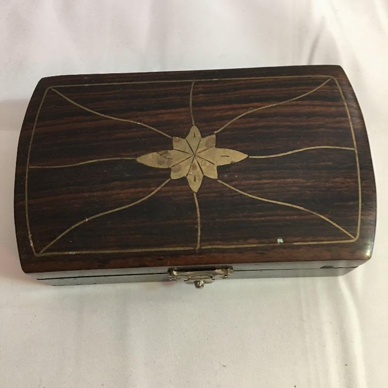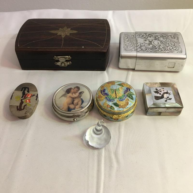 includes wooden box with inlaid brass, made in India, four pill boxes, silver metal cigarette case and a clear glass decorative drop. Box measures 3” x 5” x 1.25”.