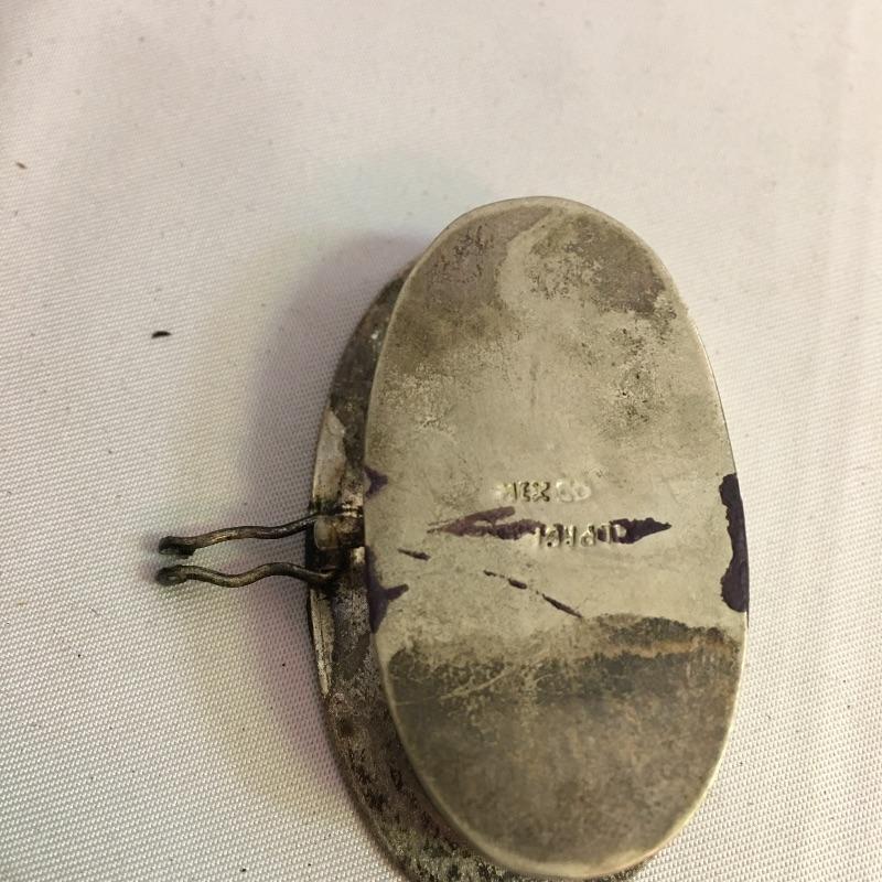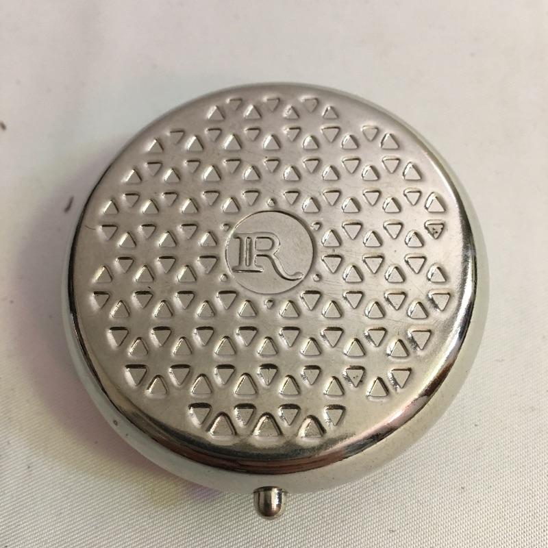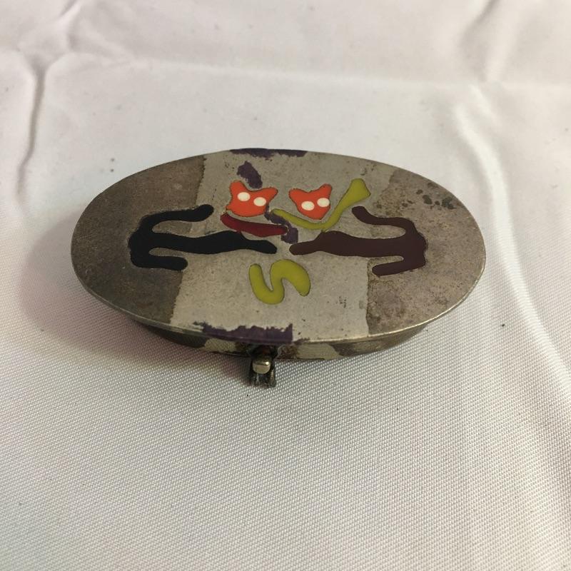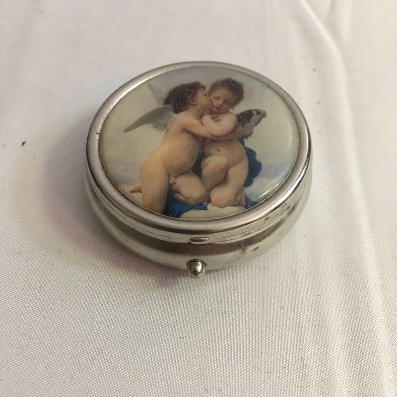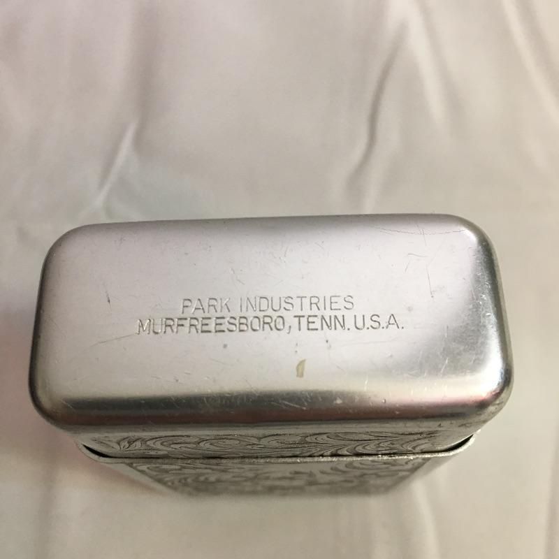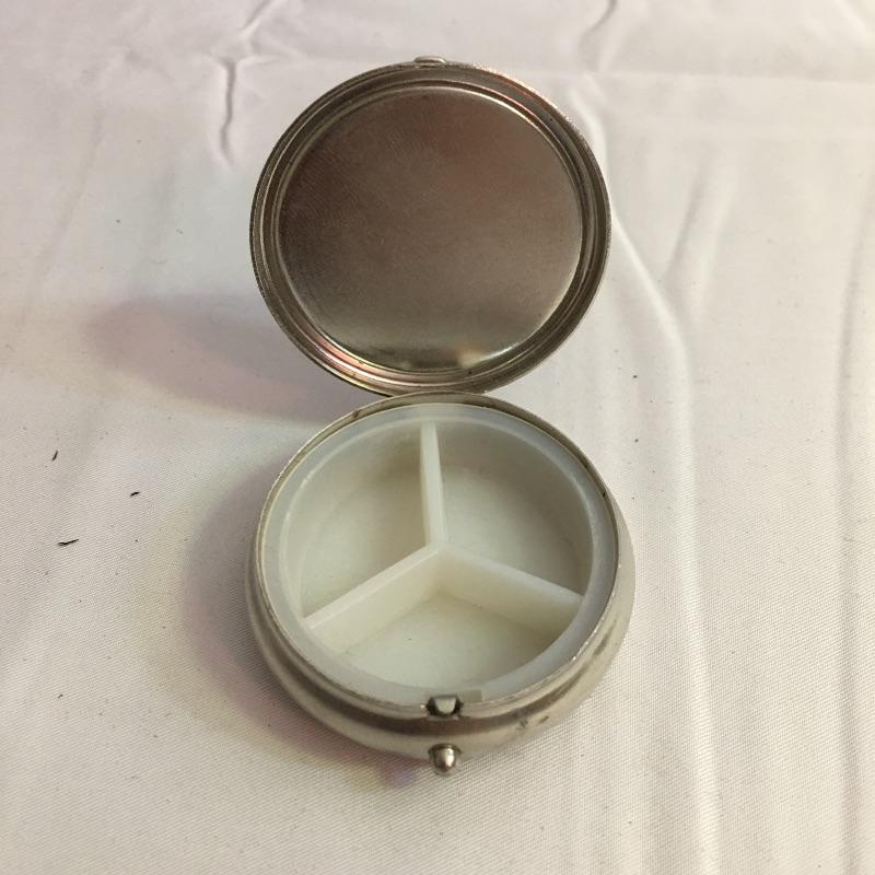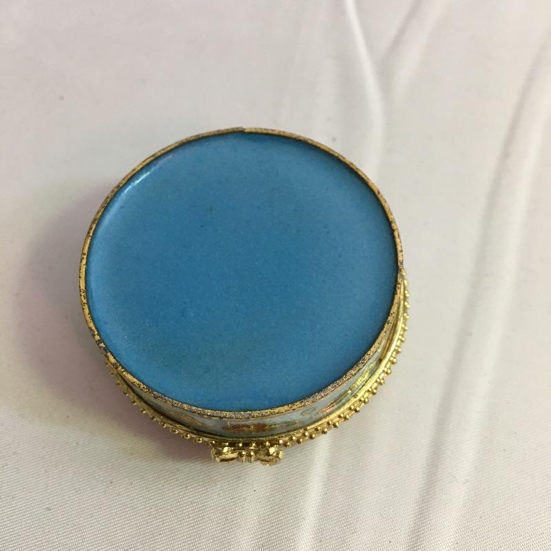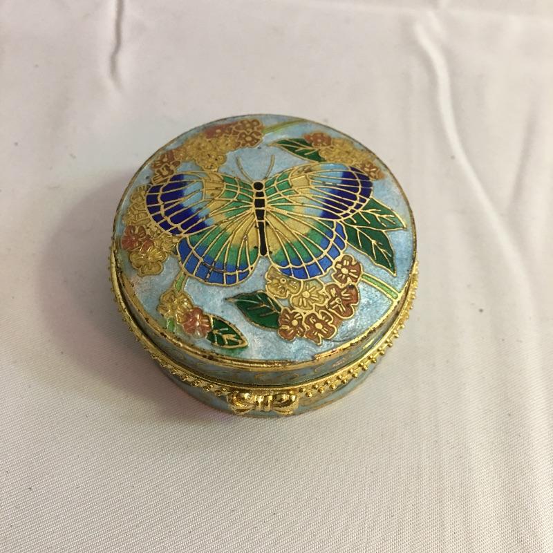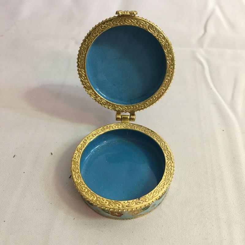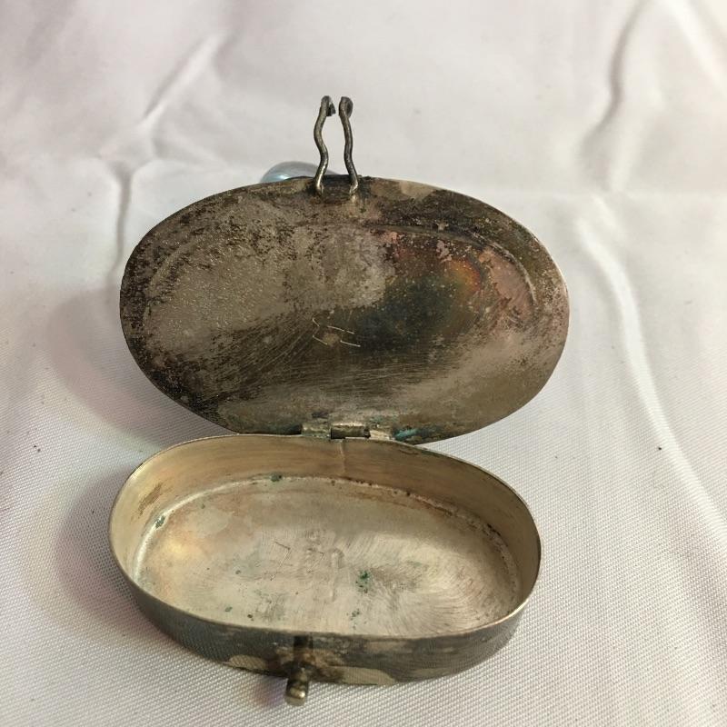 includes wooden box with inlaid brass, made in India, four pill boxes, silver metal cigarette case and a clear glass decorative drop. Box measures 3” x 5” x 1.25”.