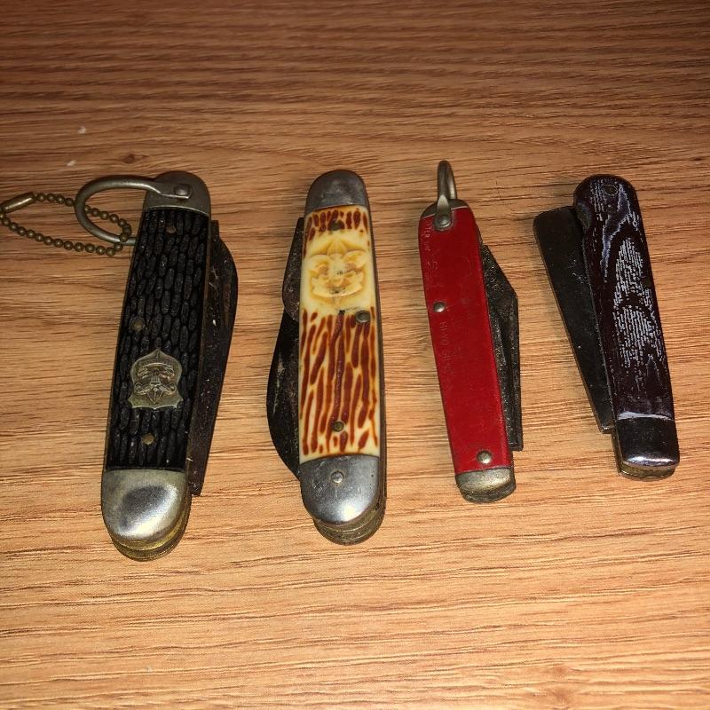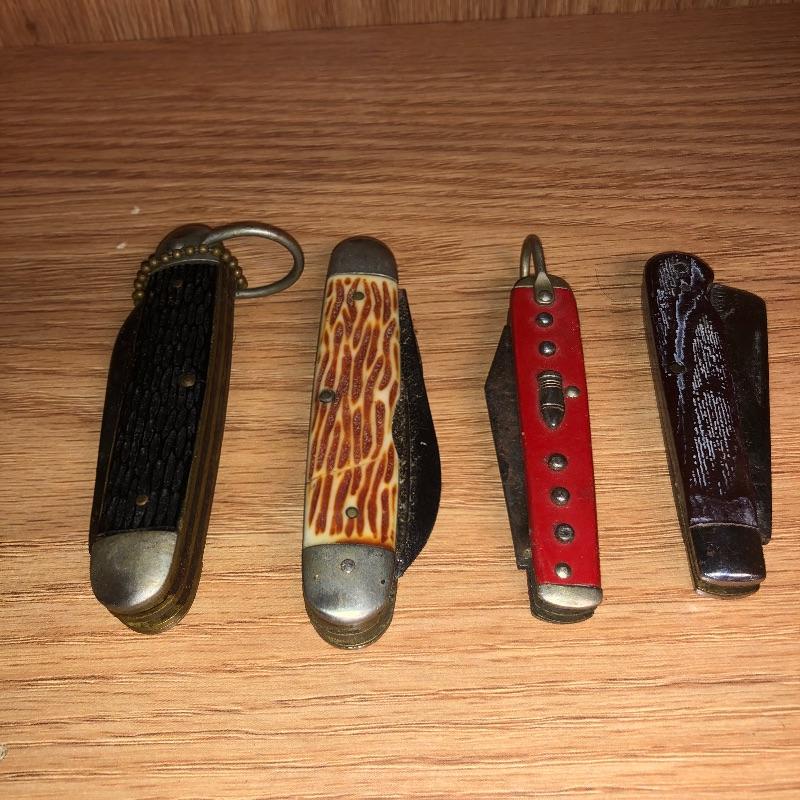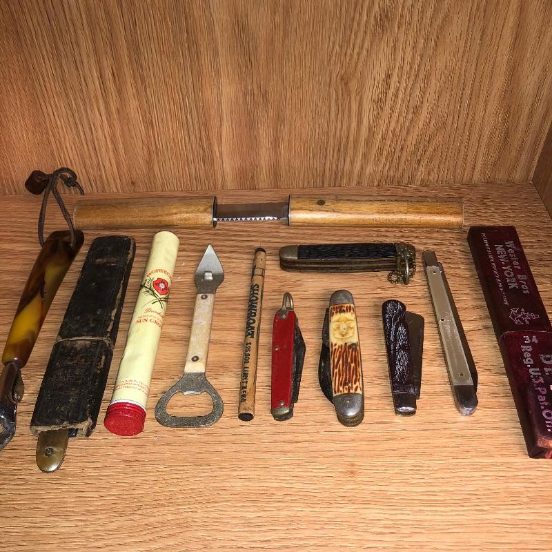 * Lot includes a variety of knives, tools, and more! This handy lot has so many possibilities. Swiss Army knife, vintage shaving knives and more. Largest knife with case measures 9.5” in length. Shipping available.