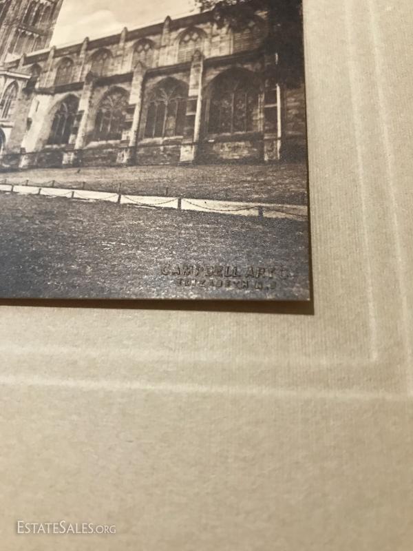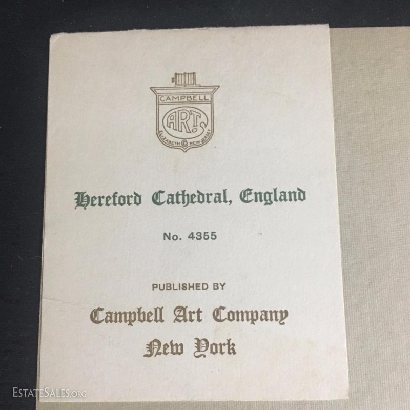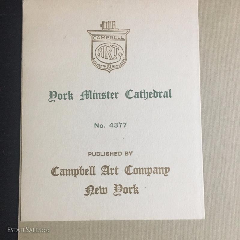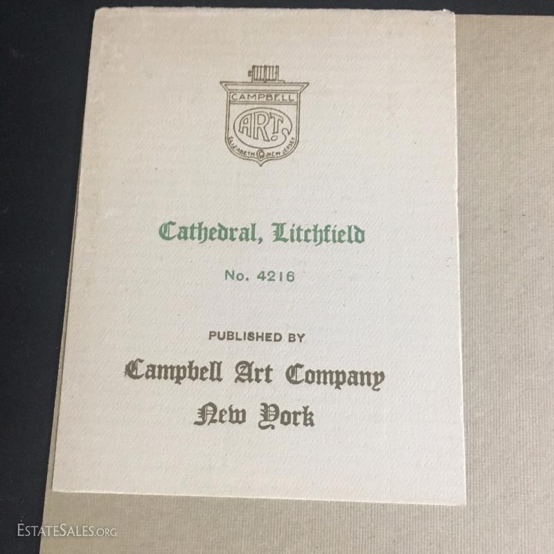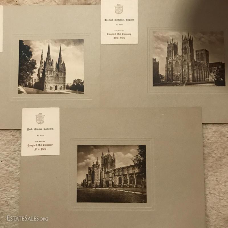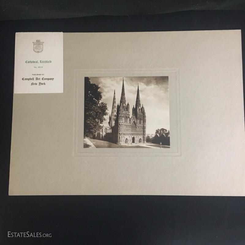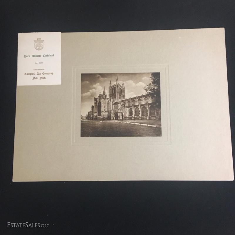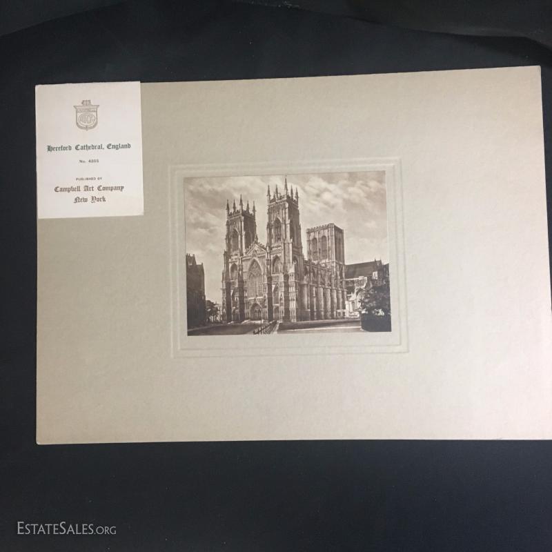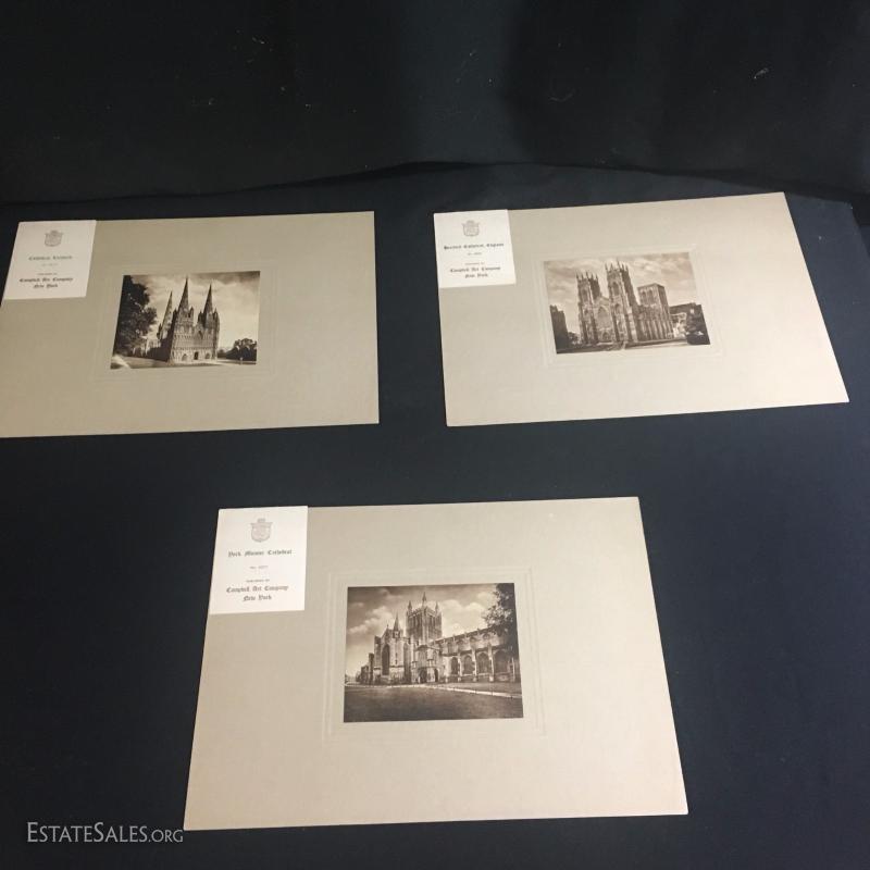 Three rare prints Published by Campbell Art Company in New York. Each comes with original mat and publisher's tag. All prints are embossed on bottom right hand corner with "Campbell Art Co". This lot has three prints and includes "Cathedral Litchfield No. 4216", "Hereford Cathedral England No. 4355", and "Dork Minister Cathedral No. 4377". All are 14"l x 10"w matted.