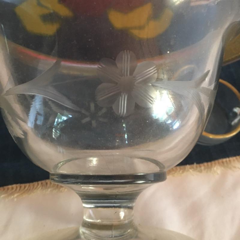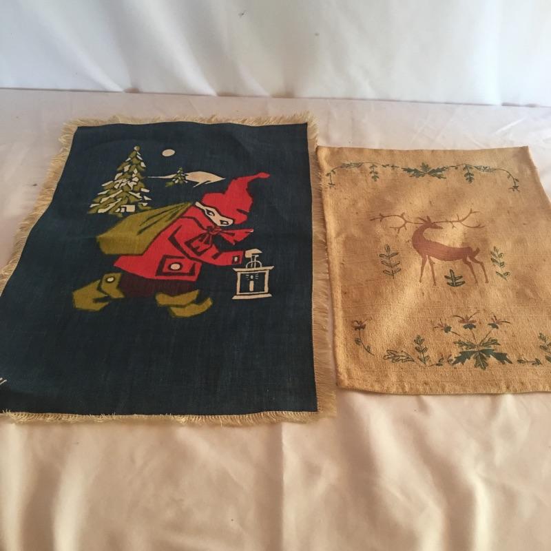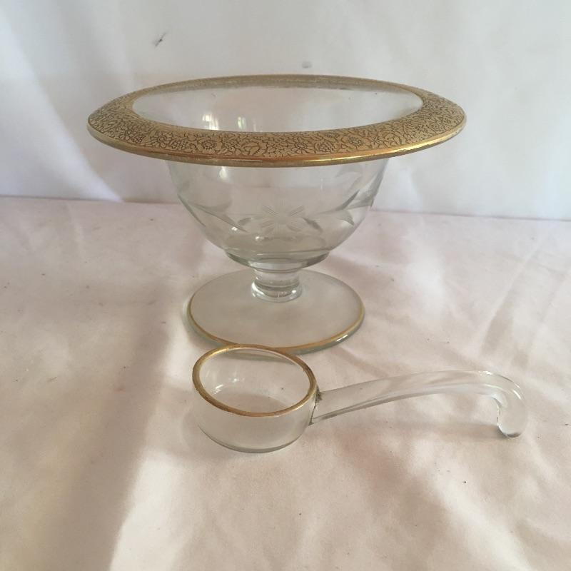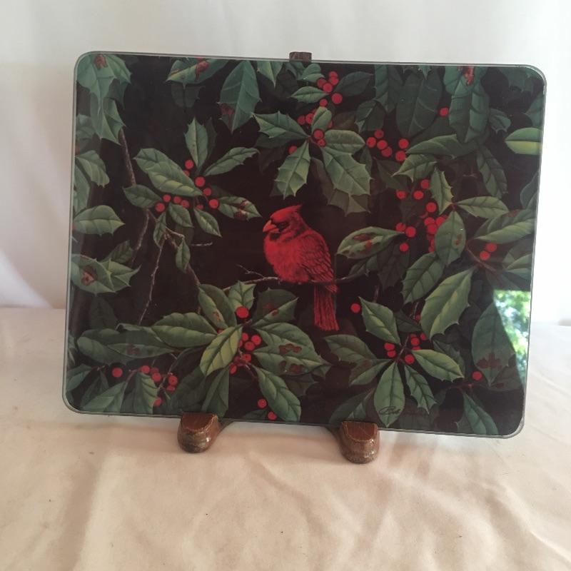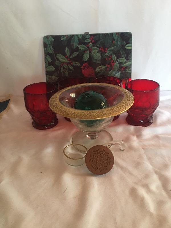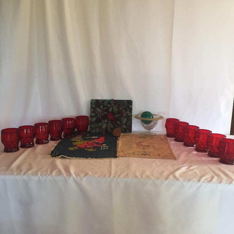 This lot includes twelve red rocks glasses, hand blown green glass ball, gold rimmed etched glass dish with serving spoon, cutting board with cardinal two cloths and a snowflake cookie stamp.