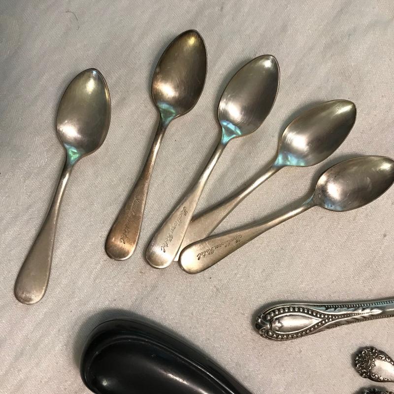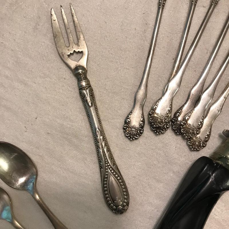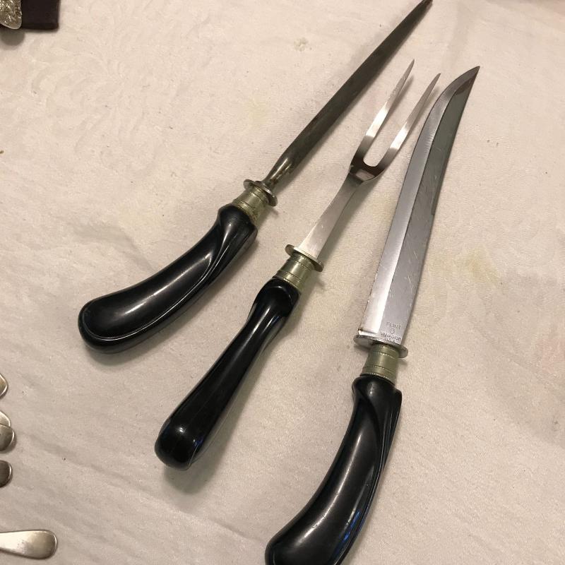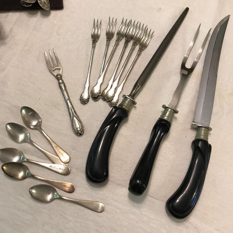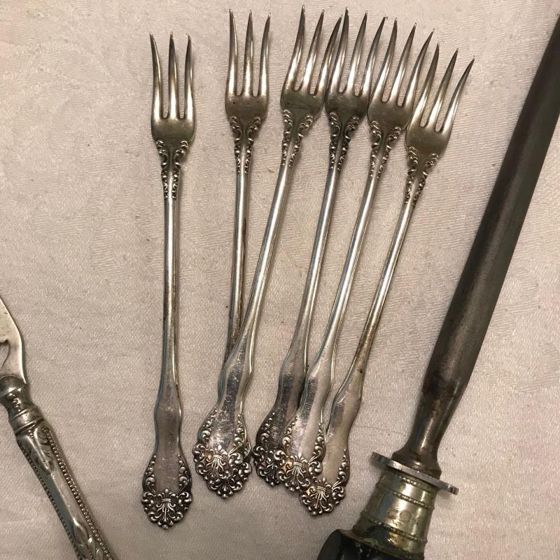 Nice lot of serving pieces including oyster forks and carving set . These are not sterling but make a nice addition to your party. Shipping Available.