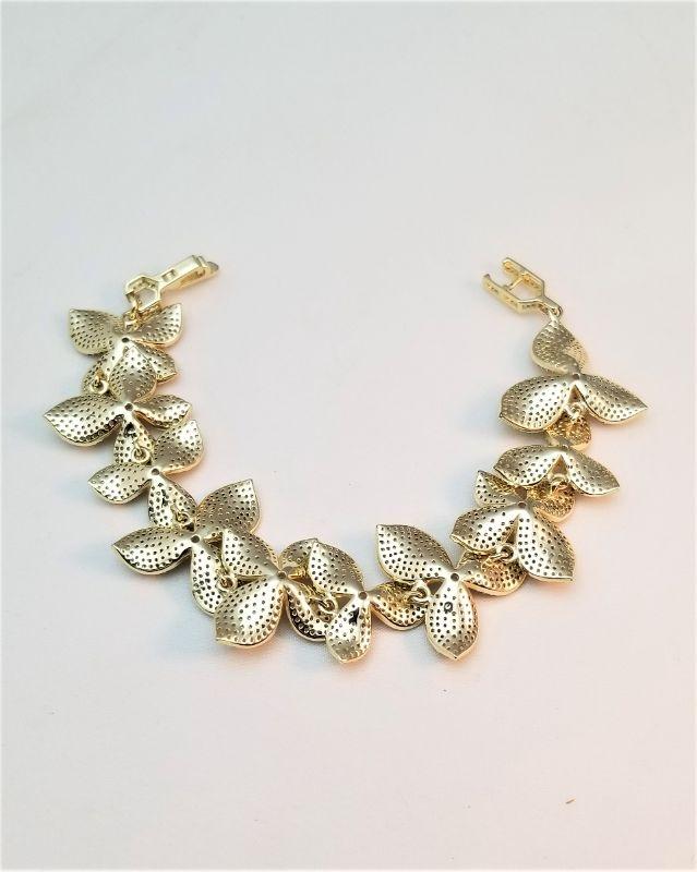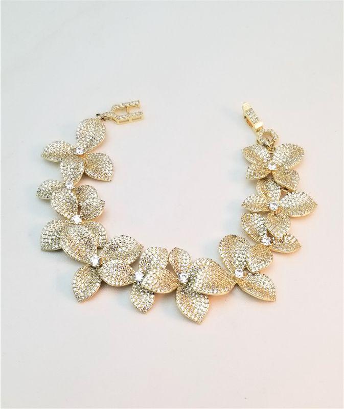 So pretty and delicate - sterling silver overlaid with gold plating - floral design - set with many small sparkly cz's. Measures about 7.25" long counting the clasp. Quality construction. Weighs 1.03 ounces.