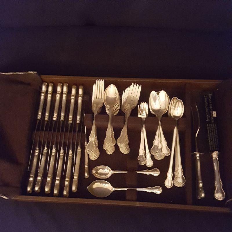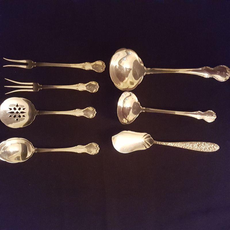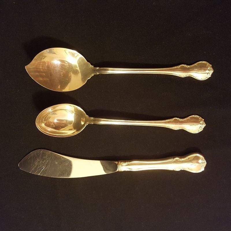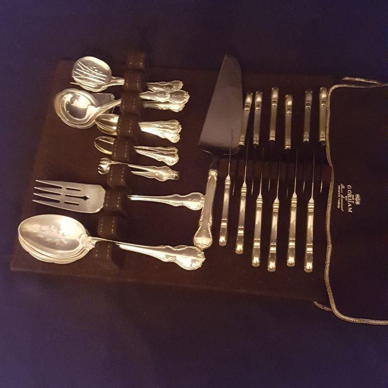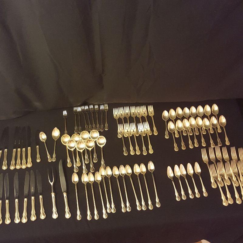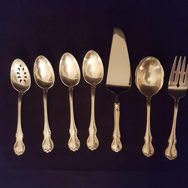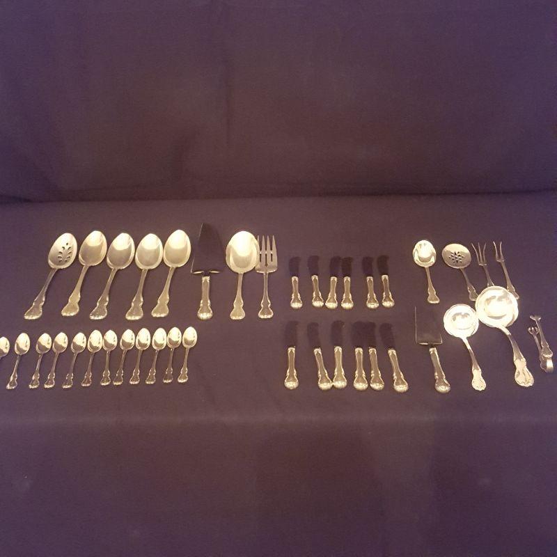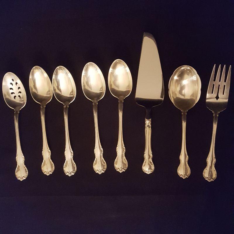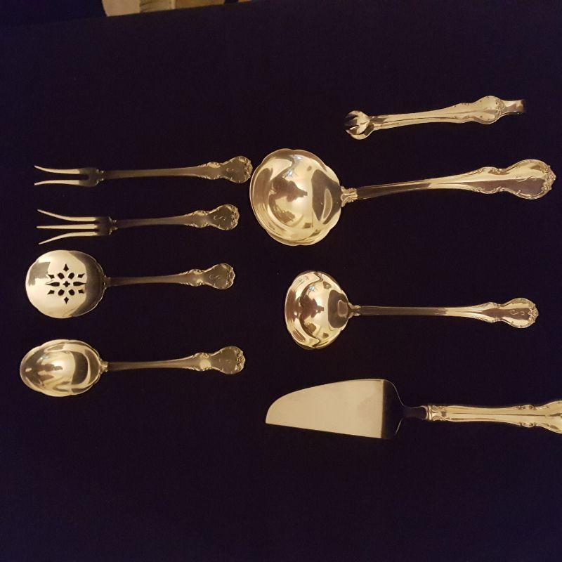 The smaller set pictured, but belongs with the dinner set contains, 6 serving spoons, 2 pie serving pieces, 2 ladles, ice tongs, 12 small spoons, 12 small knives, a serving fork, a lemon fork and a butter pick. Starting price based on Sterling melt value.
