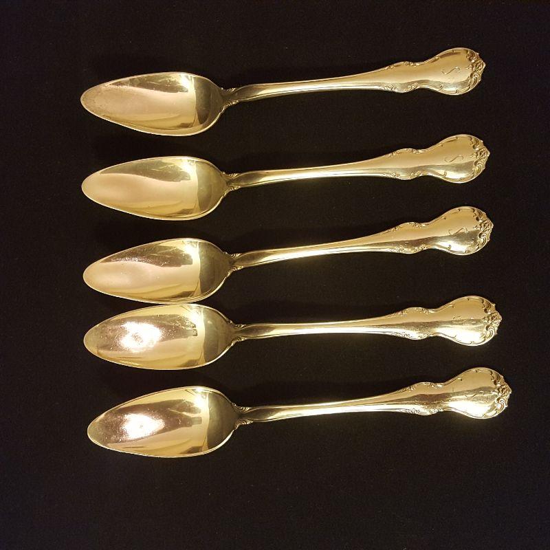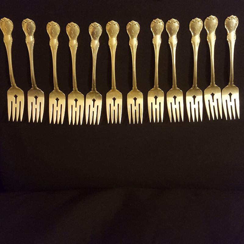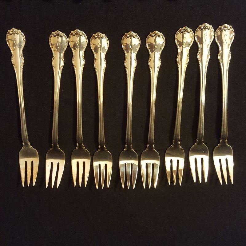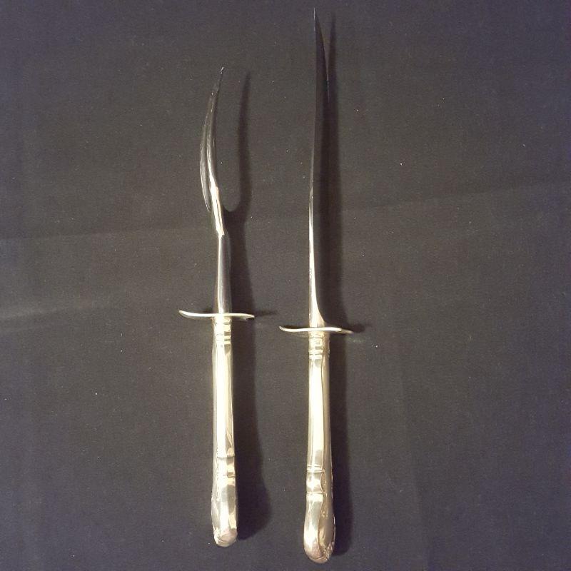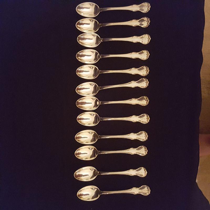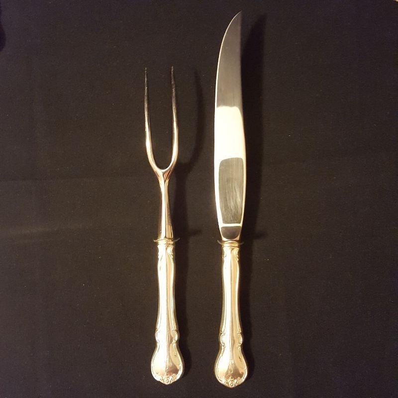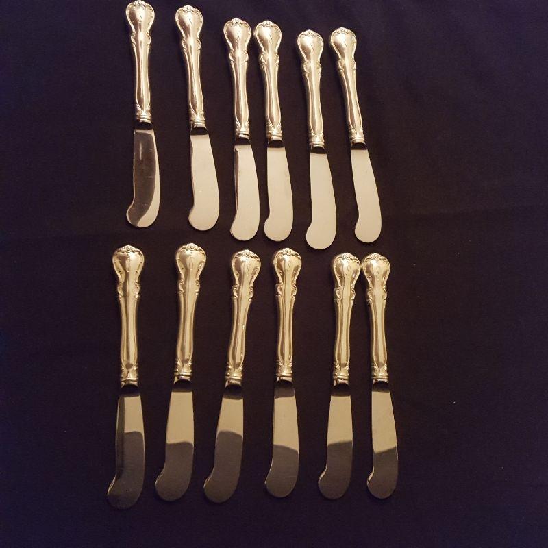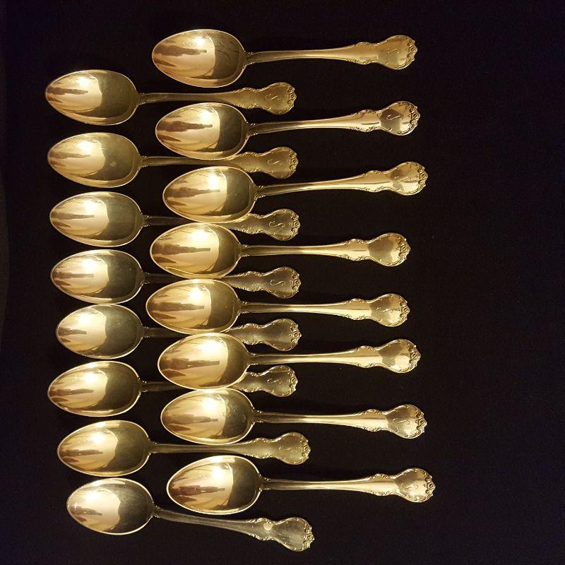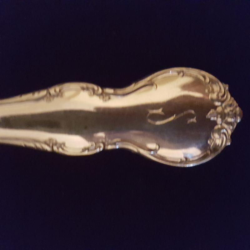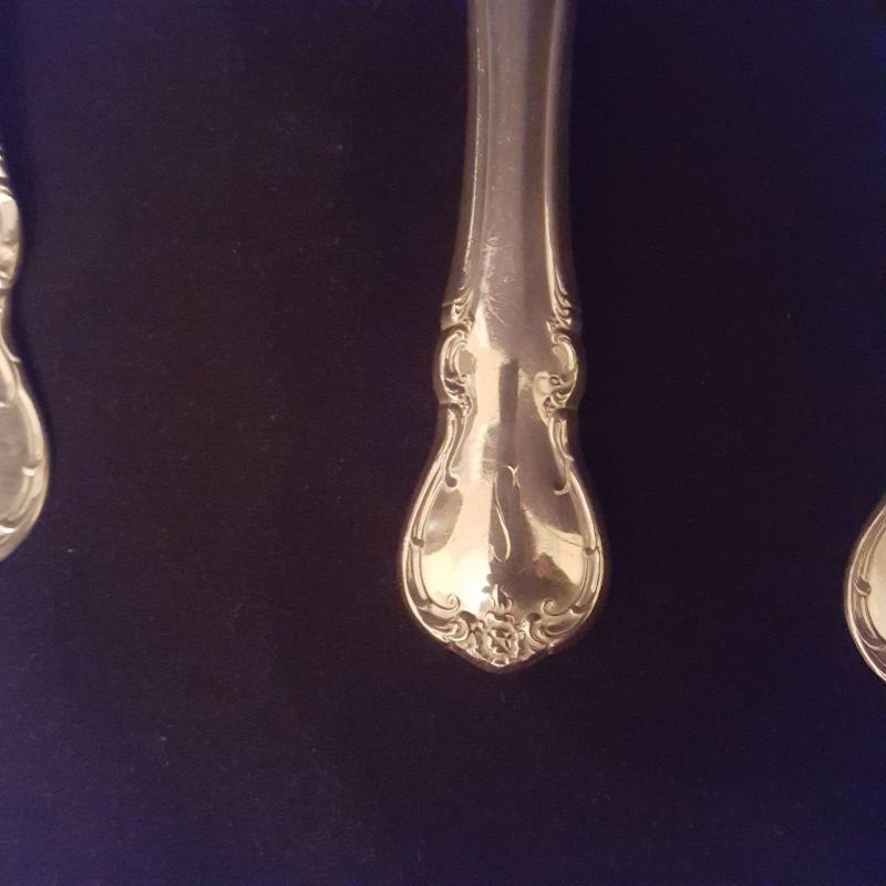 The smaller set pictured, but belongs with the dinner set contains, 6 serving spoons, 2 pie serving pieces, 2 ladles, ice tongs, 12 small spoons, 12 small knives, a serving fork, a lemon fork and a butter pick. Starting price based on Sterling melt value.