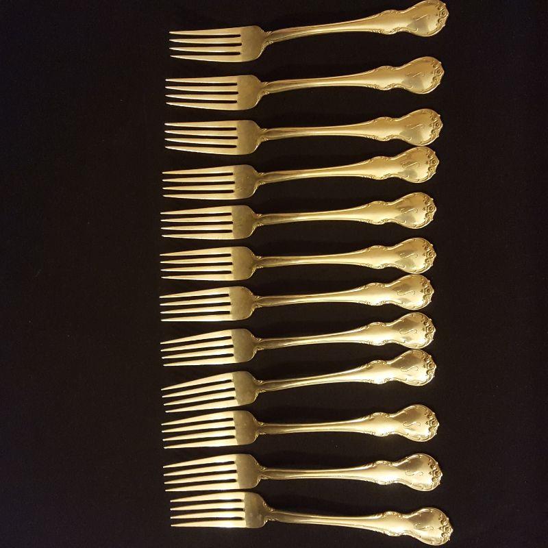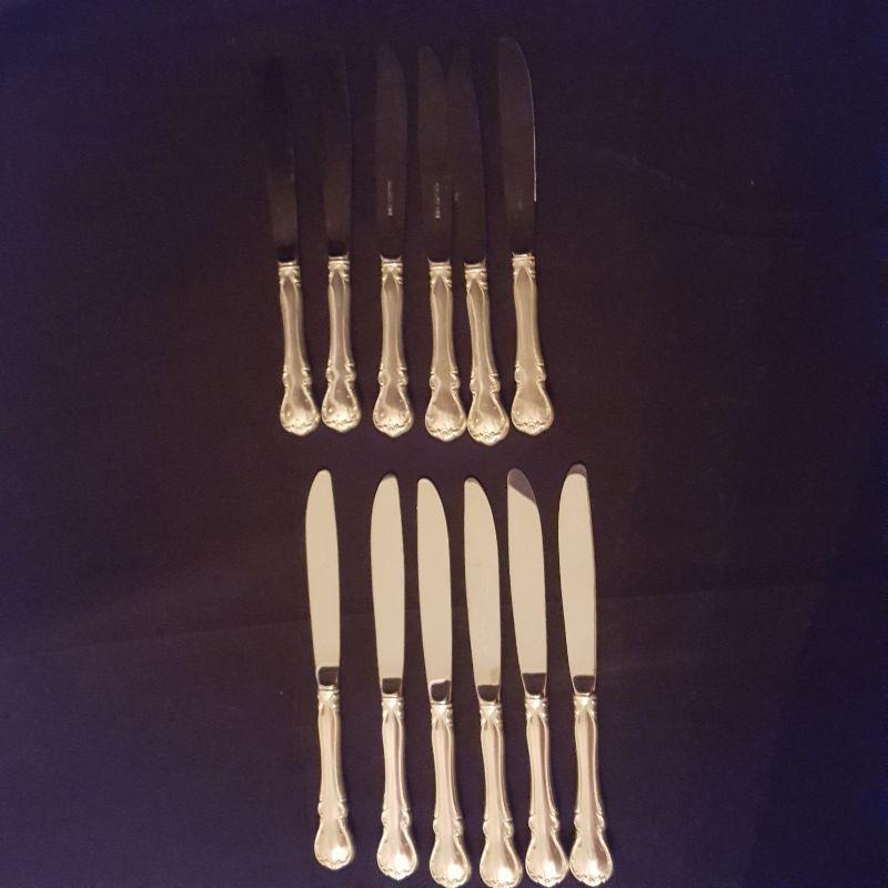 The dinner set comes with 12 knives, 1 butter knife, 9 shrimp forks, 8 soup spoons, 12 long desert spoons, 12 salad forks, 5 long spoons, 12 forks and 2 other spoons.