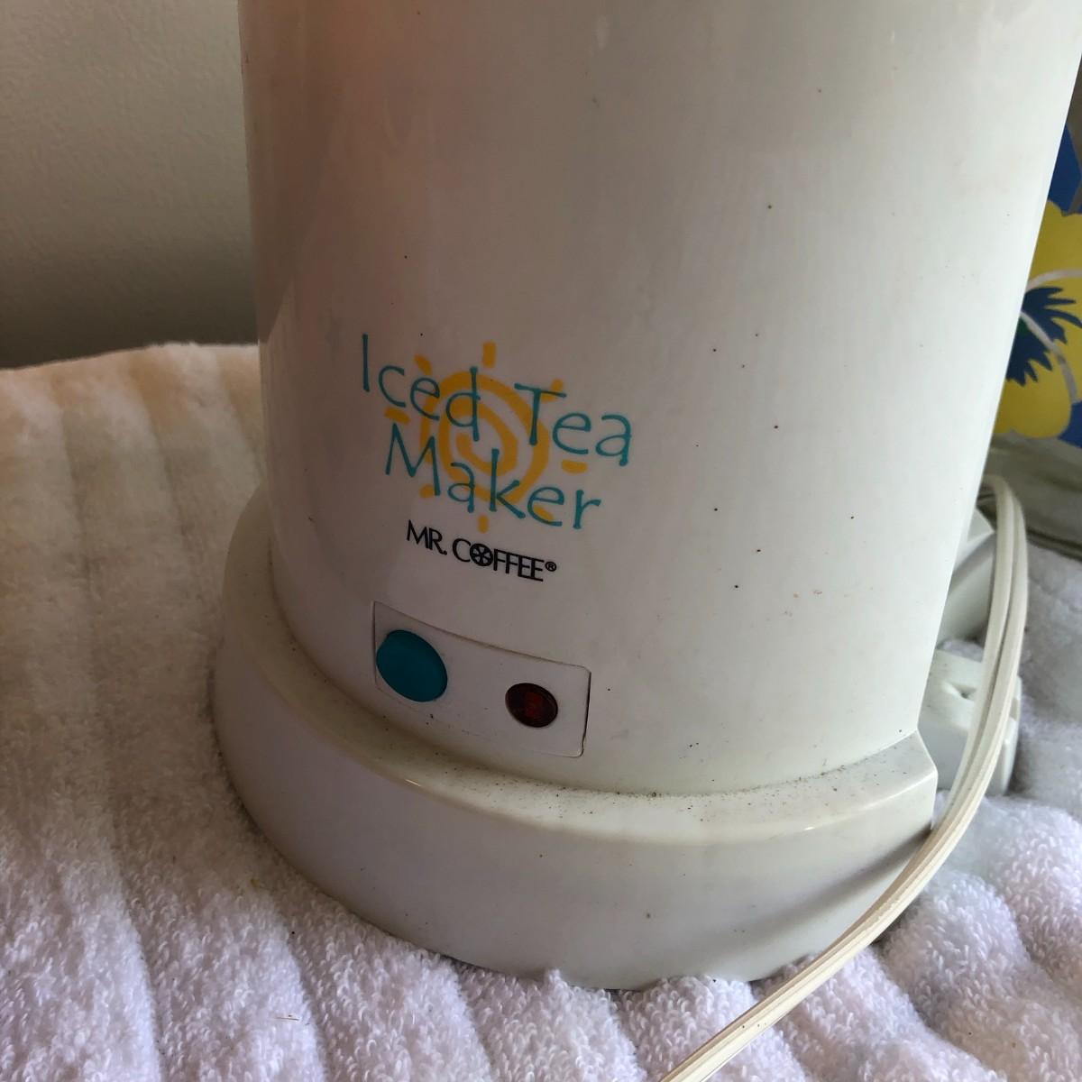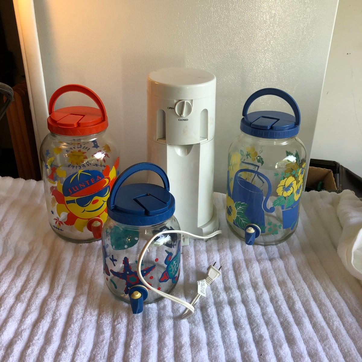 There is a Mr. Coffee Iced Tea maker and three glass drink dispensers.
