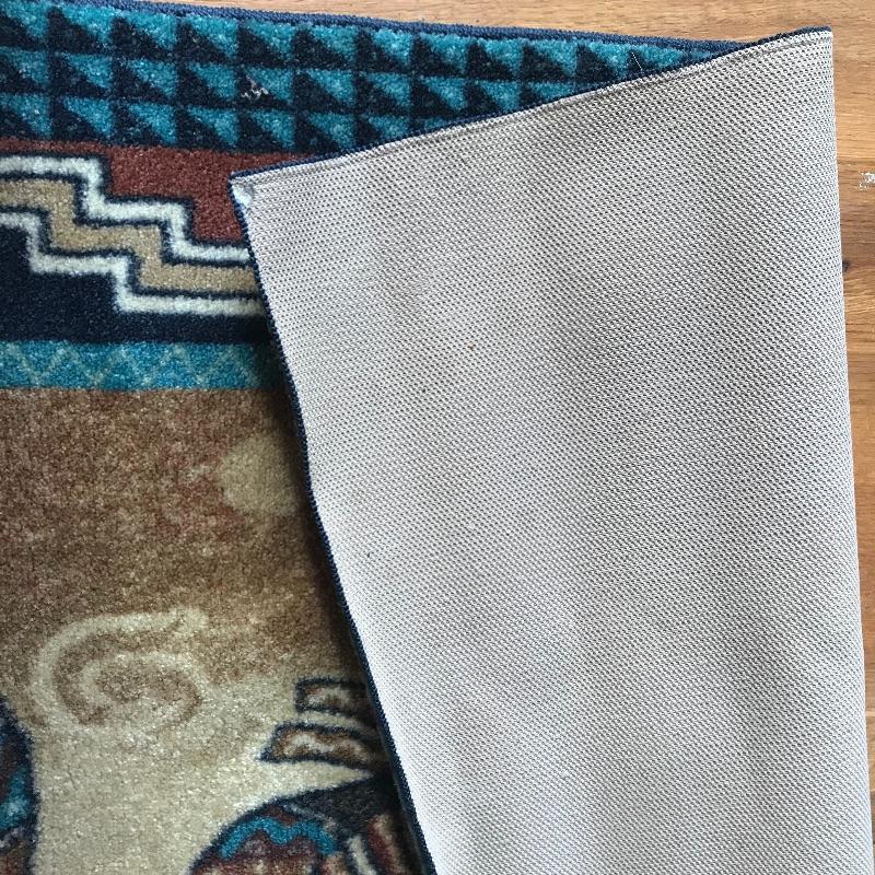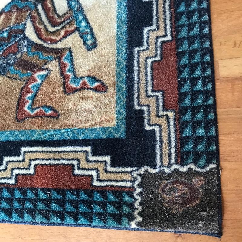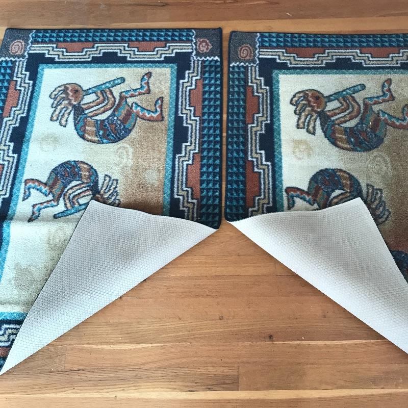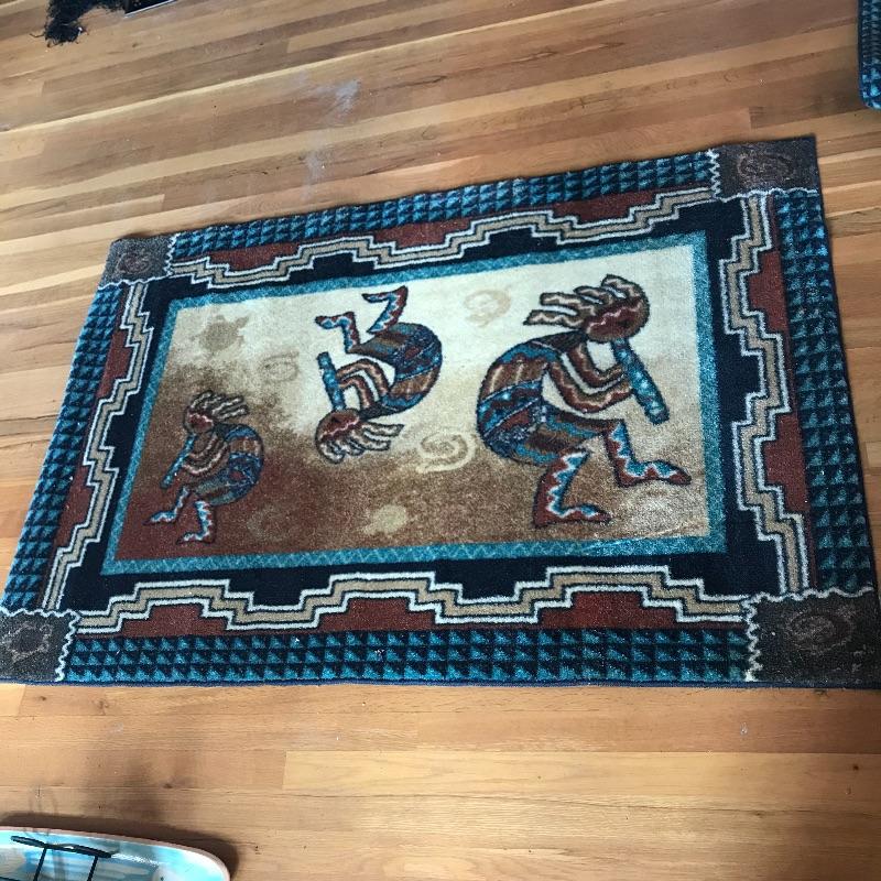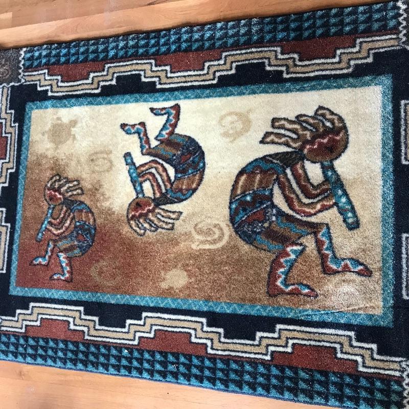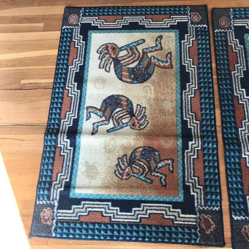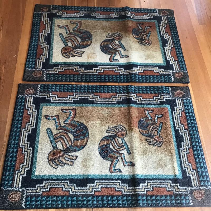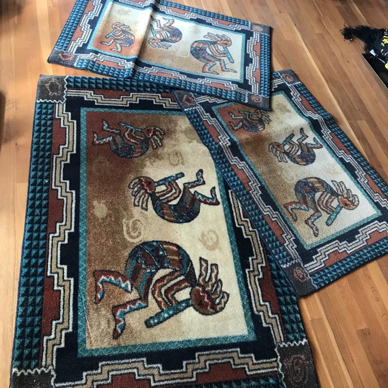 Three matching non-slip Kokopelli rugs. The largest rug measures approximately 40” x 60” and the two smaller accent rugs are about 30” x 46”. Rugs need a good cleaning but appear in great shape over all. Local pick up only.