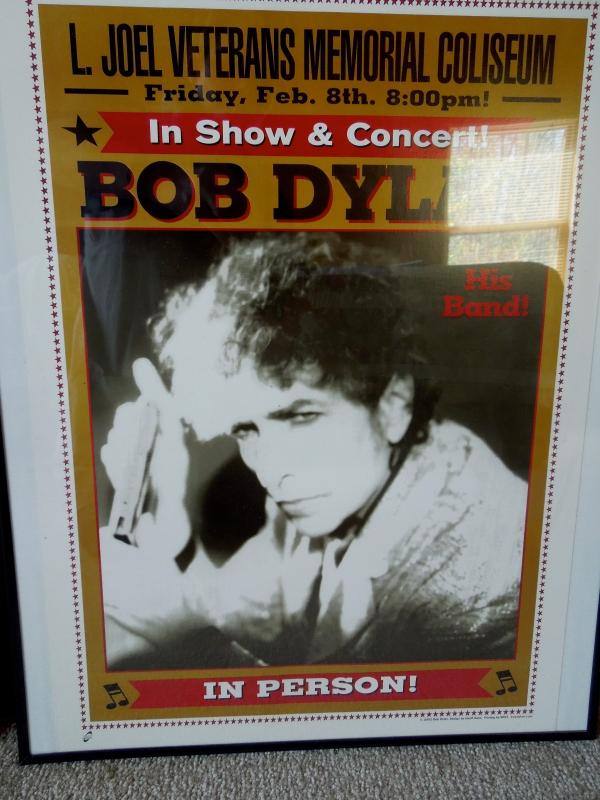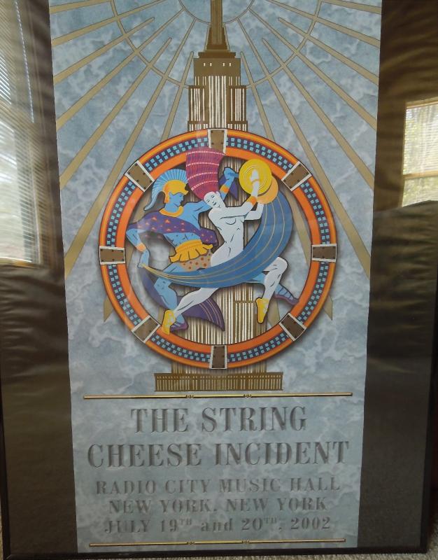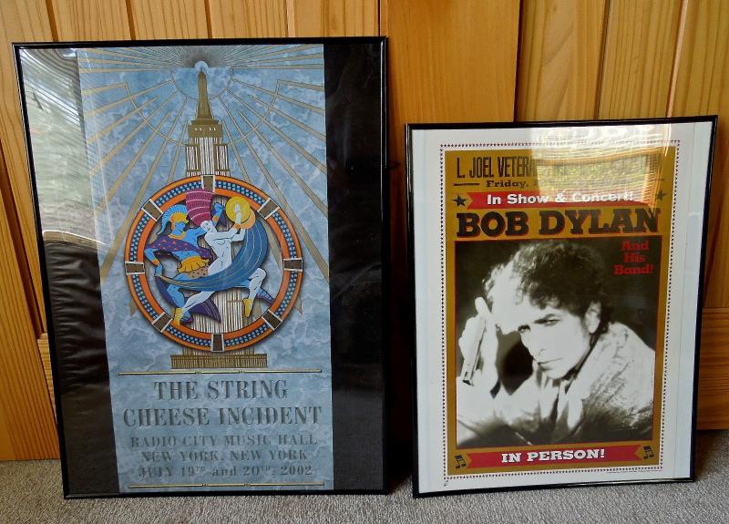 Plexiglass frame. 2002 Bob Dylan at Veteran's Memorial Coliseum 20" x 16" . 2002 String Cheese Incidentt 24" x 18". No scratches or cracks.