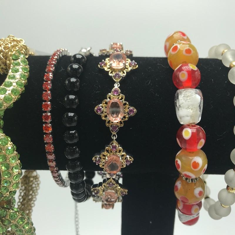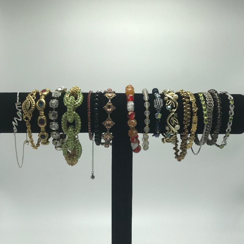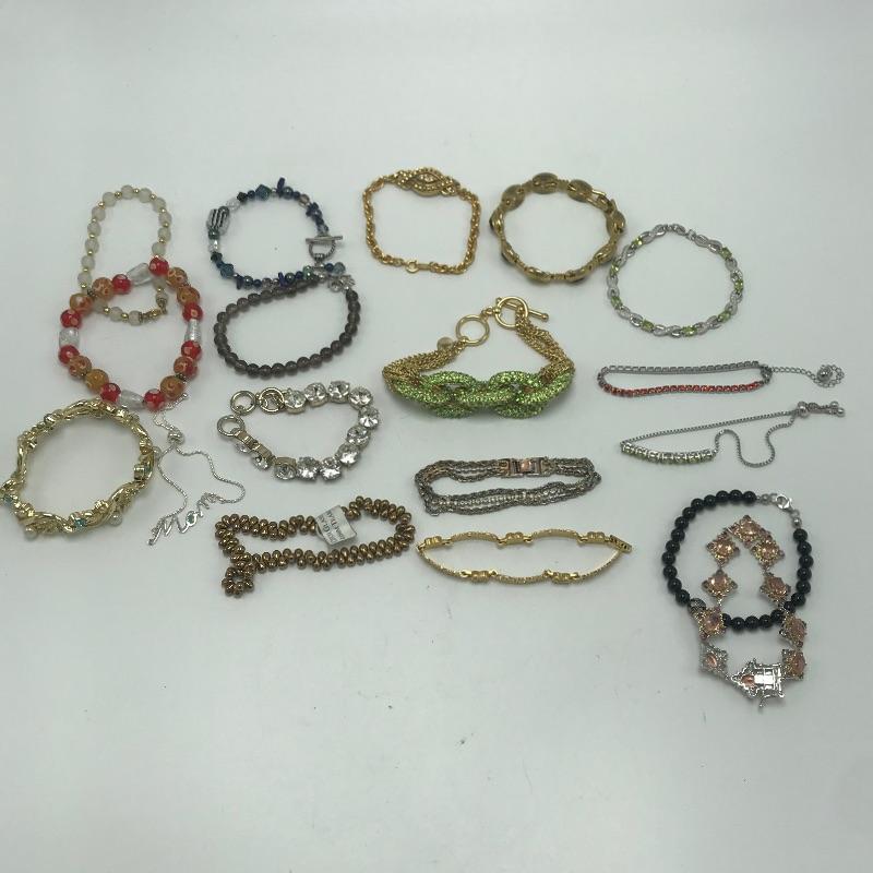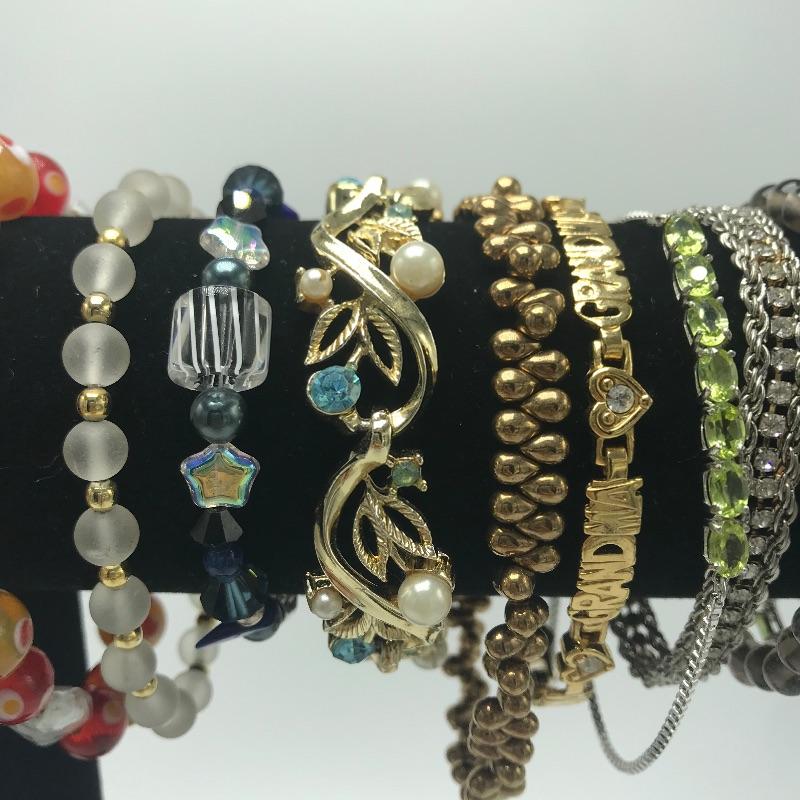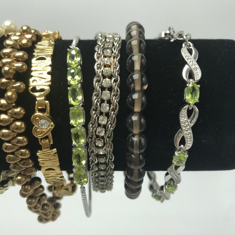 Over fifteen bracelets for a variety of looks. Most have clasps, just a couple are stretch bracelets. Three bracelets total are marked 925, see photos. “Mom” bracelet is marked STS and 925. Other materials appear to be glass bronze teardrop beads, more blown glass style beads, precious gems and such appearing like peridot, aquamarine and pearl. One bracelet is missing a stone, see photos.