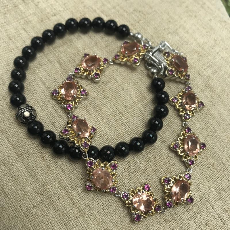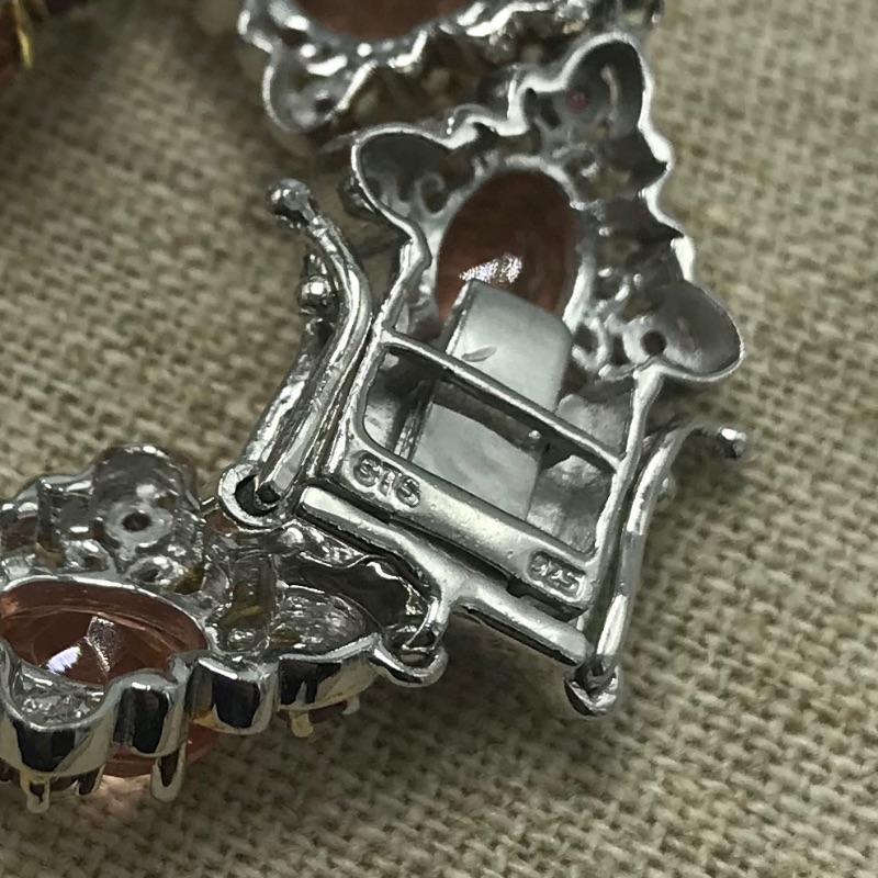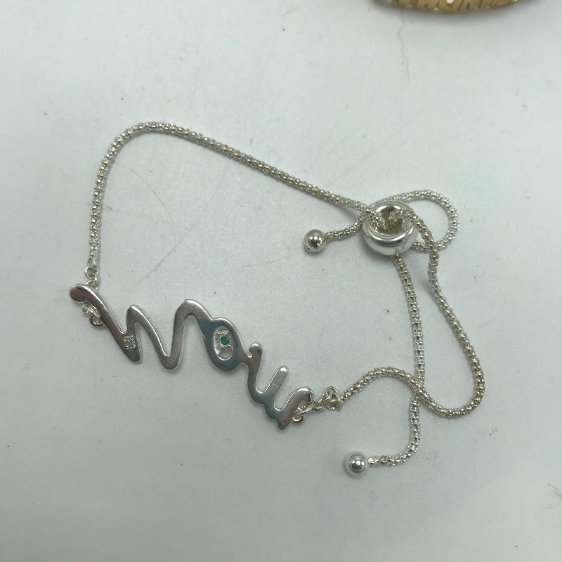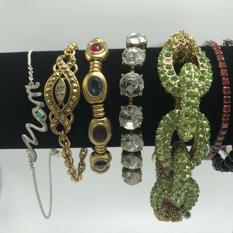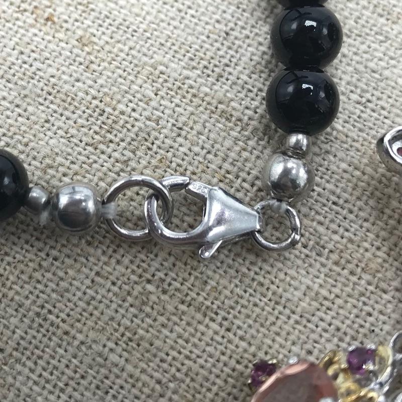 Over fifteen bracelets for a variety of looks. Most have clasps, just a couple are stretch bracelets. Three bracelets total are marked 925, see photos. “Mom” bracelet is marked STS and 925. Other materials appear to be glass bronze teardrop beads, more blown glass style beads, precious gems and such appearing like peridot, aquamarine and pearl. One bracelet is missing a stone, see photos.
